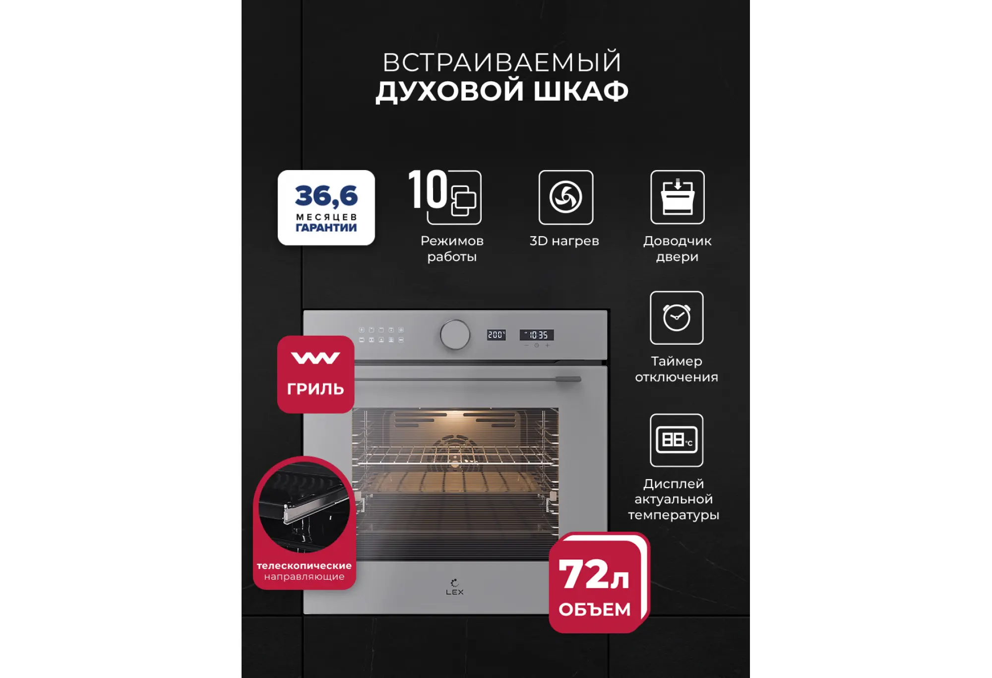 Встраиваемый электрический духовой шкаф LEX EDM 1002 ONE GR в сером цвете рассчитан на установку в стандартную нишу и органично впишется в современный кухонный гарнитур. Фасад выполнен из стекла, что придаёт аккуратный лаконичный внешний вид и облегчает уход за поверхностью. Стандартная ширина 60 см и размеры для встраивания 560×582–585×555 мм позволяют монтировать шкаф в большинстве типовых кухонь.