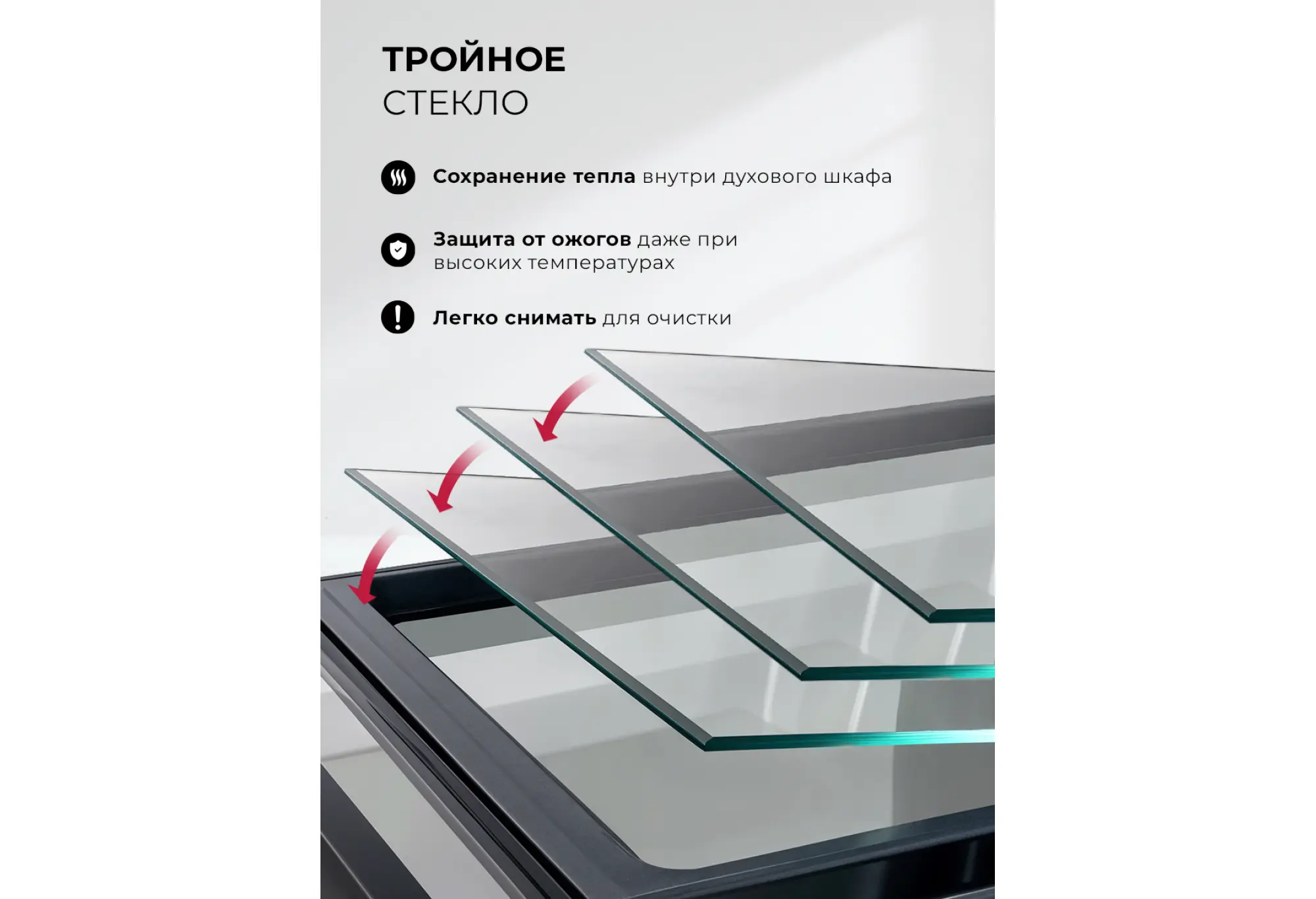 Дверца духовки имеет тройное остекление, что снижает нагрев внешней поверхности и улучшает теплоизоляцию. Внутреннее стекло легко вынимается, что удобно при очистке. Механизм плавного закрытия делает эксплуатацию более комфортной. Для дополнительной безопасности и защиты мебели используется тангенциальное охлаждение - воздушный поток помогает отводить тепло от корпуса.
