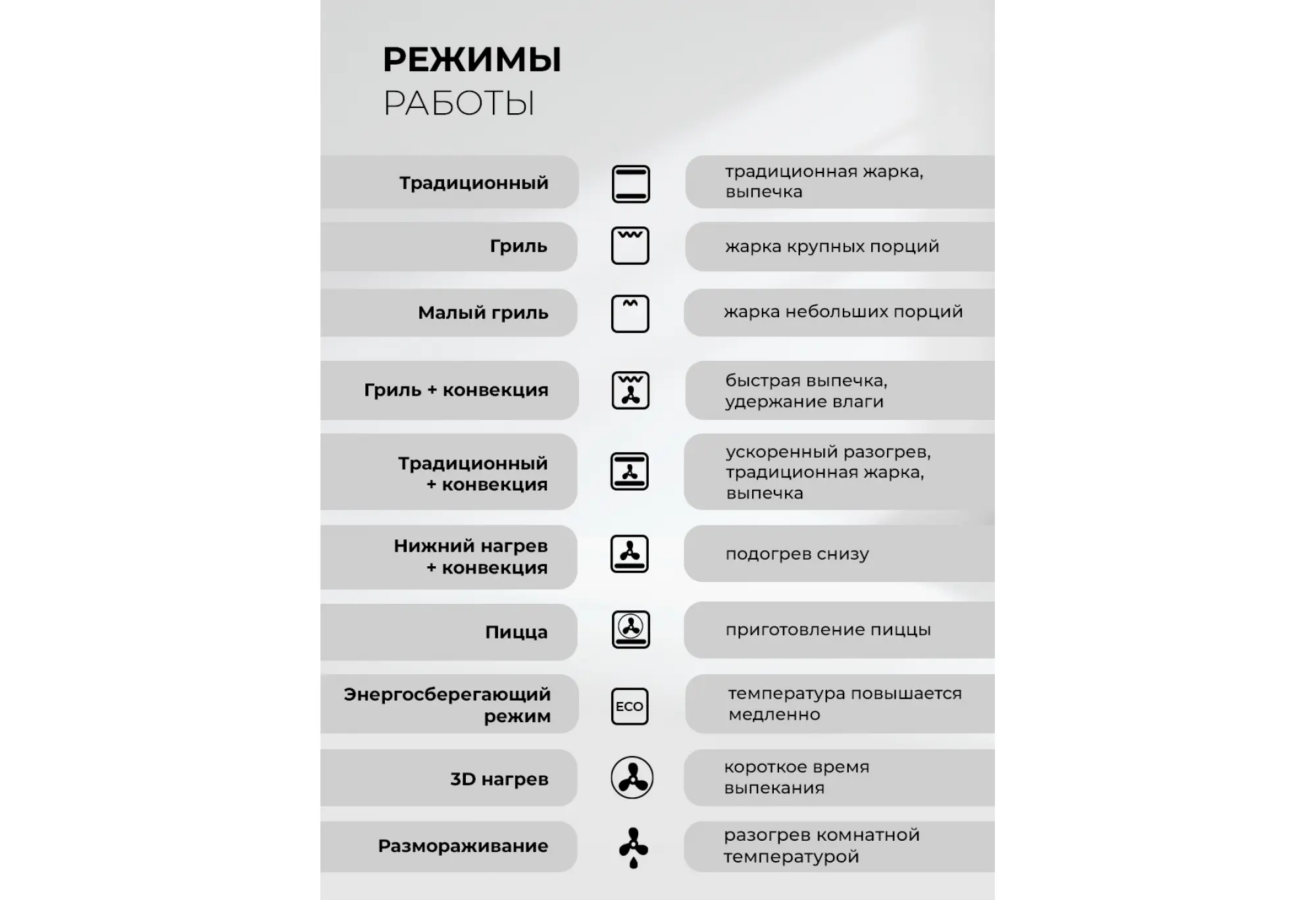 - Широкий выбор режимов, включая 3D‑конвекцию, гриль и «Пиццу»