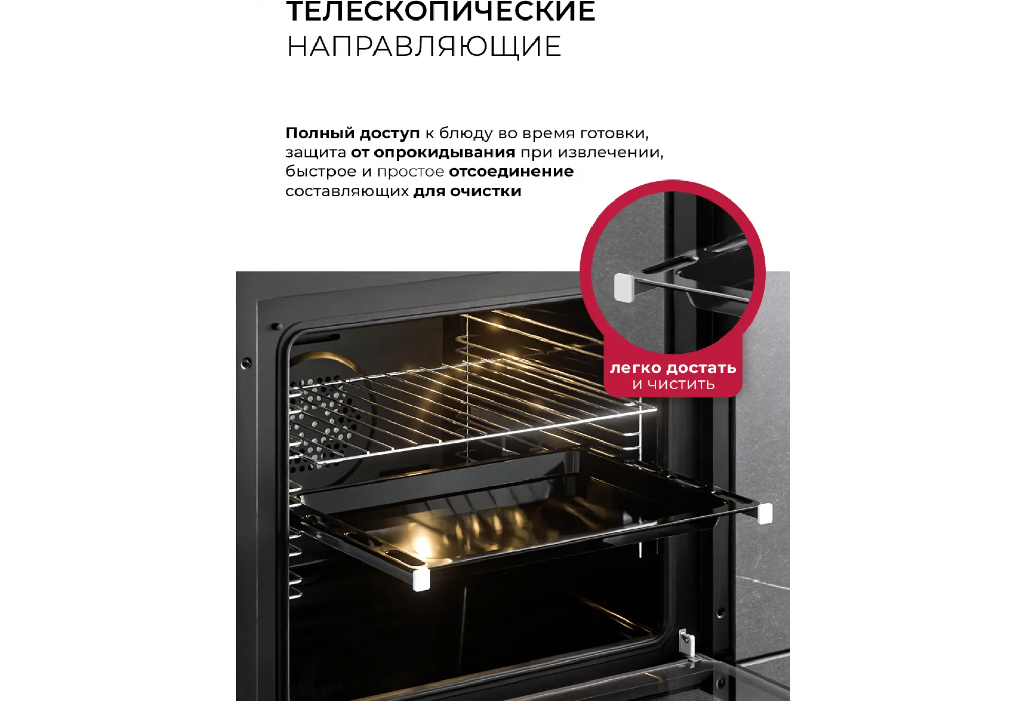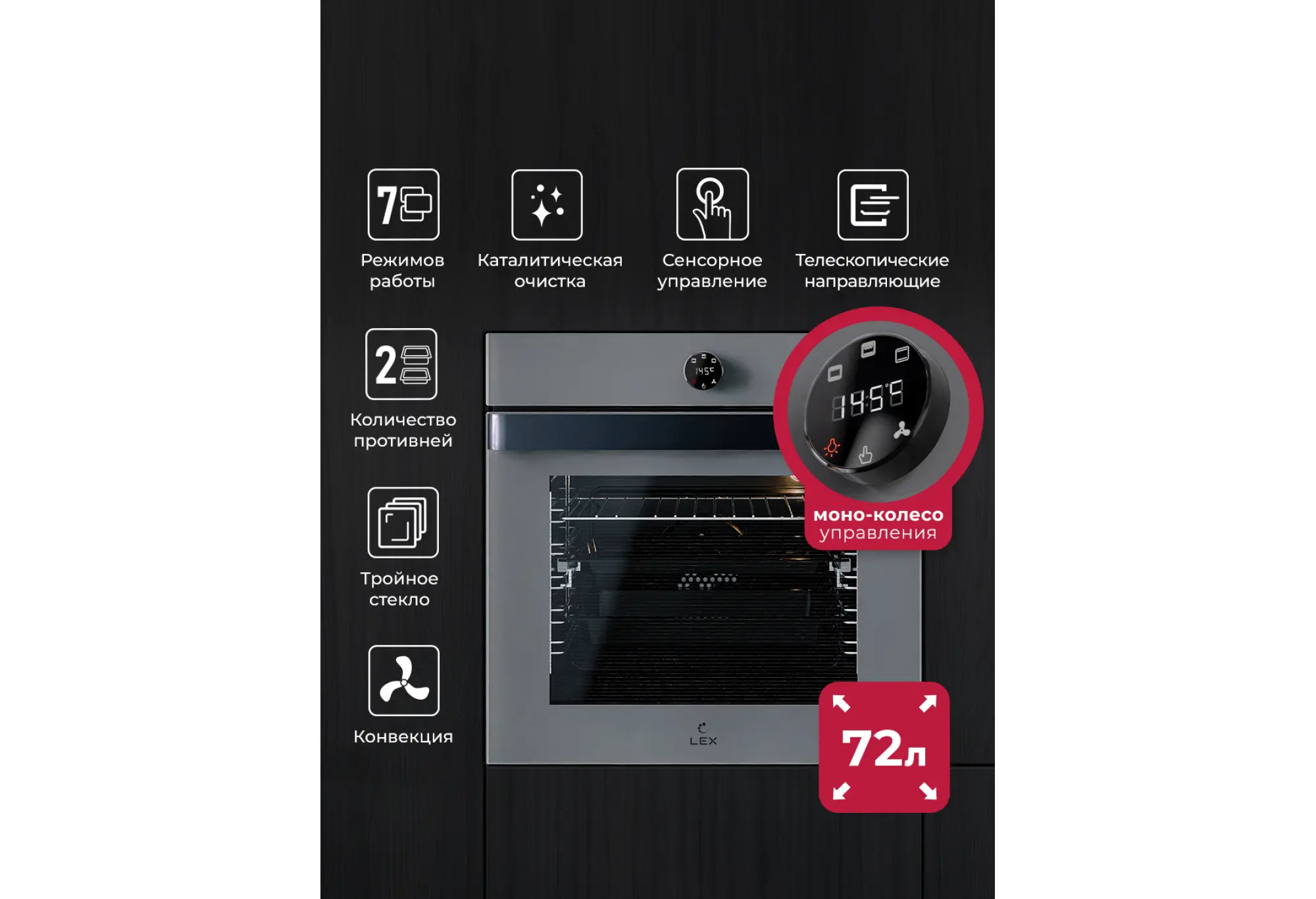 Духовой шкаф LEX EDP 607 Wide Series — комфорт и надежность в одном устройстве Эта модель предлагает просторную камеру объемом 75 литров, 7 режимов приготовления, идеально подходящую для приготовления больших блюд и семейных ужинов. Эргономичная широкая ручка и кольцо управления с экраном подчеркивают современный дизайн и удобство использования.Хромированные телескопические направляющие — удобство и безопасность с первого использования Духовой шкаф LEX EDP 607 Wide Series оснащен хромированными телескопическими направляющими, которые обеспечивают легкий доступ к блюдам во время приготовления. Благодаря им вы можете безопасно и удобно извлекать противни, снижая риск ожогов и делая процесс готовки более комфортным.Богатая цветовая палитра для гармоничного интерьера Модель представлена в следующих цветовых решениях: Black (черный c элементами управления из нержавеющей стали), Grey (серый), Black Black (черный) и White (белый). Такой выбор позволяет подобрать духовку, идеально дополняющую дизайн вашей кухни.Grey (серый)Серый оттенок универсален и гармонирует с любыми стилями и цветами, добавляя кухне современности и изысканности.7 режимов для реализации ваших кулинарных идей Духовка предоставляет семь различных режимов работы, включая традиционный нагрев, конвекцию, гриль и подсветку. С мощностью гриля 1200 Вт и максимальной температурой 270 °C вы сможете приготовить блюда с идеальной текстурой и вкусом.Интуитивное управление для вашего удобства Комбинированная система управления, объединяющая сенсорные и механические элементы, позволяет легко настраивать необходимые параметры. LED-дисплей четко отображает текущие настройки, а цифровой таймер обеспечивает точный контроль процесса приготовления.Современные технологии для безопасной эксплуатации Тройное стекло дверцы и встроенный термостат защищают от перегрева, обеспечивая безопасность использования. Каталитическая система очистки облегчает уход за духовкой, эффективно устраняя жировые отложения. Быстросъемная дверца упрощает обслуживание прибора.Исключительные результаты для каждого блюда С LEX EDP 607 Wide Series и его энергопотреблением класса A вы сможете наслаждаться превосходными кулинарными результатами, делая процесс приготовления приятным и эффективным.