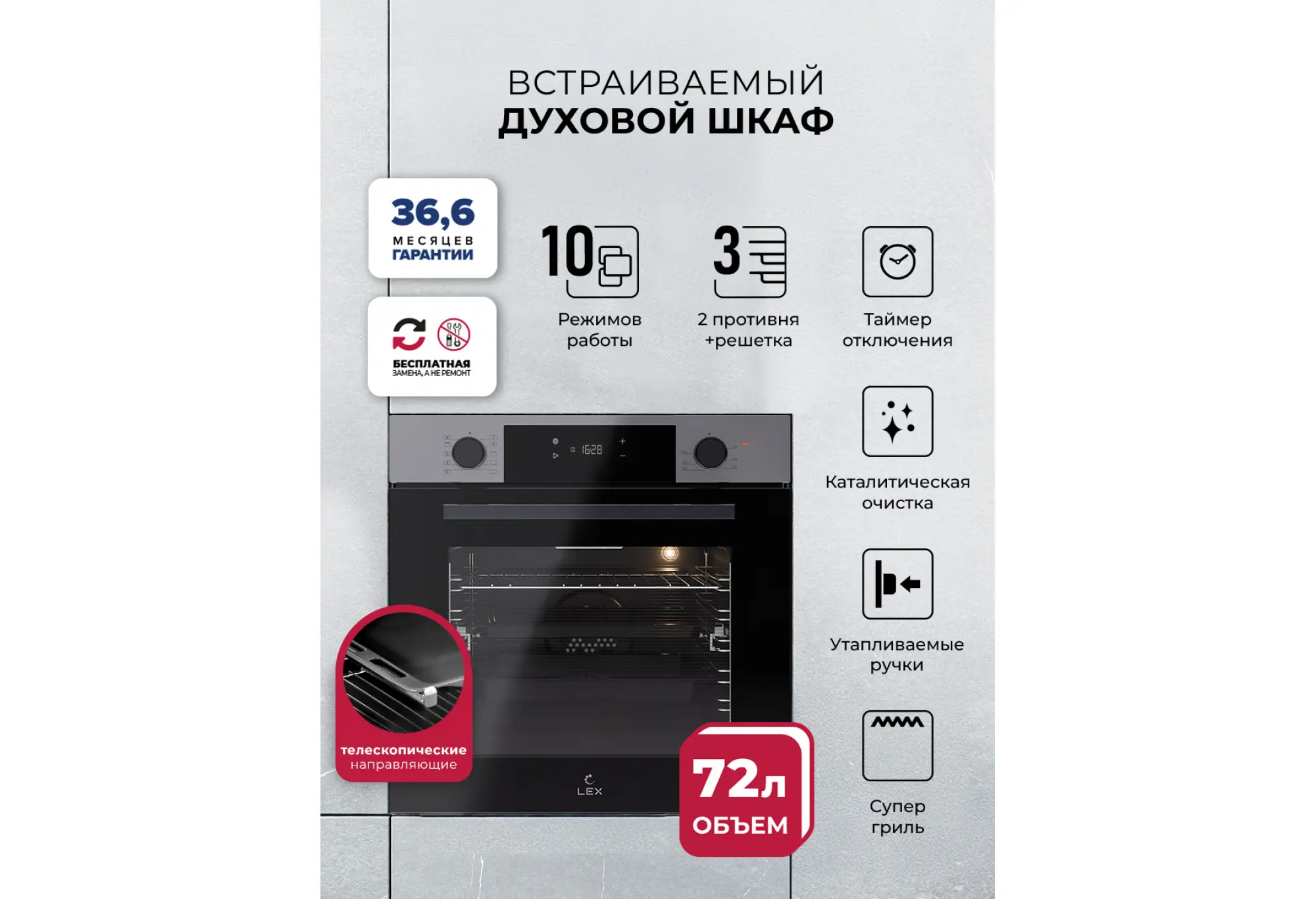 Духовой шкаф LEX EDP 610 — надежность и стиль в каждой деталиЭта модель с объемом рабочей камеры 75 литров создана для тех, кто ценит функциональность и комфорт. 10 режимов работы, управление с LED-дисплеем и двумя утапливаемыми ручками делает процесс приготовления интуитивно понятным.Хромированные телескопические направляющие — удобство и безопасность в использованииДуховой шкаф LEX EDP 610 оснащен хромированными телескопическими направляющими, которые обеспечивают легкий доступ к блюдам во время готовки. Они позволяют безопасно и удобно извлекать противни, снижая риск ожогов и облегчая процесс приготовления.Широкая цветовая палитра для идеального сочетания с вашим интерьеромДуховой шкаф LEX EDP 610 доступен в следующих цветовых решениях: White (белый), Black (черный), Dark Inox (темная нержавеющая сталь), Grey (серый) и Inox (нержавеющая сталь). Такой ассортимент позволяет подобрать модель, которая гармонично впишется в дизайн вашей кухни.LEX EDP 610 — 10 режимов для вашего вдохновения!Духовой шкаф предлагает 10 различных режимов работы, включая традиционный нагрев, конвекцию, гриль и размораживание. Это универсальный выбор для приготовления разнообразных блюд. Мощность гриля 2100 Вт и температурный диапазон от 50 до 270 °C обеспечивают быстрые и равномерные результаты.Точная настройка под ваши нуждыКомбинированное управление, сочетающее сенсорные и механические элементы, позволяет гибко настраивать параметры готовки. LED-дисплей отображает важную информацию, а цифровой таймер помогает точно следовать рецептам.Современные технологии для максимальной безопасностиТройное стекло дверцы обеспечивает надежную теплоизоляцию, а встроенный термостат гарантирует безопасную эксплуатацию. Каталитическая система очистки упрощает уход за духовкой, эффективно поглощая жировые отложения. Быстросъемная дверца способствует легкому поддержанию чистоты.Превосходный результат каждый разС LEX EDP 610 вы сможете наслаждаться идеально приготовленными блюдами благодаря конвекции и мощному грилю. Духовой шкаф с энергоэффективностью класса A станет незаменимым помощником на вашей кухне.