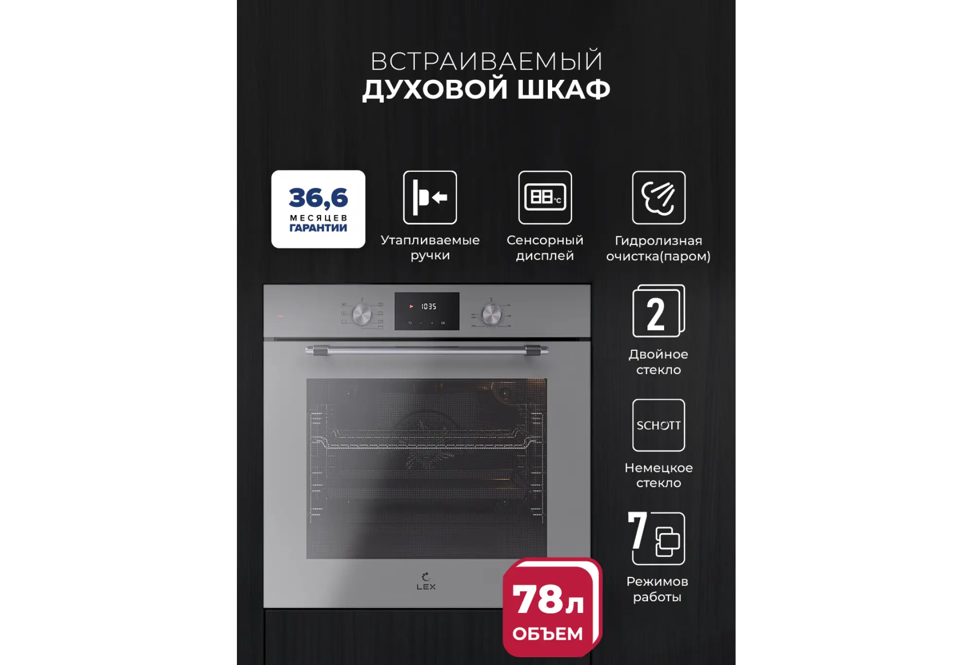 Преимущества:- Объем 78 л — комфортное приготовление на нескольких уровнях