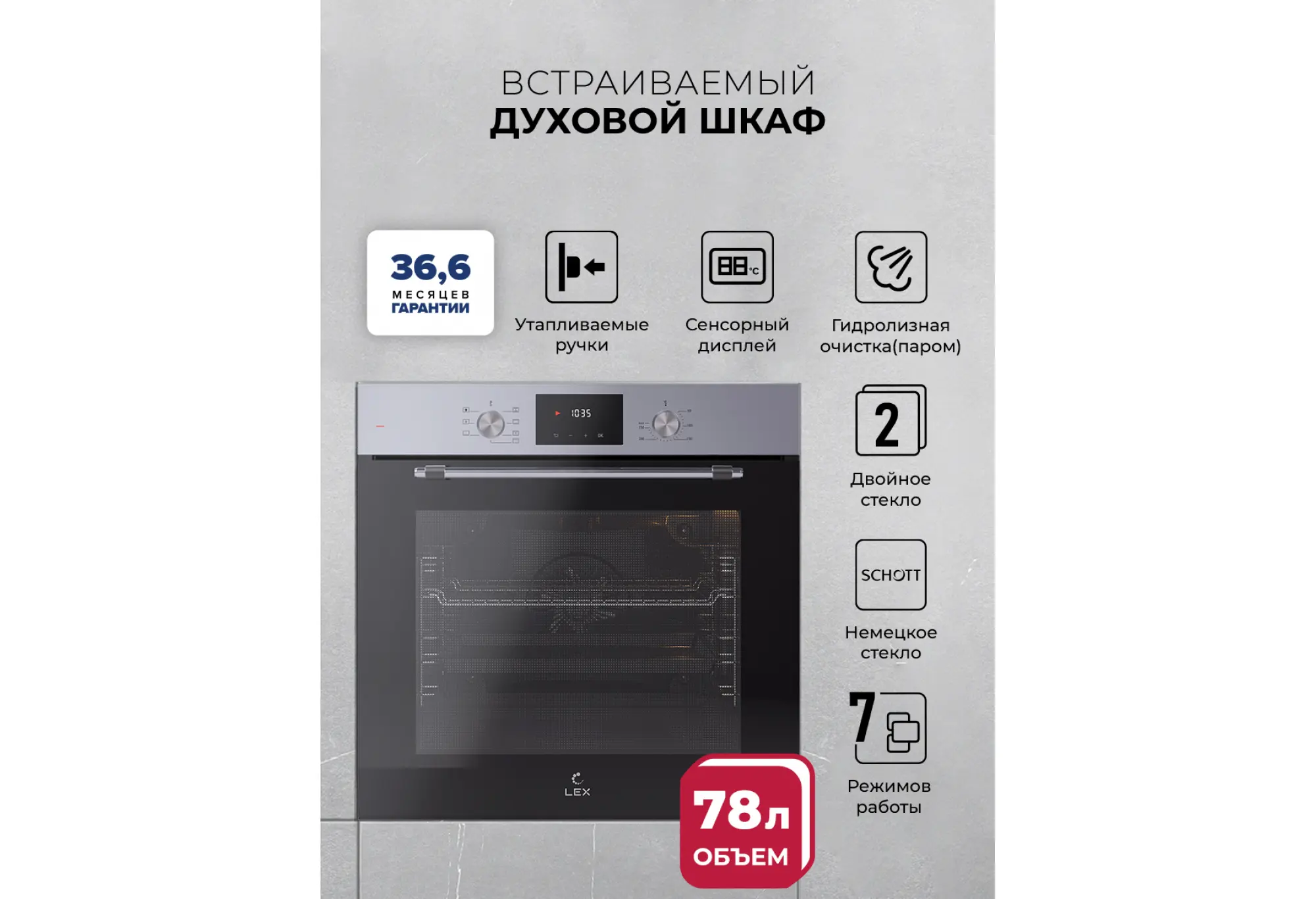 Электрический духовой шкаф LEX EDP 671 IX MAX создан для тех, кто ценит функциональность, современный дизайн и удобство встраиваемой техники. Лаконичный фасад из нержавеющей стали и стекла в цвете inox легко вписывается в современную кухню и сочетается с другими приборами. Компактный стандартный размер 60×60 см позволяет без труда встроить духовку в большинство кухонных гарнитуров, соблюдая рекомендуемые размеры ниши.