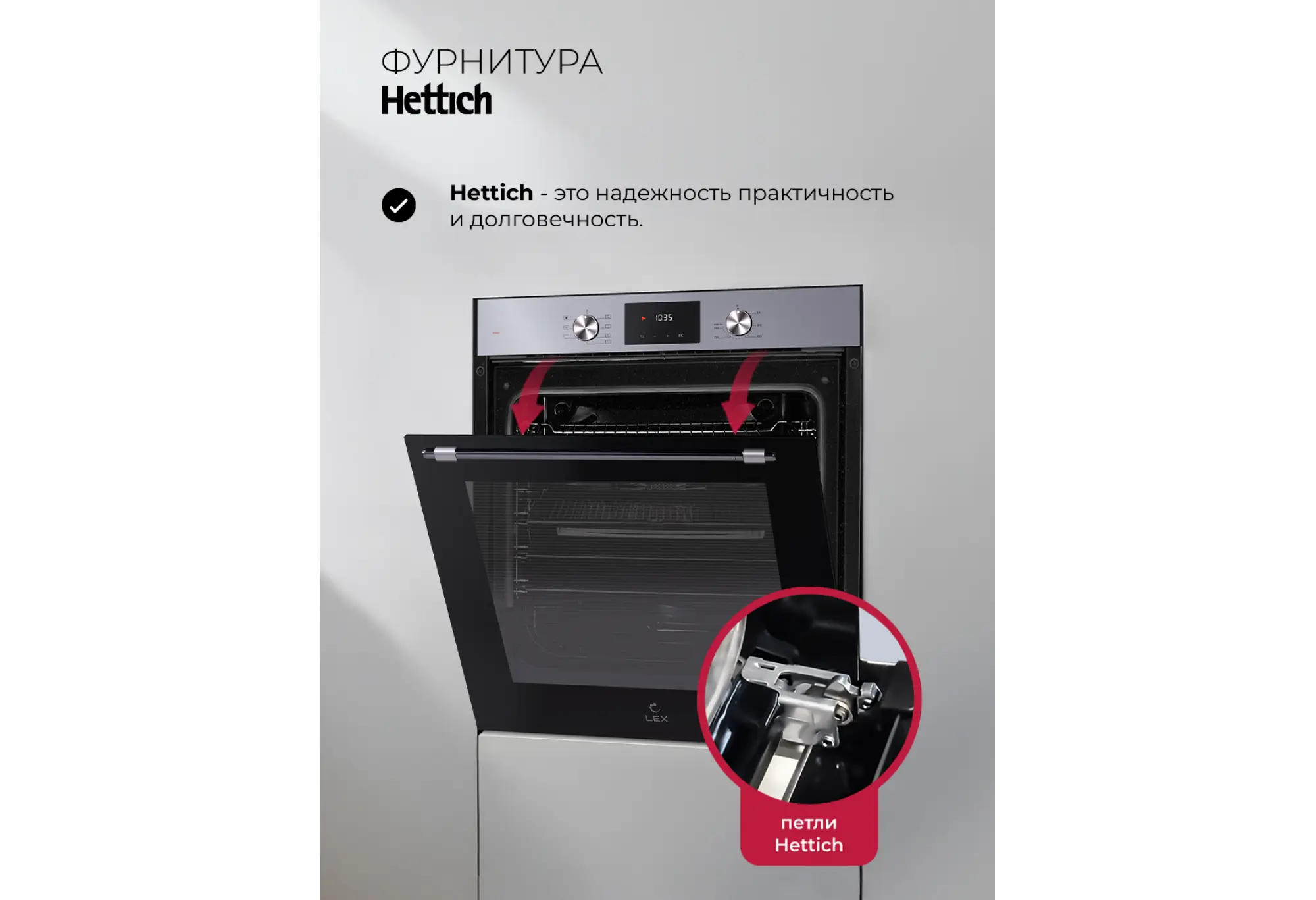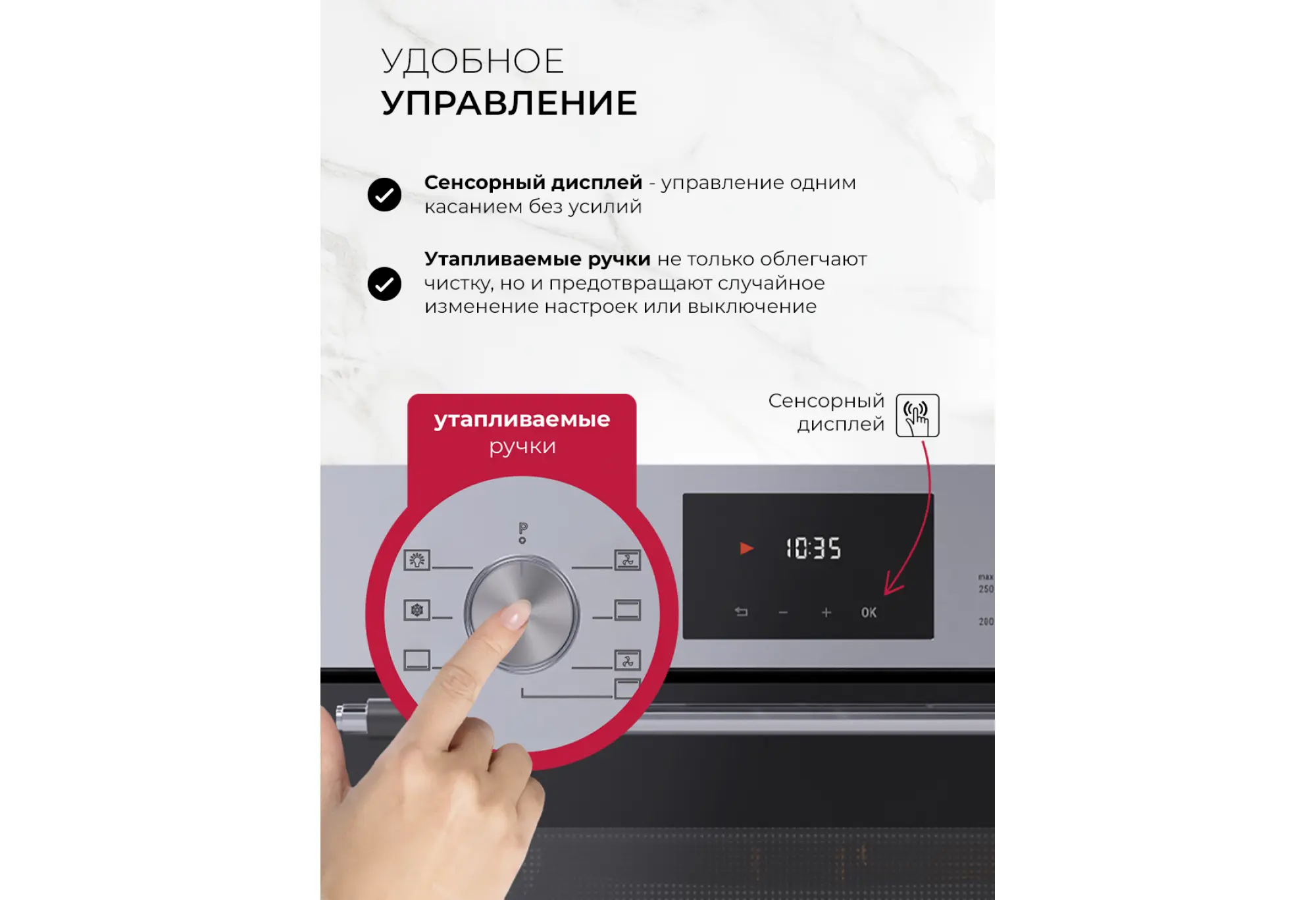 Управление сочетает механические и сенсорные элементы - утапливаемые ручки обеспечивают аккуратный внешний вид и снижают риск случайного поворота, а LED‑дисплей с таймером помогает контролировать время приготовления. Это делает работу с духовкой наглядной и понятной даже тем, кто редко имеет дело с техникой.