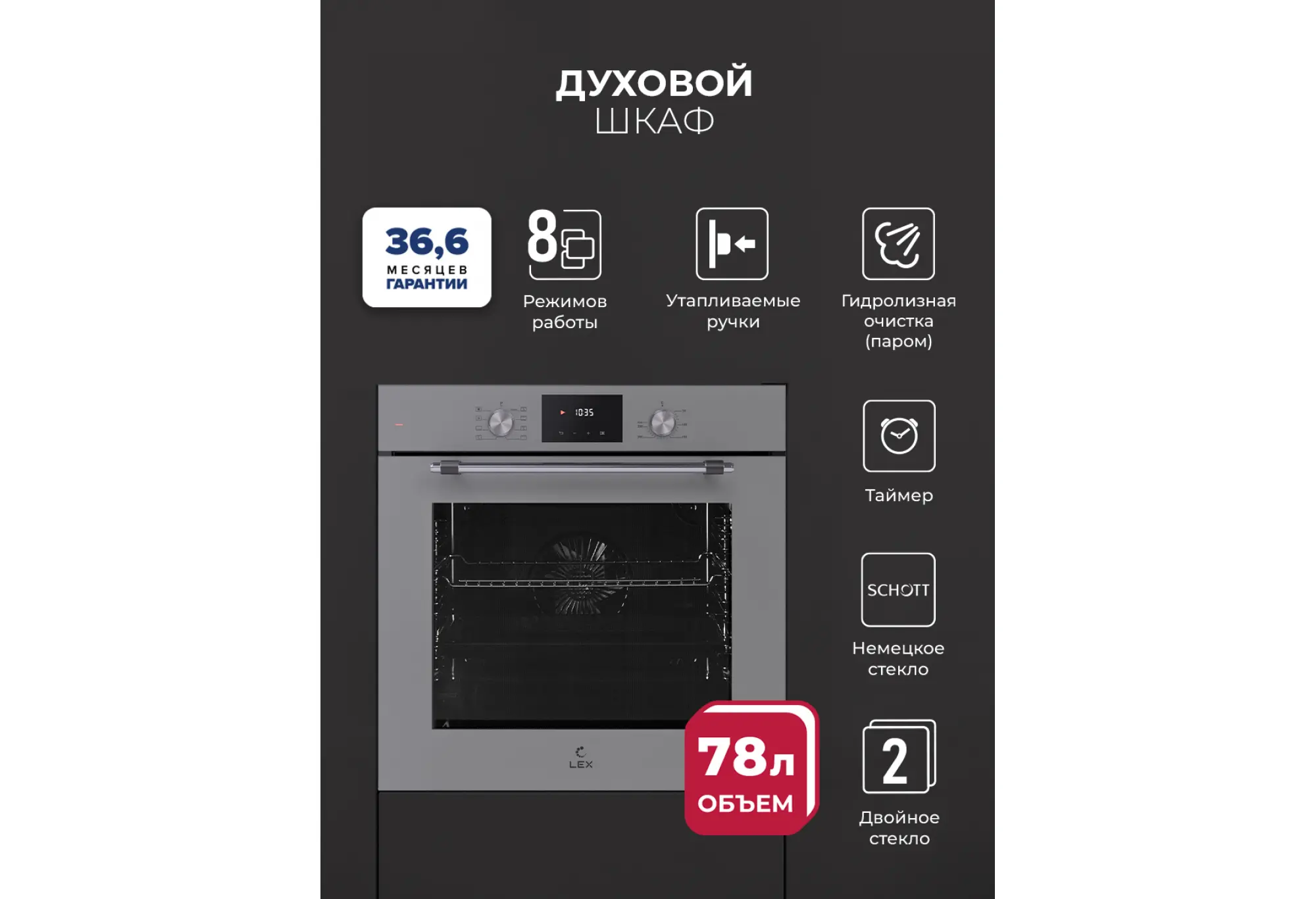 Электрический духовой шкаф LEX EDP 680 GR MAX – вместительная и функциональная техника для тех, кто много готовит дома и ценит удобство. Объем духовки 78 л позволяет одновременно размещать большие противни, высокие формы и несколько блюд сразу, что особенно удобно для семейных обедов и праздничных ужинов.