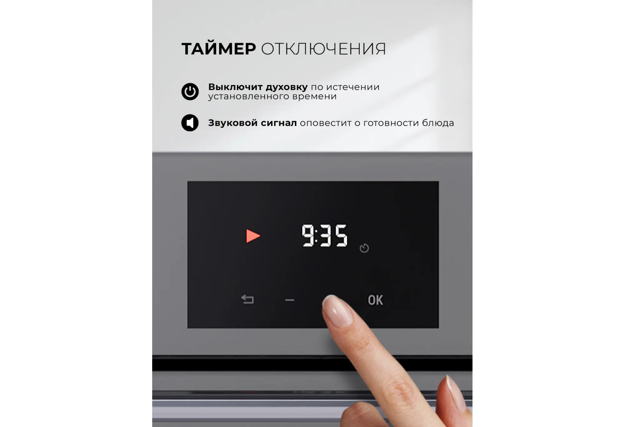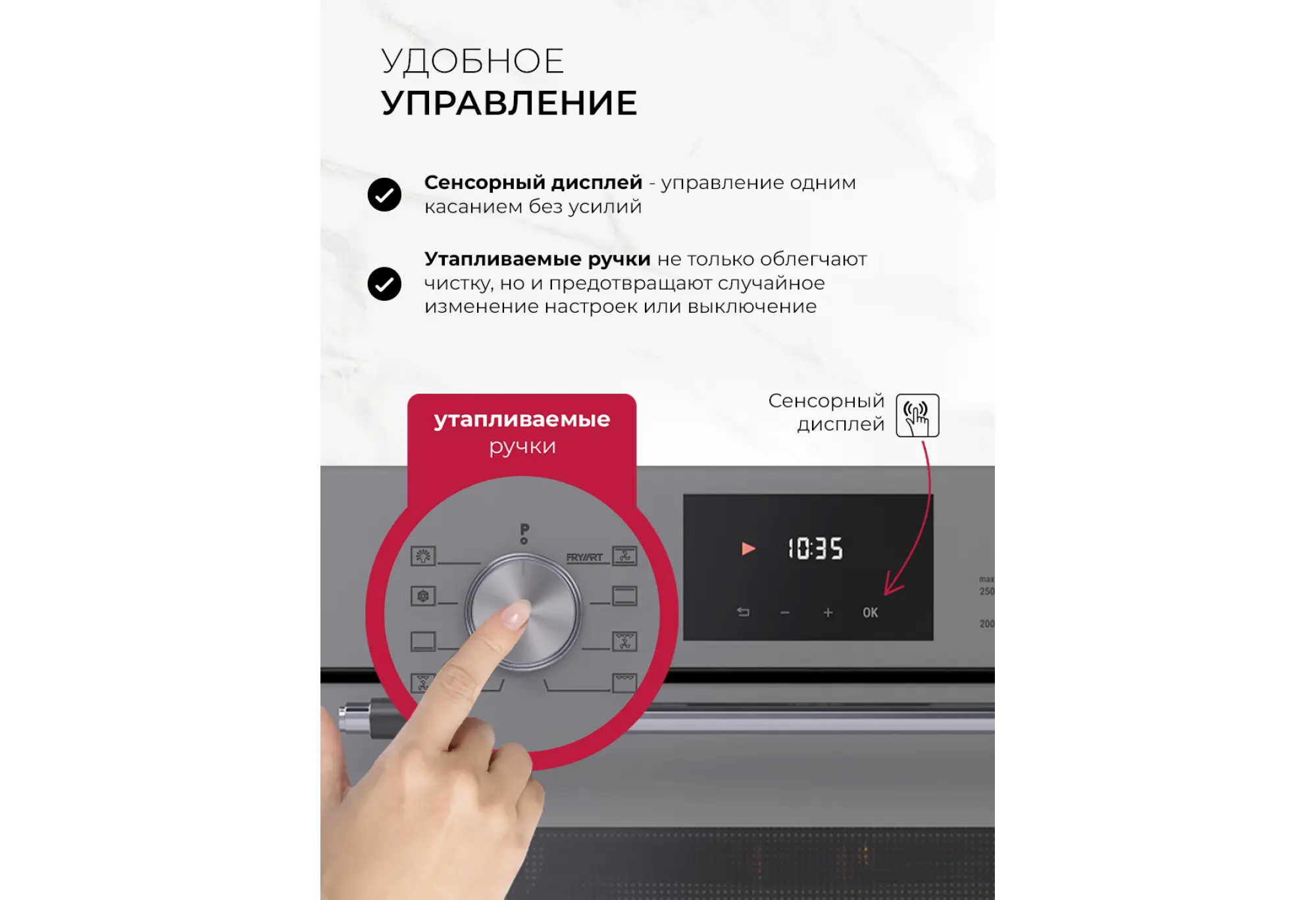 Сдержанный серый цвет в сочетании нержавеющей стали и стекла гармонично впишется в современную кухню, фасад выглядит аккуратно и технологично. Лицевая панель оснащена LED-дисплеем и комбинированным управлением. Утапливаемые механические ручки сочетаются с сенсорными кнопками и таймером. Ручки убираются в панель, когда духовка не используется, за счет чего снижается риск случайного поворота и упрощается уход за поверхностью.