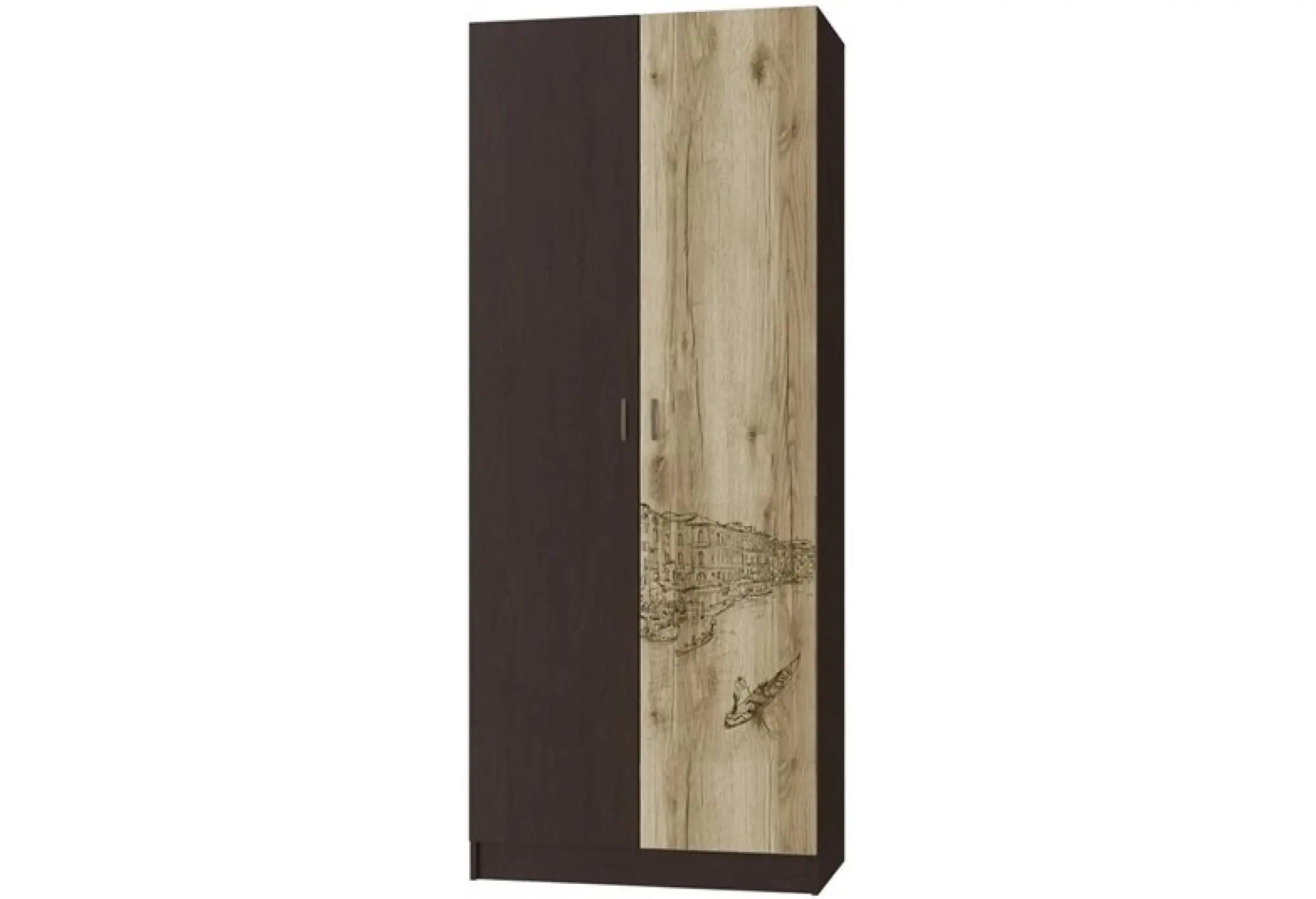 Шкаф "Орион 1" выполнен в изысканном сочетании цветов ясень шимо и дуб сонома, которые придают ему элегантный вид. Фотопечать на фасаде добавляет уникальности и утонченности, делая его центральным элементом в интерьере.