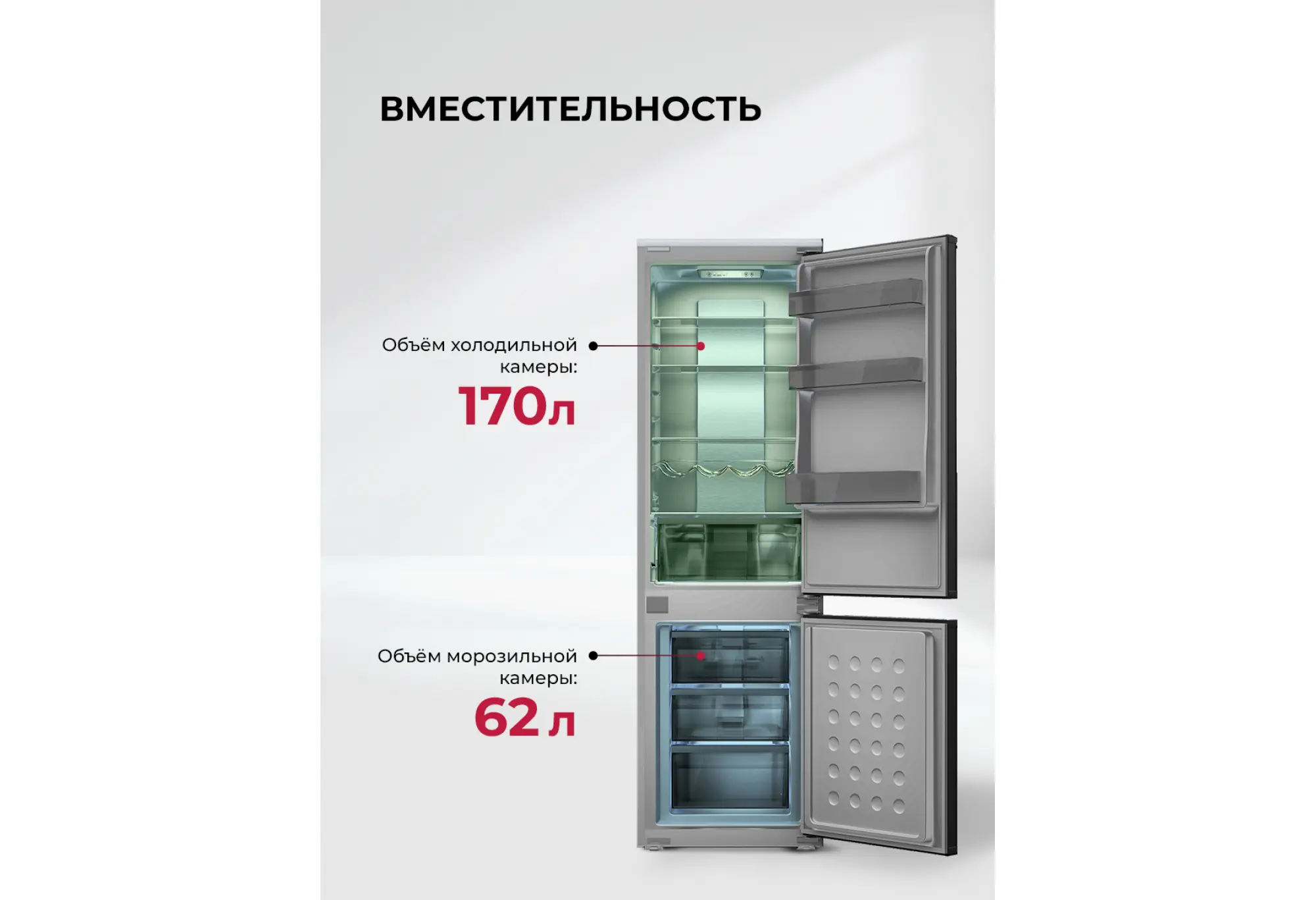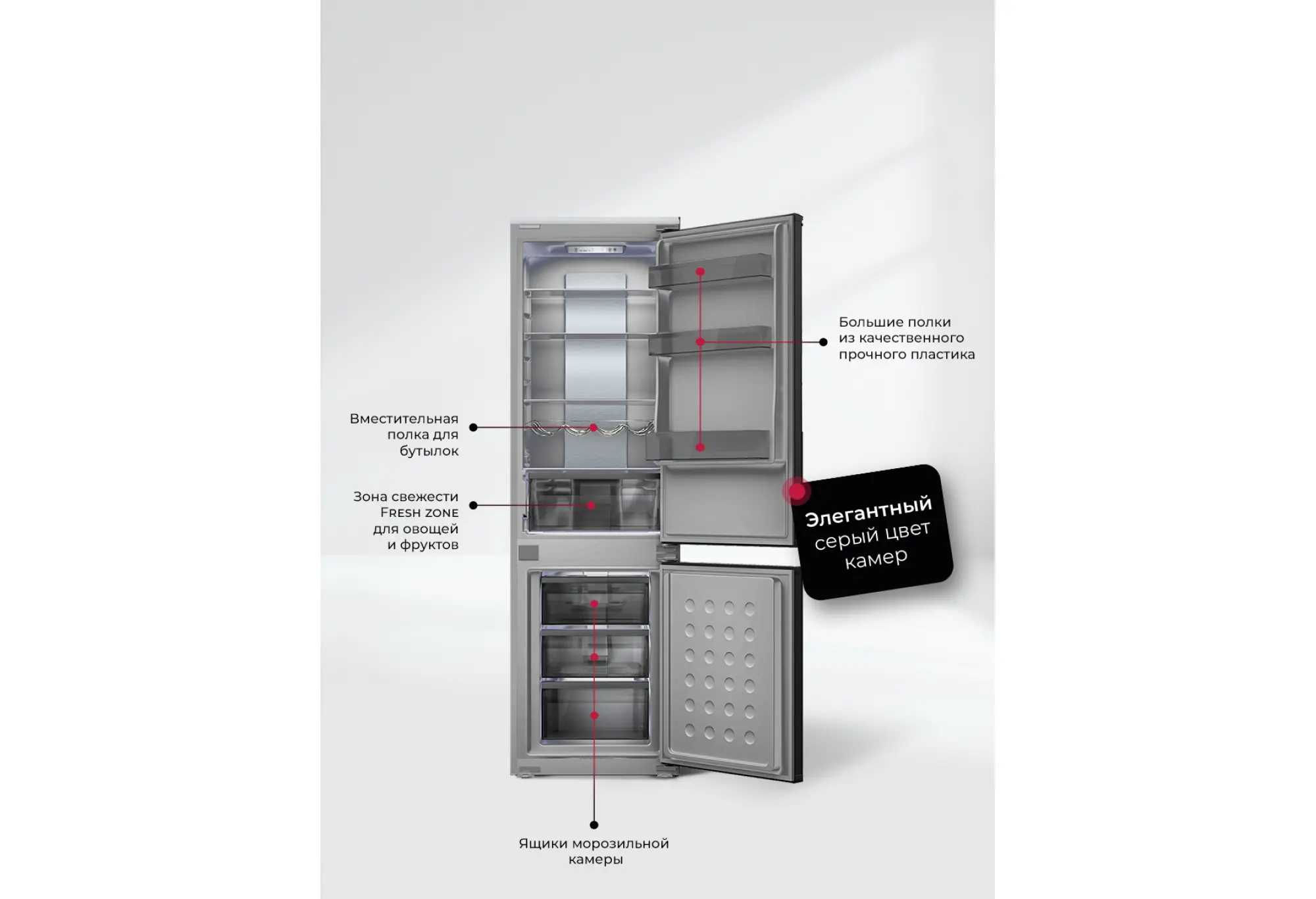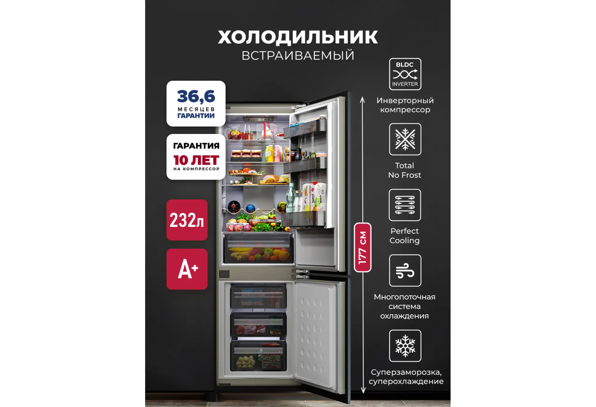 Встраиваемый двухкамерный холодильник LEX LBI177.3ID имеет хороший функционал и в то же время очень прост в эксплуатации. Внутренняя отделка холодильника и морзильника выполнена в серых тонах. Технология Total No Frost значительно упрощает обслуживание и помогает устанавливать оптимальную температуру и влажность. При большом объеме, мощной заморозке и яркой подсветке эта модель высотой 177 см обладает прекрасной энергоэффективностью и низким уровнем шума. Электронная панель управления удобна и долговечна, а режим сохранения температуры выручит при отключении электричества. Для вашего комфорта дверцу холодильника можно закрепить справа или слева; а функция “сигнал при открытой дверце” позаботится о том, чтобы она всегда была герметично закрыта. Модель оснащена ящиком, в котором можно отдельно настраивать уровень влажности, создавая идеальные условия для хранения разных видов овощей и фруктов. Холодильник LEX LBI177.3ID оснащен современным инверторным компрессором, который гарантирует эффективную и практически бесшумную работу. Он также обеспечивает низкий расход энергии и долго поддерживает температуру без электропитания.