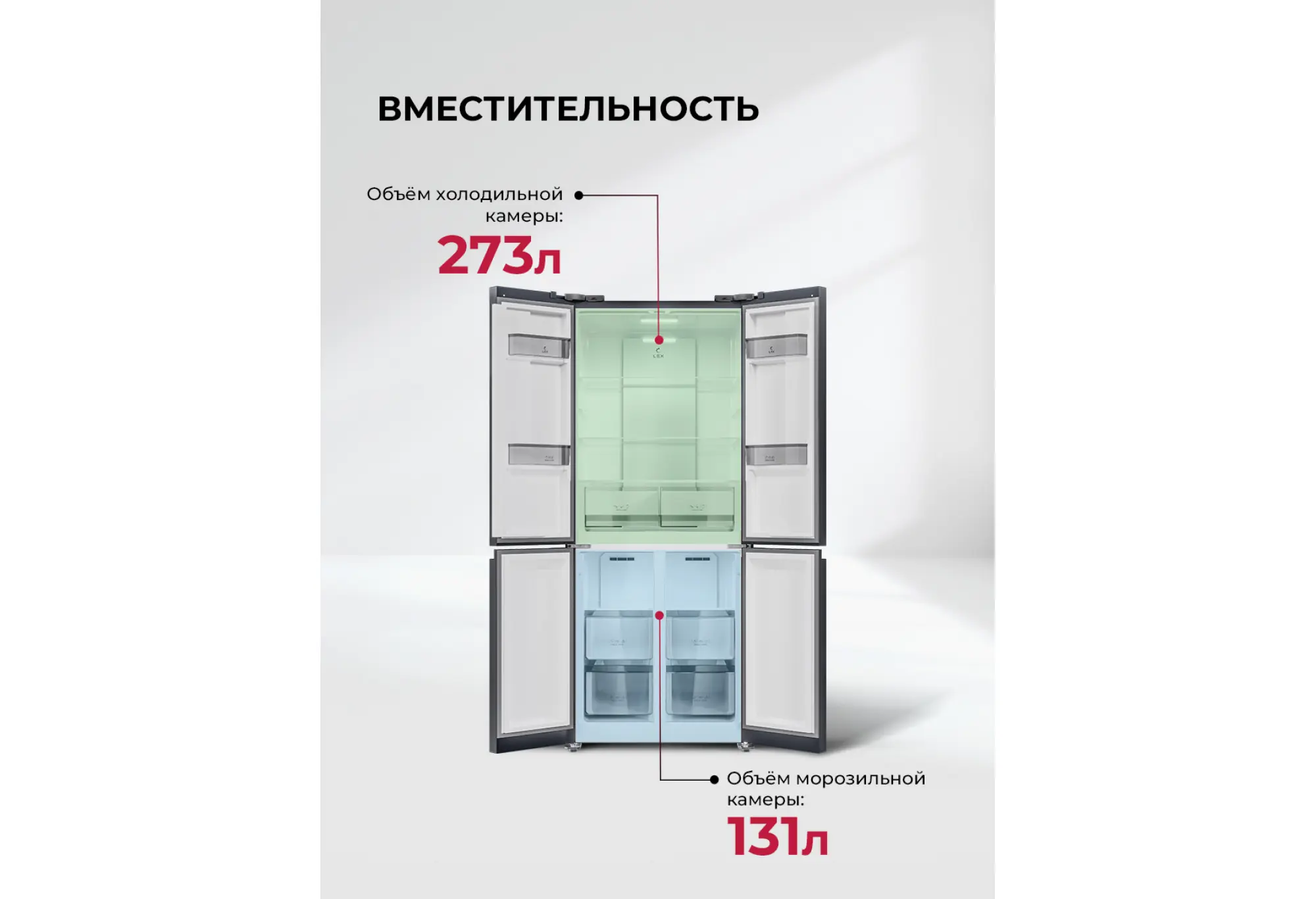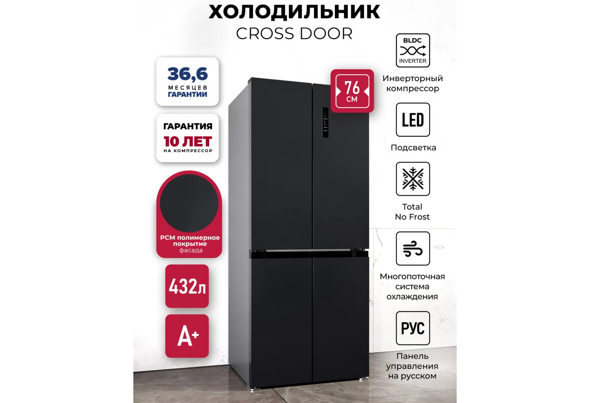 Холодильник LEX LCD432BmID в темно‑сером цвете — функциональное решение для современной кухни с продуманной организацией хранения. Конструкция CROSS DOOR с четырьмя дверцами обеспечивает удобный доступ к содержимому и помогает рационально использовать пространство, а ширина 76 см позволяет установить модель даже в относительно небольших помещениях. Общий полезный объём 432 л подходит для семьи, которая делает крупные закупки и ценит порядок в холодильнике.
