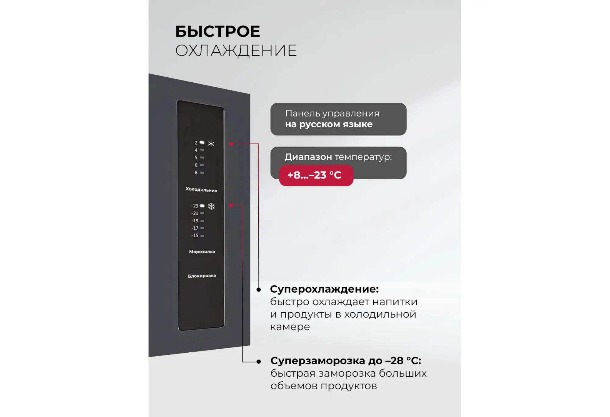 Электронная панель управления с русскоязычным интерфейсом и светодиодными индикаторами помогает точно выставлять температуру - от +8 °С в холодильном отделении до –23 °С в стандартном режиме морозильной камеры. Режим суперзаморозки быстро снижает температуру до –28 °С, что особенно удобно при закладке большой партии свежих продуктов. В холодильной камере предусмотрен режим ускоренного охлаждения для быстрого приведения напитков и блюд к нужной температуре.