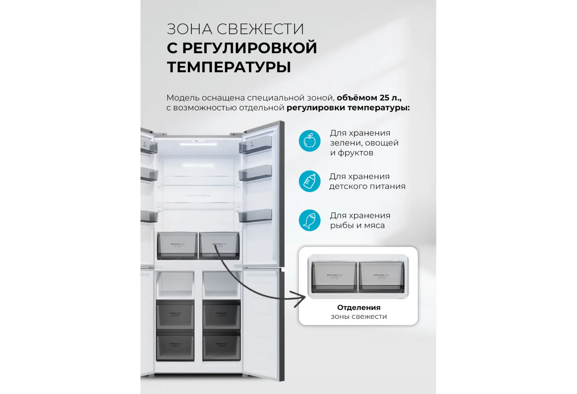 Зоны с независимой регулировкой температуры и влажности помогают поддерживать оптимальные условия для овощей, зелени и фруктов, продлевая срок их хранения. Режимы суперохлаждения и суперзаморозки позволяют быстро охладить или заморозить свежие продукты, сохранив их свойства и внешний вид.