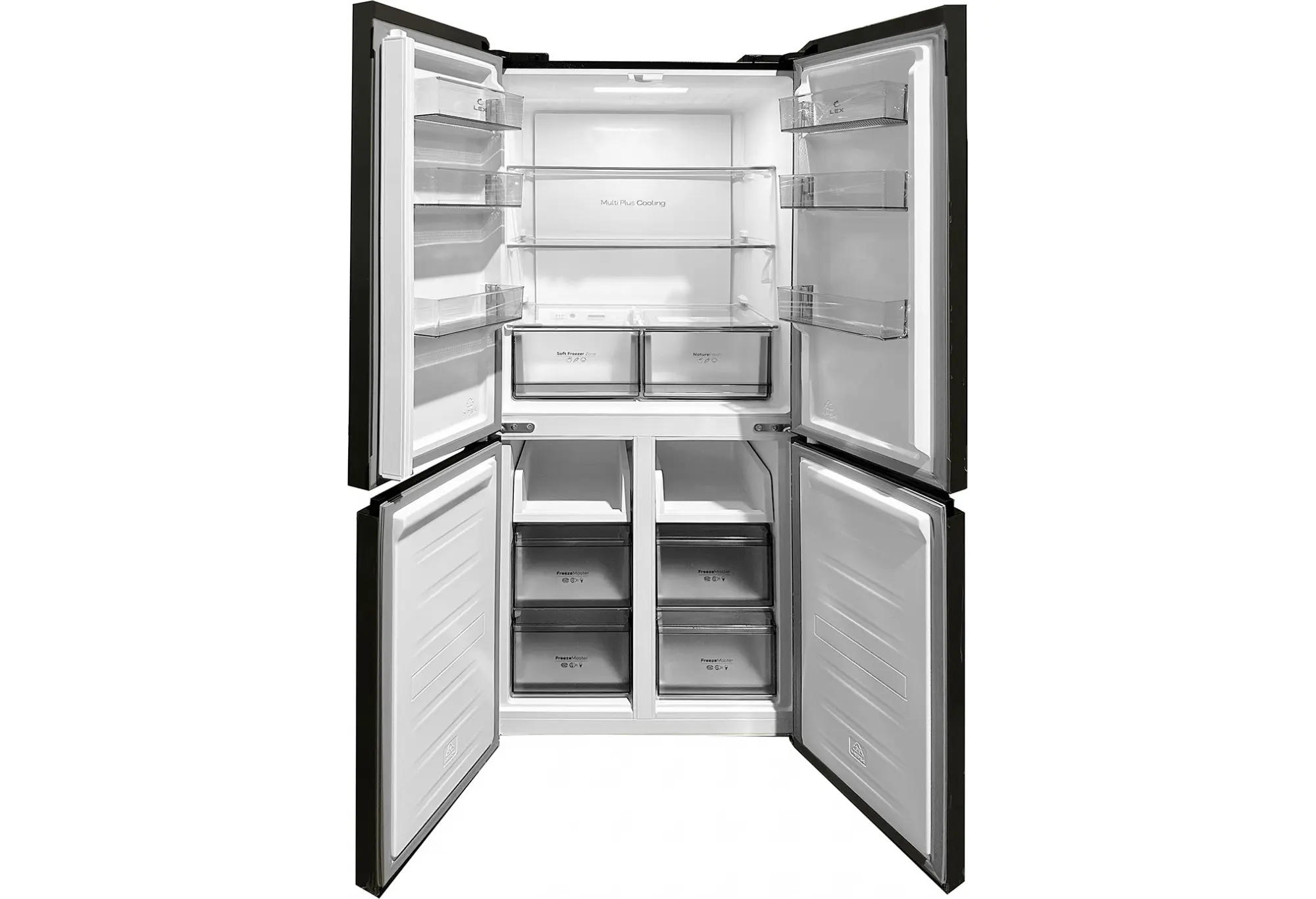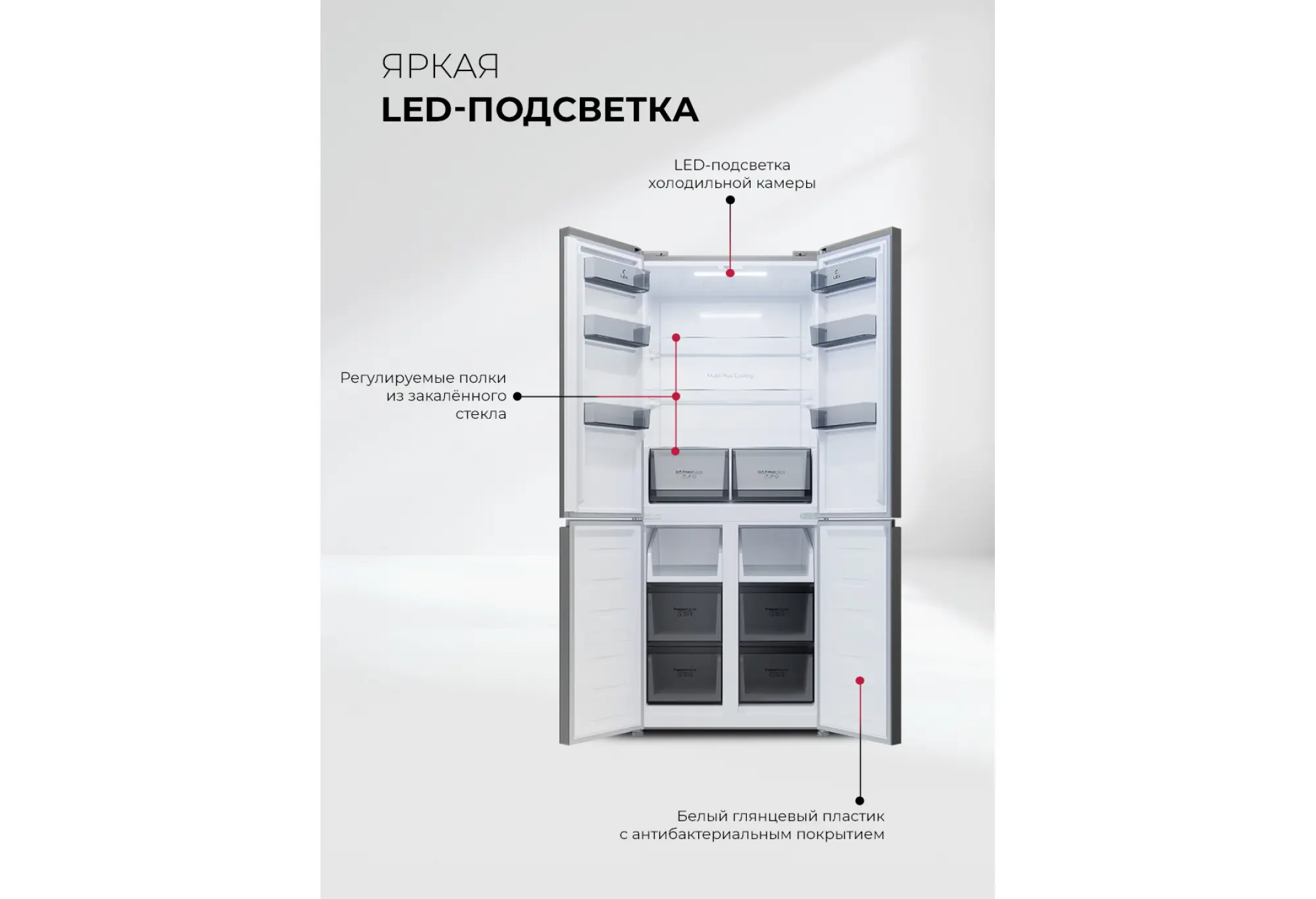 LEX LCD485GRID — современный четырехдверный холодильник Cross Door с инверторным компрессором и стеклянными фасадами, который станет выразительным акцентом в интерьере кухни. Лаконичный серый цвет и ровная глянцевая поверхность дверей легко сочетаются как с светлыми, так и с темными гарнитурами. Вентиляция, расположенная в нижней части корпуса, позволяет интегрировать холодильник в шкаф или нишу без нарушения теплообмена.
