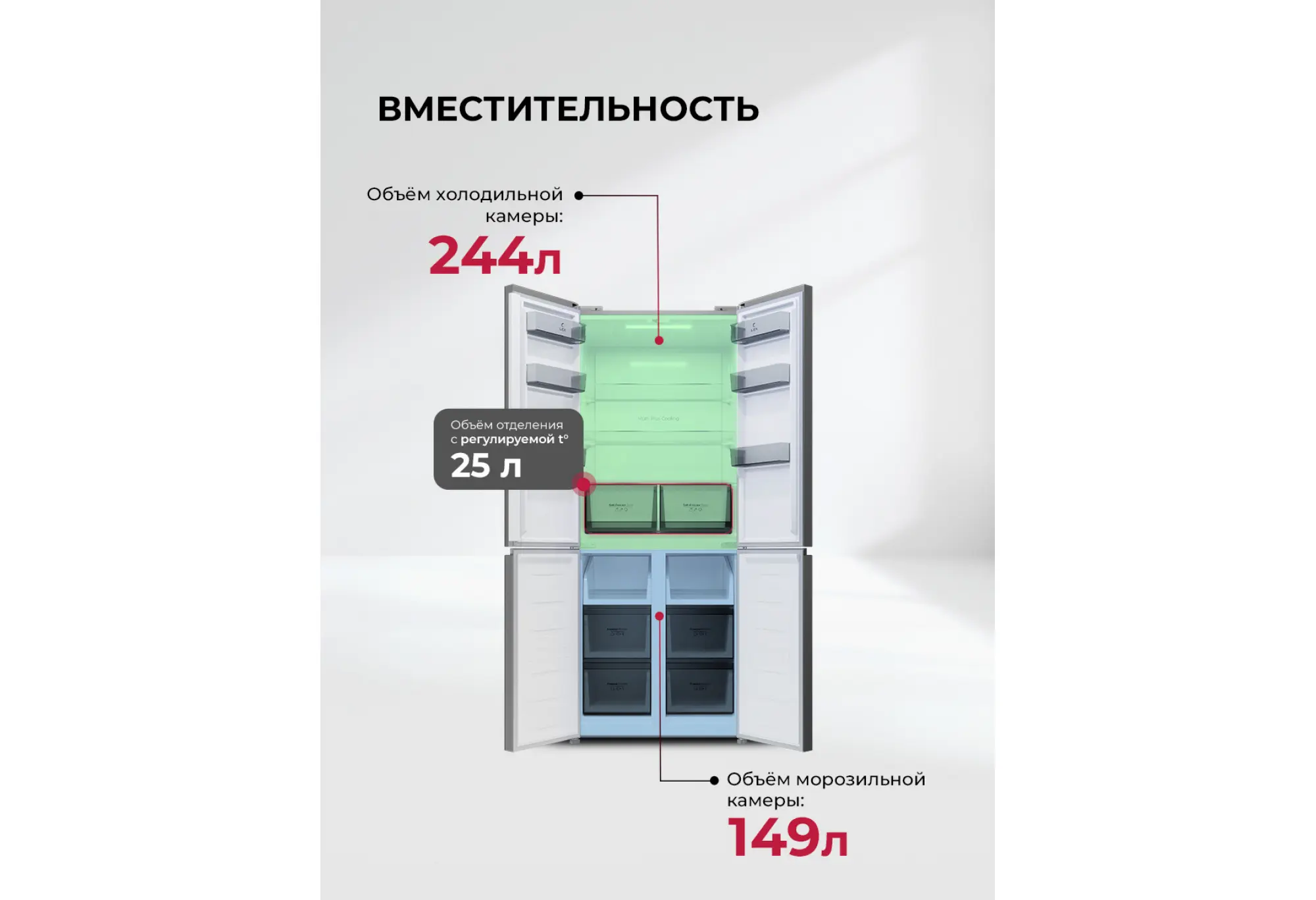 - Зоны с регулировкой температуры и влажности для овощей и фруктов