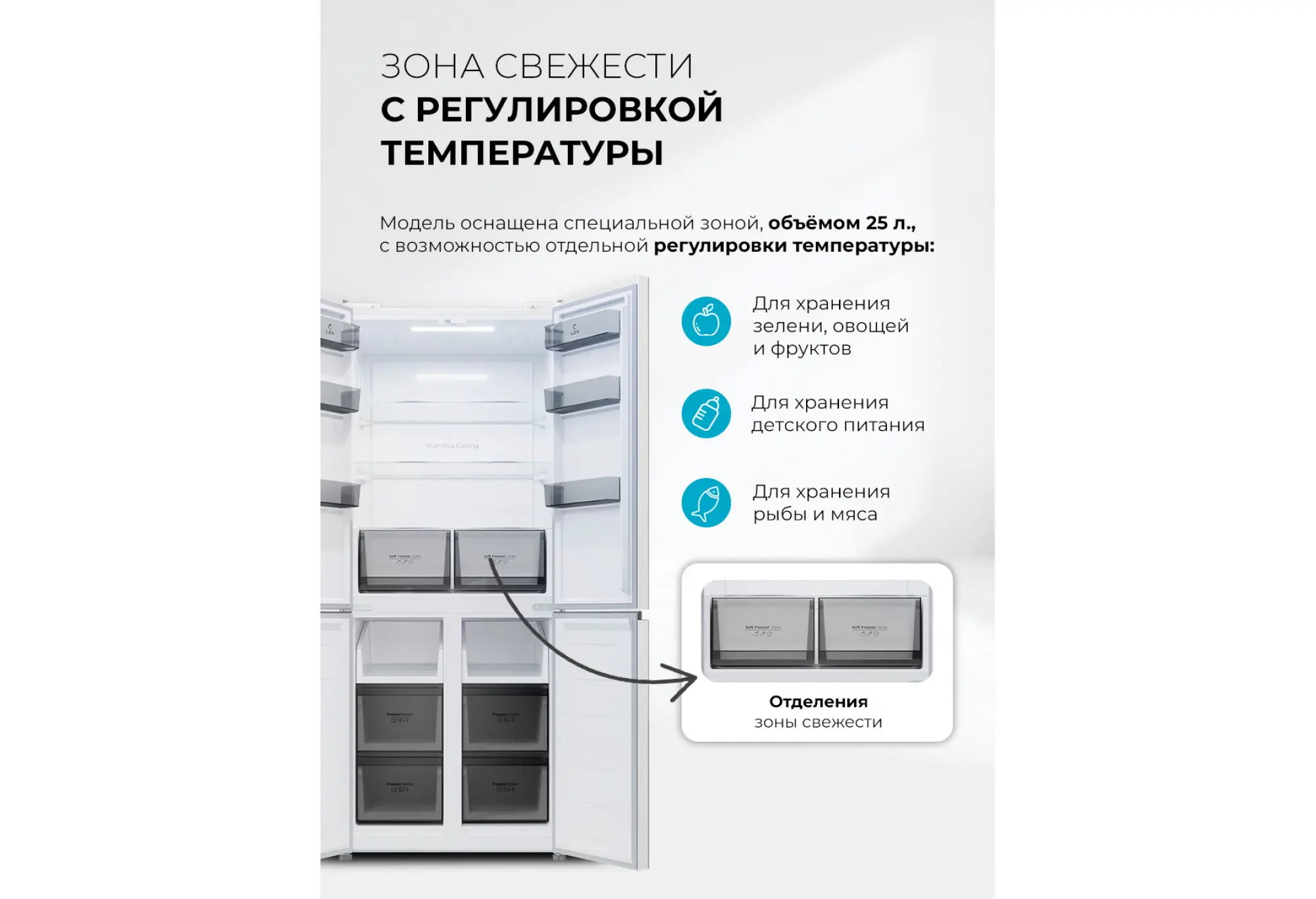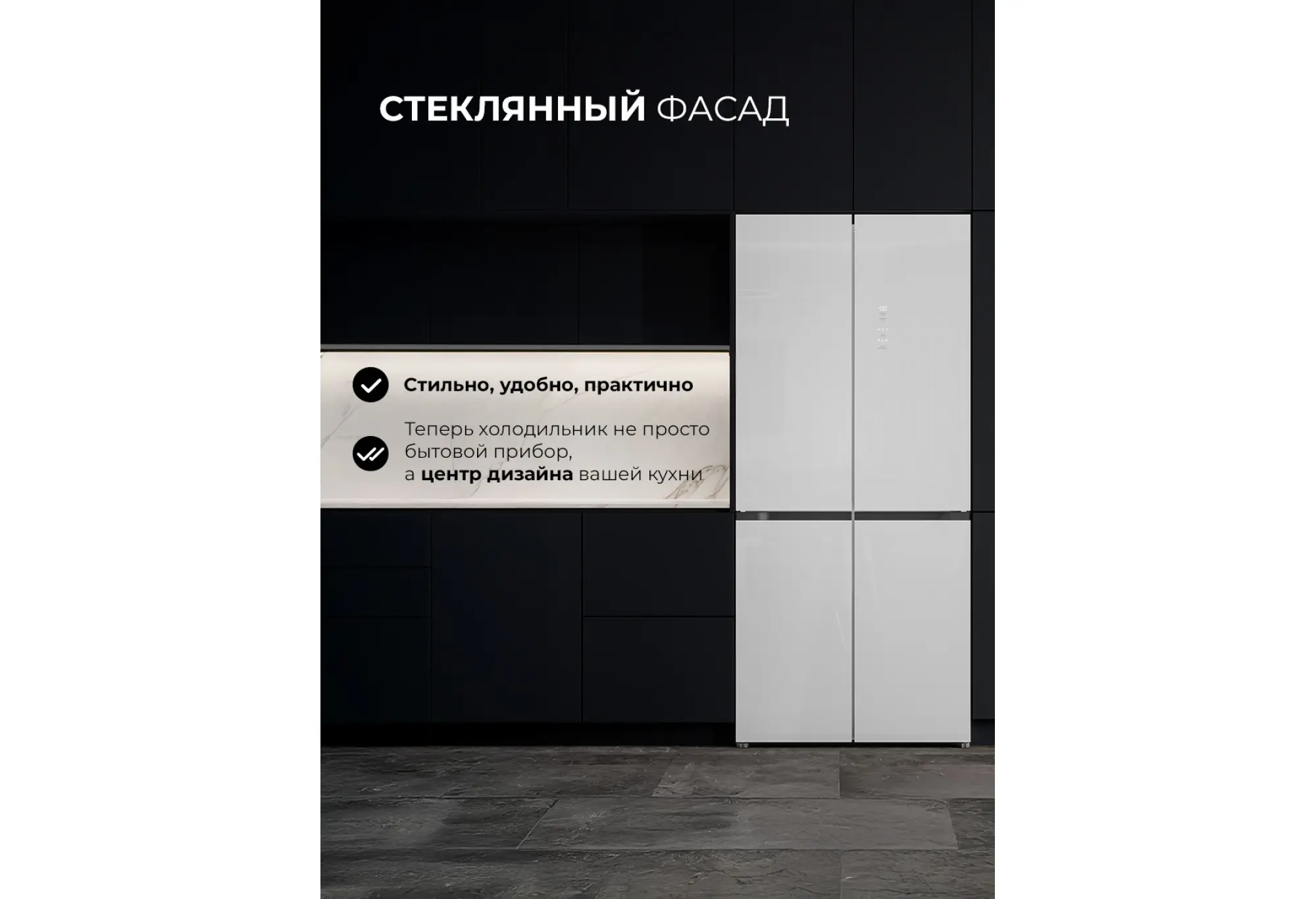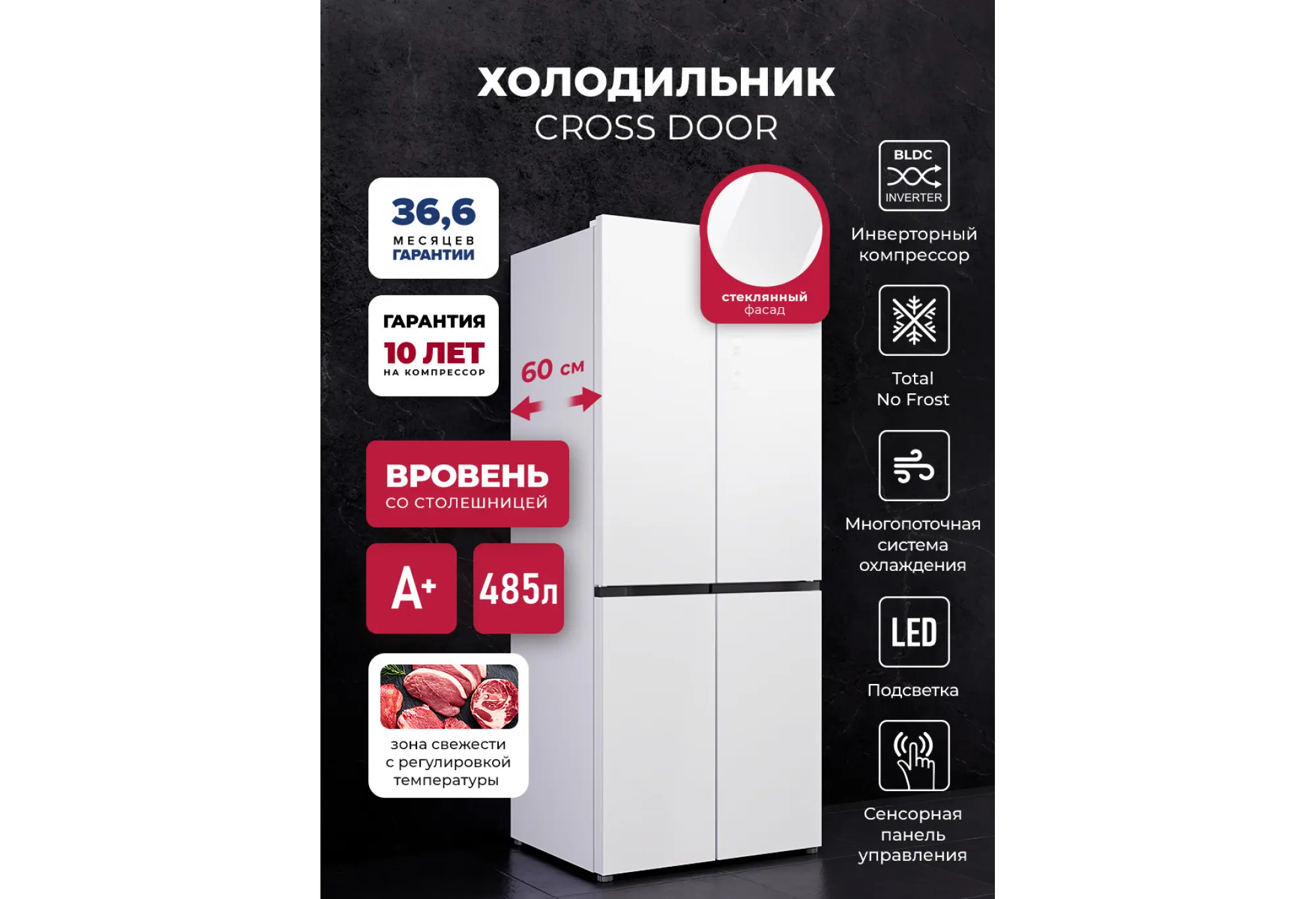 Холодильник Cross Door с инверторным компрессором будет радовать вас многие годы. Модель со стеклянными дверьми станет ключевым элементом дизайна вашей кухни. Вентиляция у холодильника находится в нижней части, поэтому его можно интегрировать в любой шкаф или стену.Разделение на 3 камеры с впечатляющим объемом, независимыми контурами охлаждения и системой Total No Frost делает использование холодильника и уход за ним очень комфортными.Зоны с независимой настройкой температуры и влажности помогут сохранить овощи и фрукты свежими на длительное время.Электронное управление позволяет легко регулировать параметры в каждой камере. LED-лампы создают яркое и равномерное освещение, чтобы вы легко могли найти нужный продукт.Холодильник отличается очень низким уровнем шума, поэтому станет идеальным решением даже для европланировок. Класс энергопотребления А+++ и возможность сохранения температуры почти на сутки при отключении электроэнергии делают модель не только эффективным и эффектным, но и надежным решением для вашего дома.