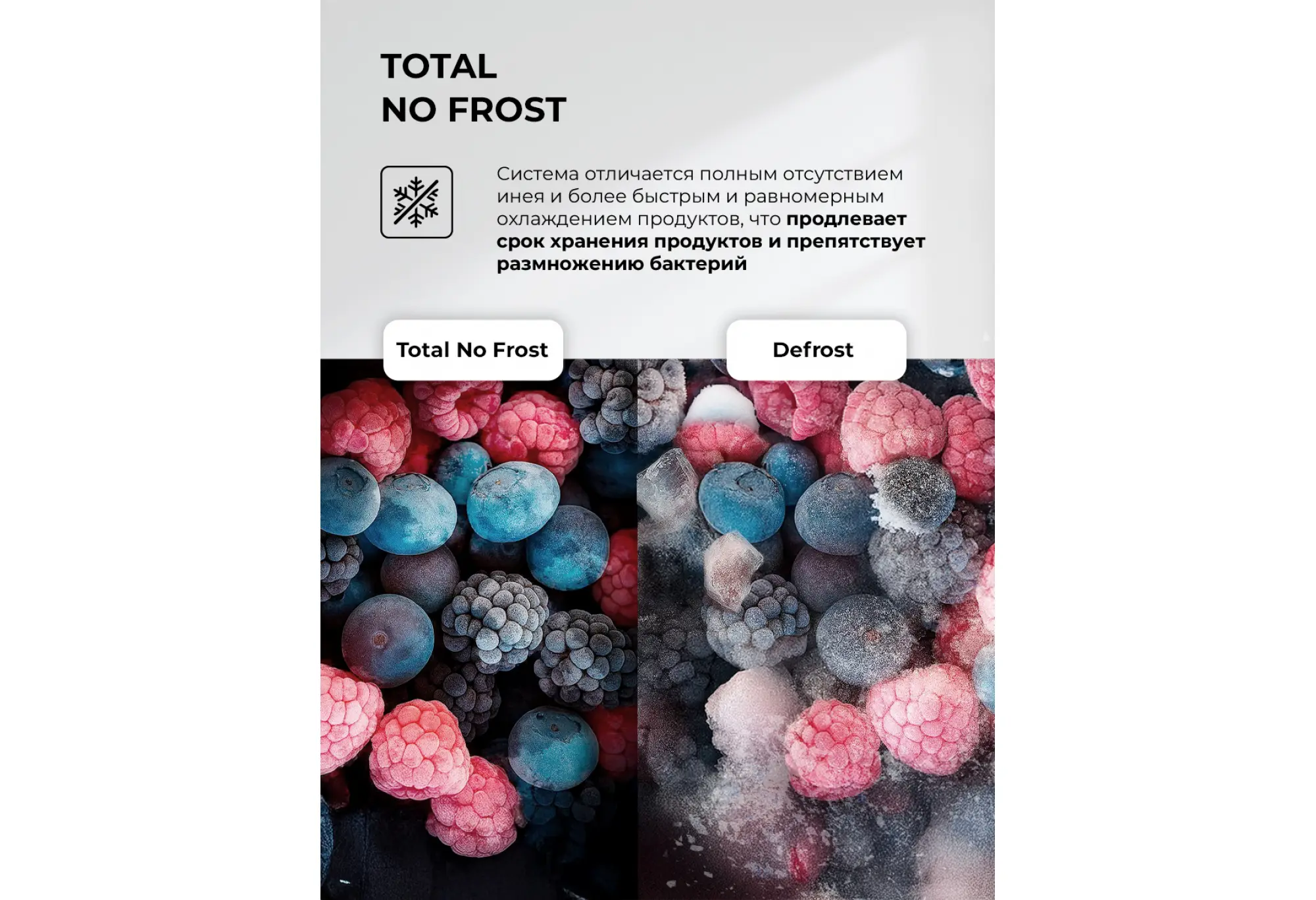 Интуитивно понятный интерфейс на русском языке и электронное управление значительно упрощают использование. Функции суперзаморозки и суперохлаждения помогают быстро охладить продукты, а режим «Отпуск» поддерживает оптимальную температуру во время вашего отсутствия. Система No Frost устраняет необходимость в ручной разморозке обеих камер.