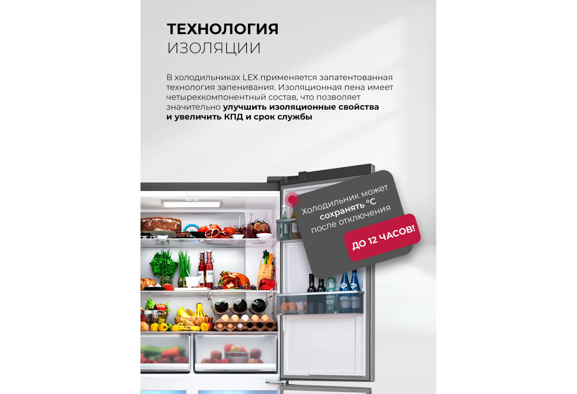 Он рассчитан на энергоэффективность класса A+++, потребляя всего 373 кВт в год. При отключении электроэнергии способен сохранять холод до 12 часов.