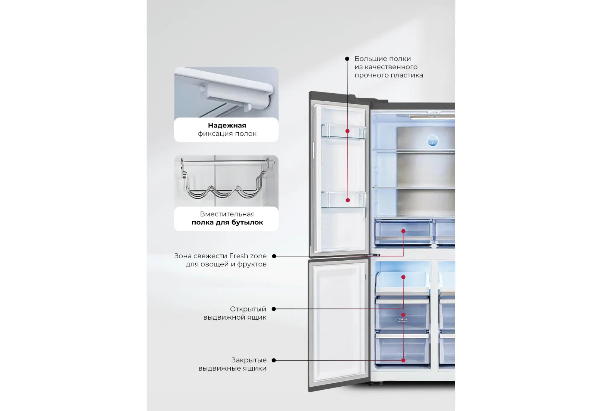 Холодильник LEX LCD 505 станет отличным выбором для большой семьи и стильной кухни. Объем 505 литров позволит разместить все, чего вам захочется. Охлаждение и заморозка происходят по системе No Frost, без образования инея, поэтому вам не нужно тратить время на размораживание. Современный инверторный компрессор работает эффективнее, тише и быстрее обычного, а технология LEX Volume Stream Air обеспечивает более равномерное охлаждение. Задняя стенка холодильной камеры покрыта металлом с высокой теплопроводностью, благодаря чему система охлаждения быстрее выравнивает колебания температуры. Модель типа CROSS DOOR имеет верхнее холодильное и два независимых нижних морозильных отделения. Такая конструкция помогает поддерживать подходящие условия хранения внутри каждой камеры, даже если вы часто открываете дверцы. Диапазон температур: +8…–23 °C, но с функцией суперзаморозки можно быстро снизить температуру в морозильном отделении до –28 °С. Похожий режим есть и в холодильной камере. Холодильник оснащен функцией сохранения температуры в течение 12 часов, которая выручит при отключении электричества. Благодаря понятной электронной панели управления и яркой подсветке вы всегда сможете точно контролировать условия хранения. А когда такой возможности нет, будет достаточно одного нажатия, чтобы автоматически установить в каждом отделении температуры, которые позволяют экономить энергию, но не влияют на качество хранения продуктов. Модель представлена в восьми вариантах оформления, которые отличаются цветом, текстурой и материалом отделки.