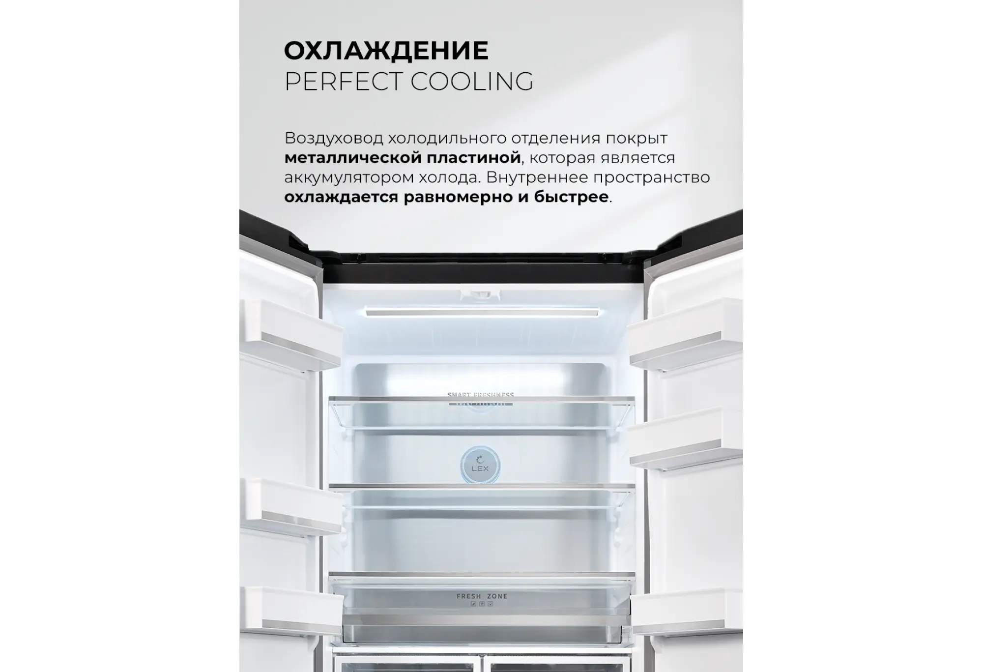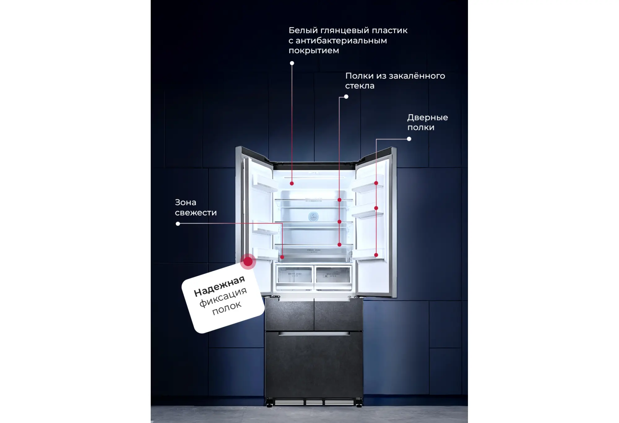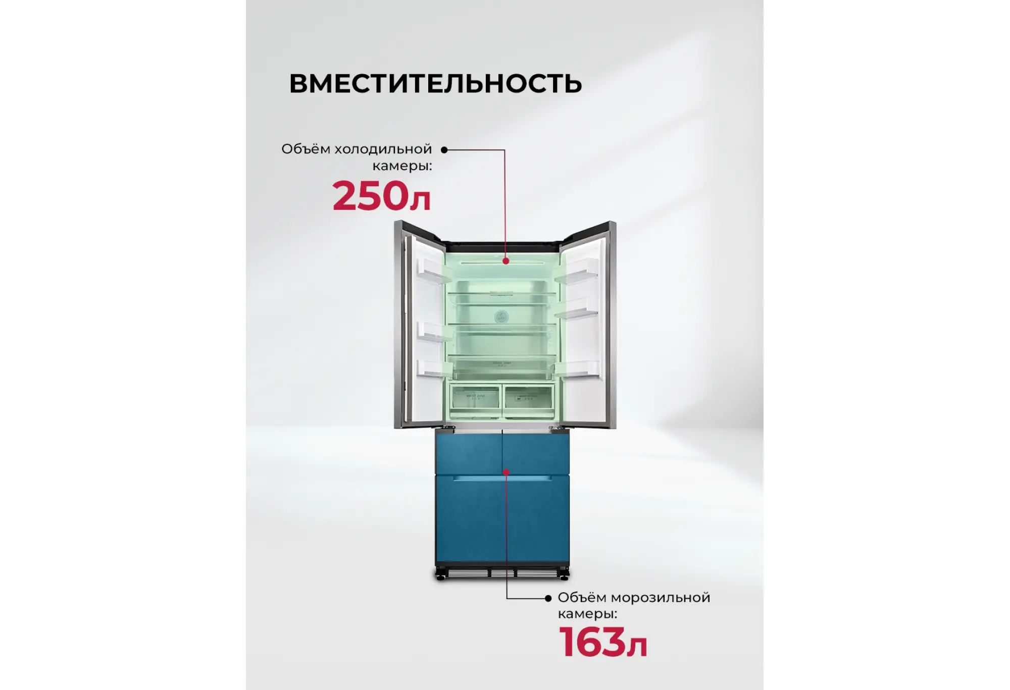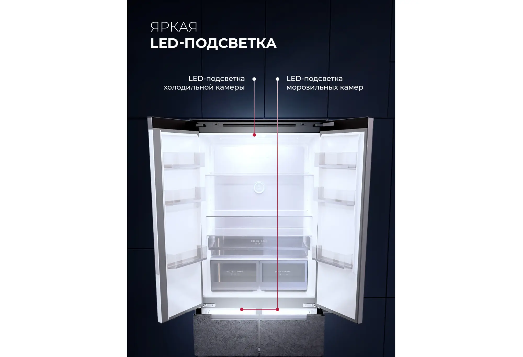 - Зоны с регулировкой температуры и влажности для разных продуктов