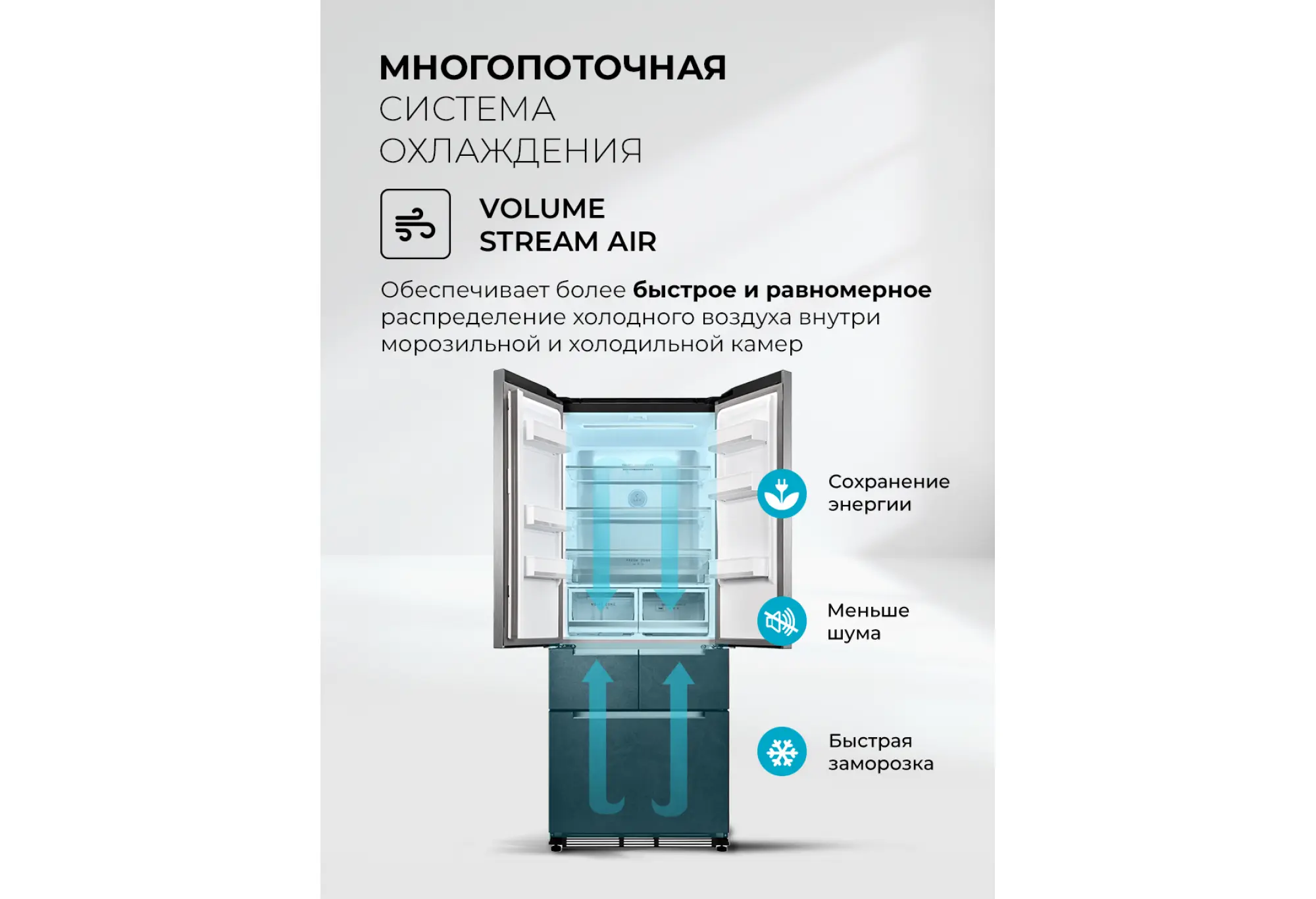 Модель оснащена инверторным компрессором, что способствует более стабильной работе и снижению уровня шума — 37 дБ комфортно для установки на кухне-студии. Три независимых контура охлаждения с отдельной регулировкой позволяют гибко настраивать температуру в разных зонах, поддерживая оптимальные условия для разных типов продуктов. В холодильной и морозильной камерах реализована система No Frost, поэтому образование льда и иней на стенках сведено к минимуму, а необходимость ручной разморозки отпадает.