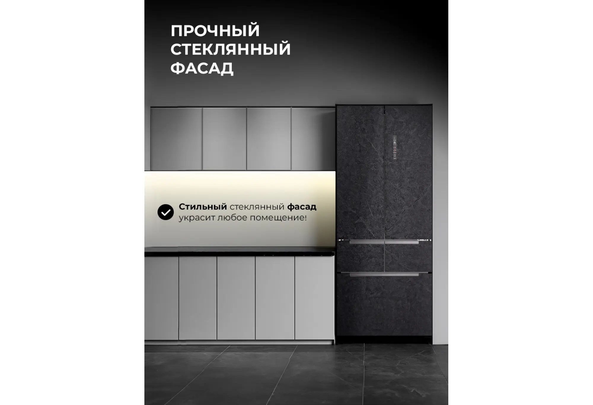 - Каменно-серая стеклянная дверца для современного кухонного интерьера