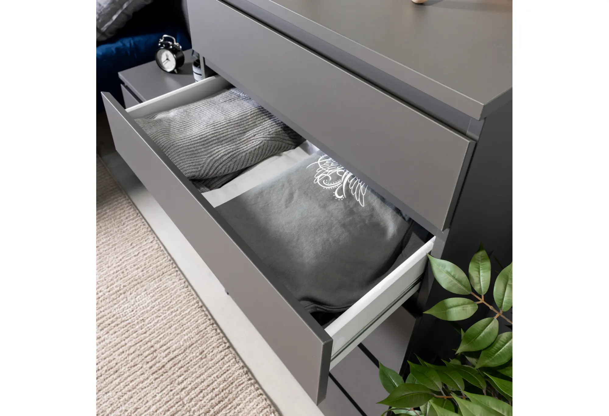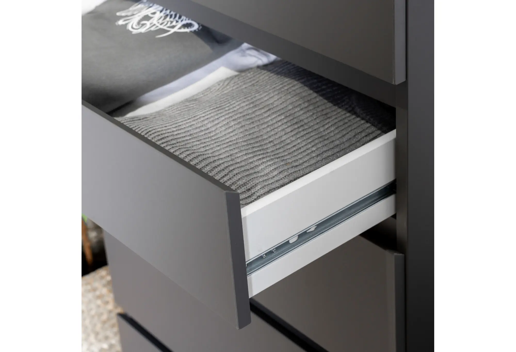 Комод КАСТОР в сером цвете — компактное и функциональное решение для хранения в спальне, гостиной или прихожей. Пять выдвижных ящиков позволяют удобно разложить одежду, бельё, документы и мелкие вещи, поддерживая порядок в комнате. Продуманная высота делает комод удобным и для ежедневного использования, и для размещения сверху декора, оргтехники или необходимых под рукой предметов.