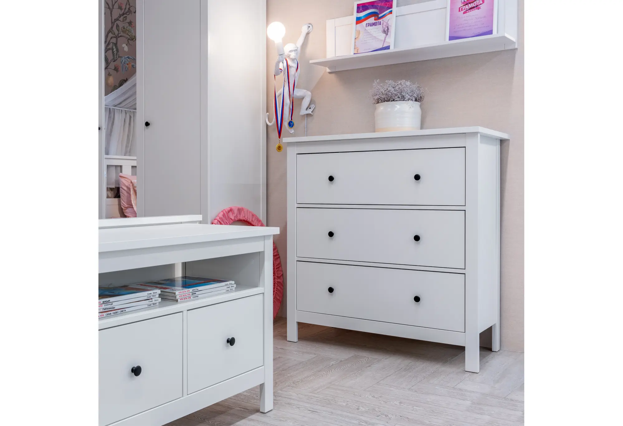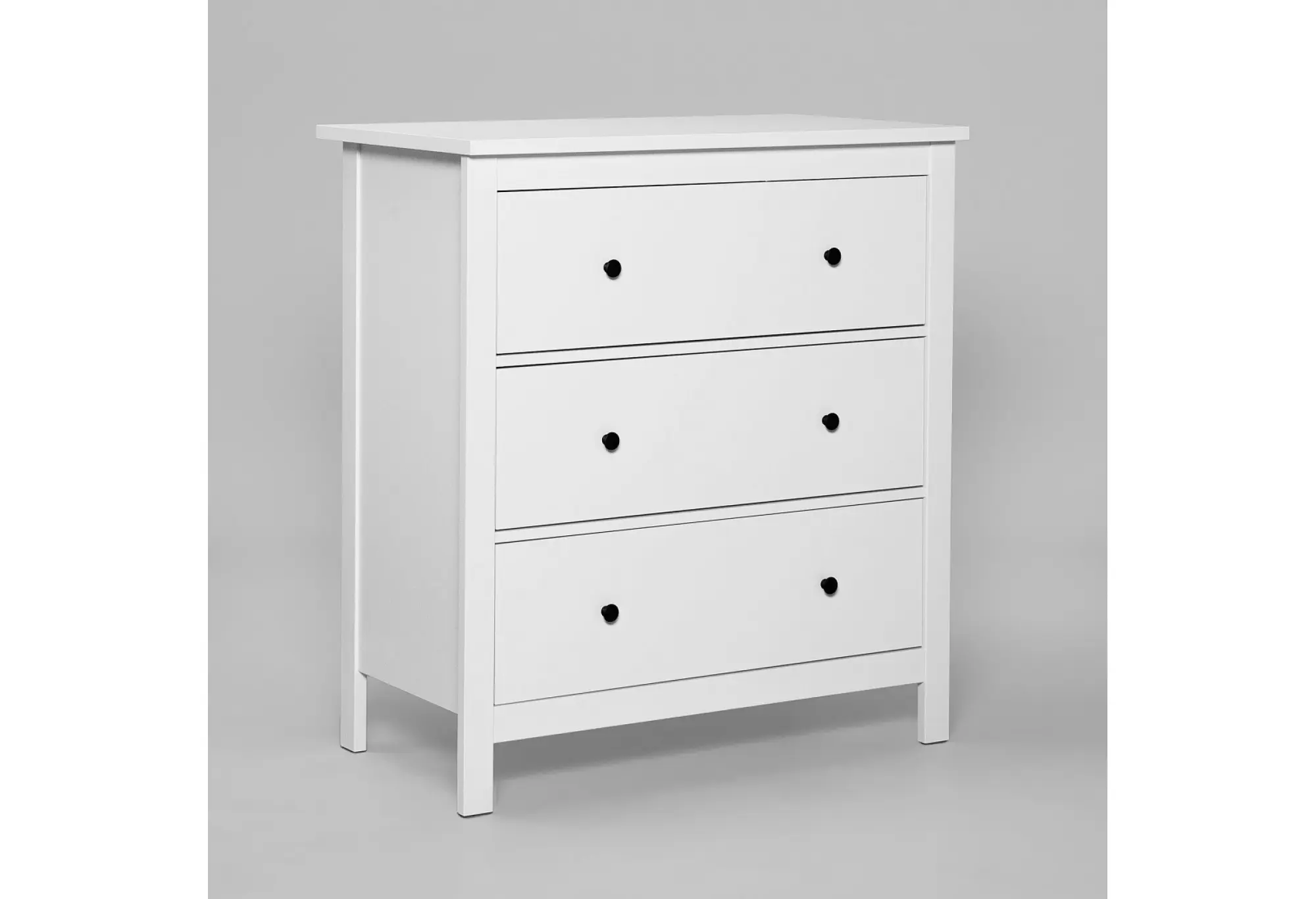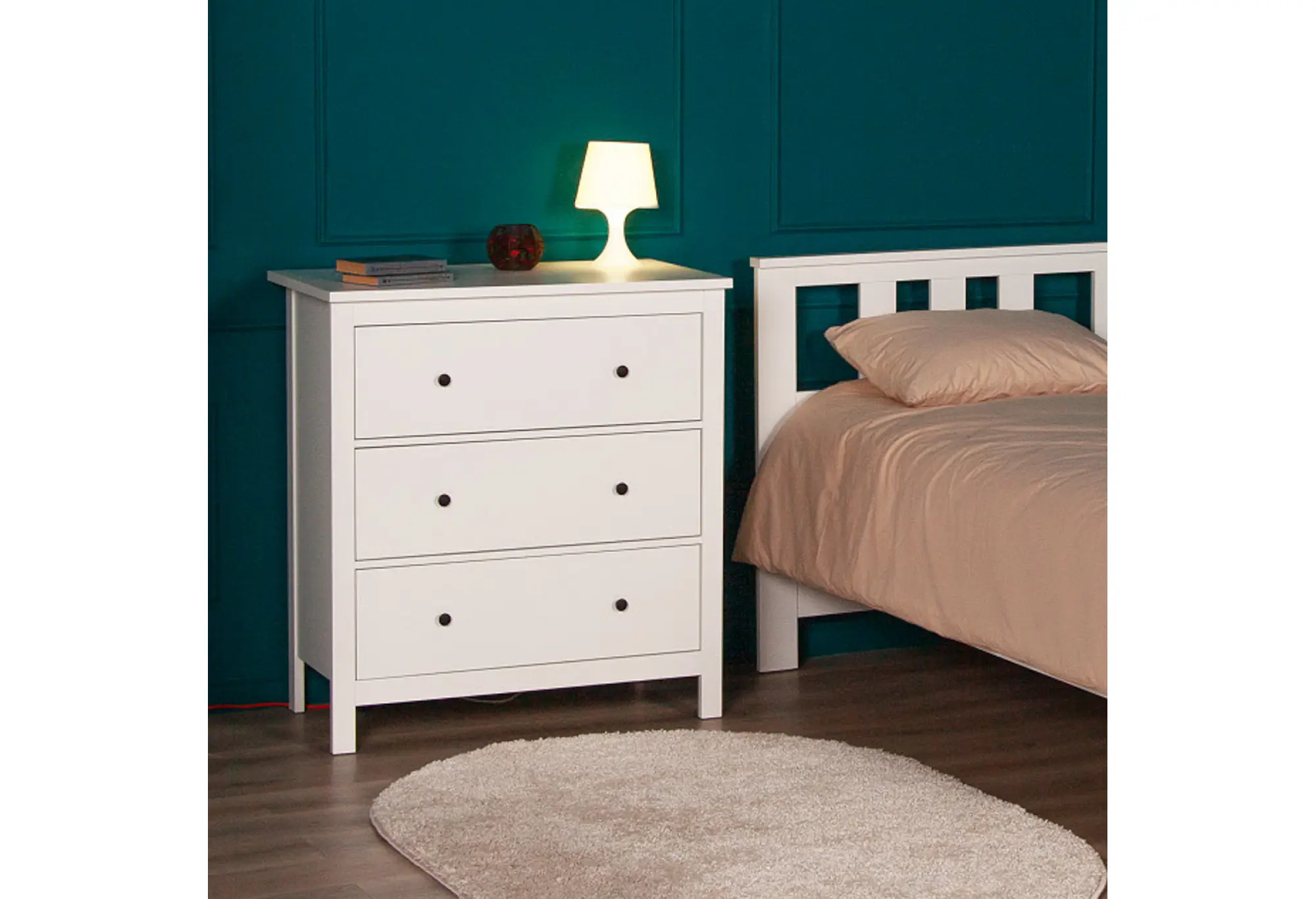 Комод с тремя вместительными ящиками в белом цвете — практичное решение для спальни, детской или прихожей. Лаконичный дизайн с прямыми линиями и гладкими фасадами легко вписывается в современные и классические интерьеры. Нейтральный белый оттенок визуально облегчает пространство и помогает создать аккуратный, упорядоченный вид комнаты.