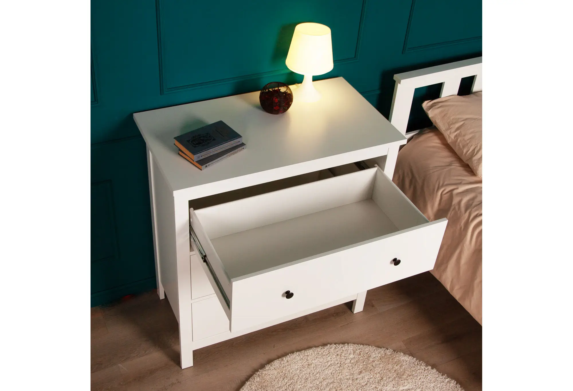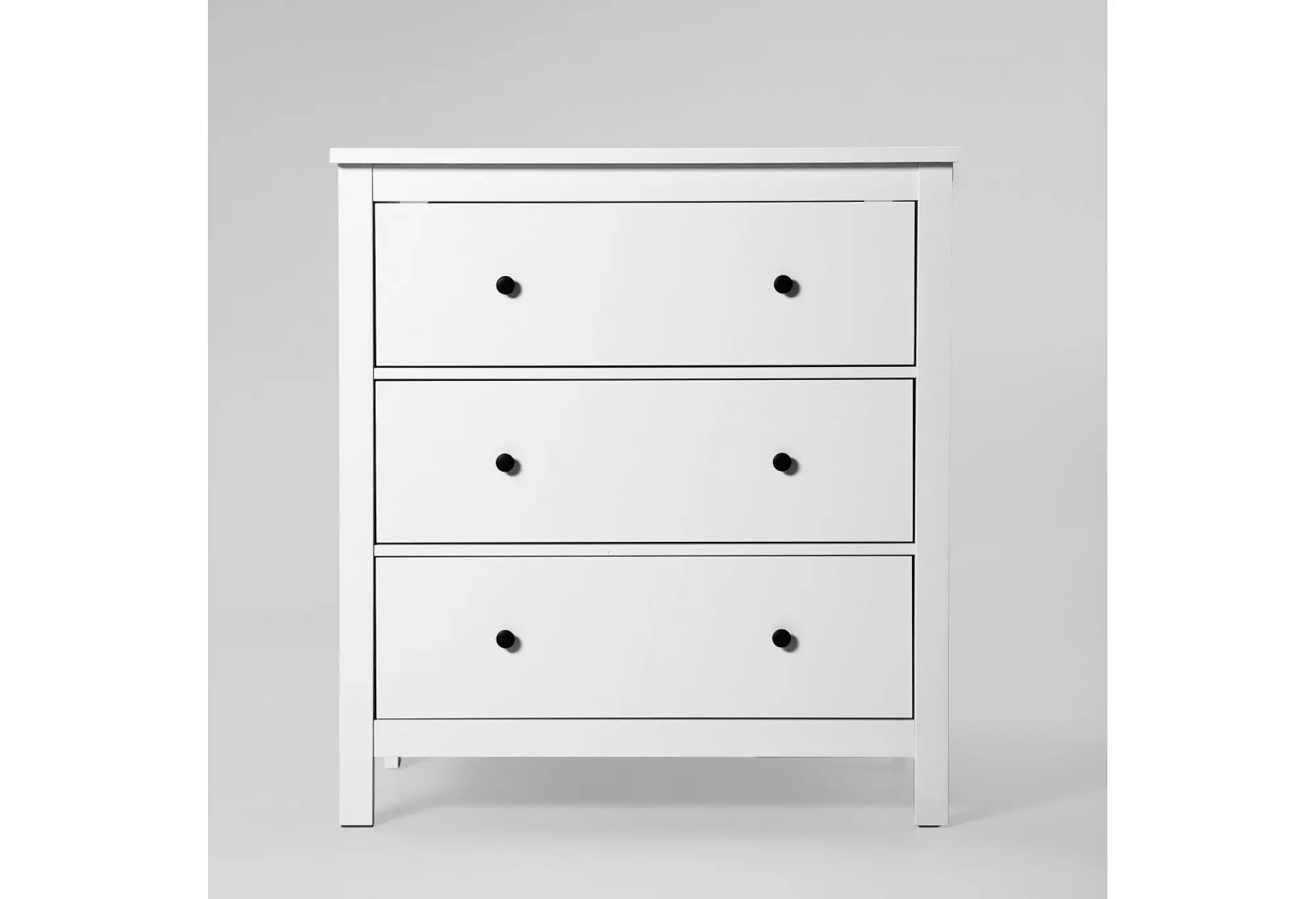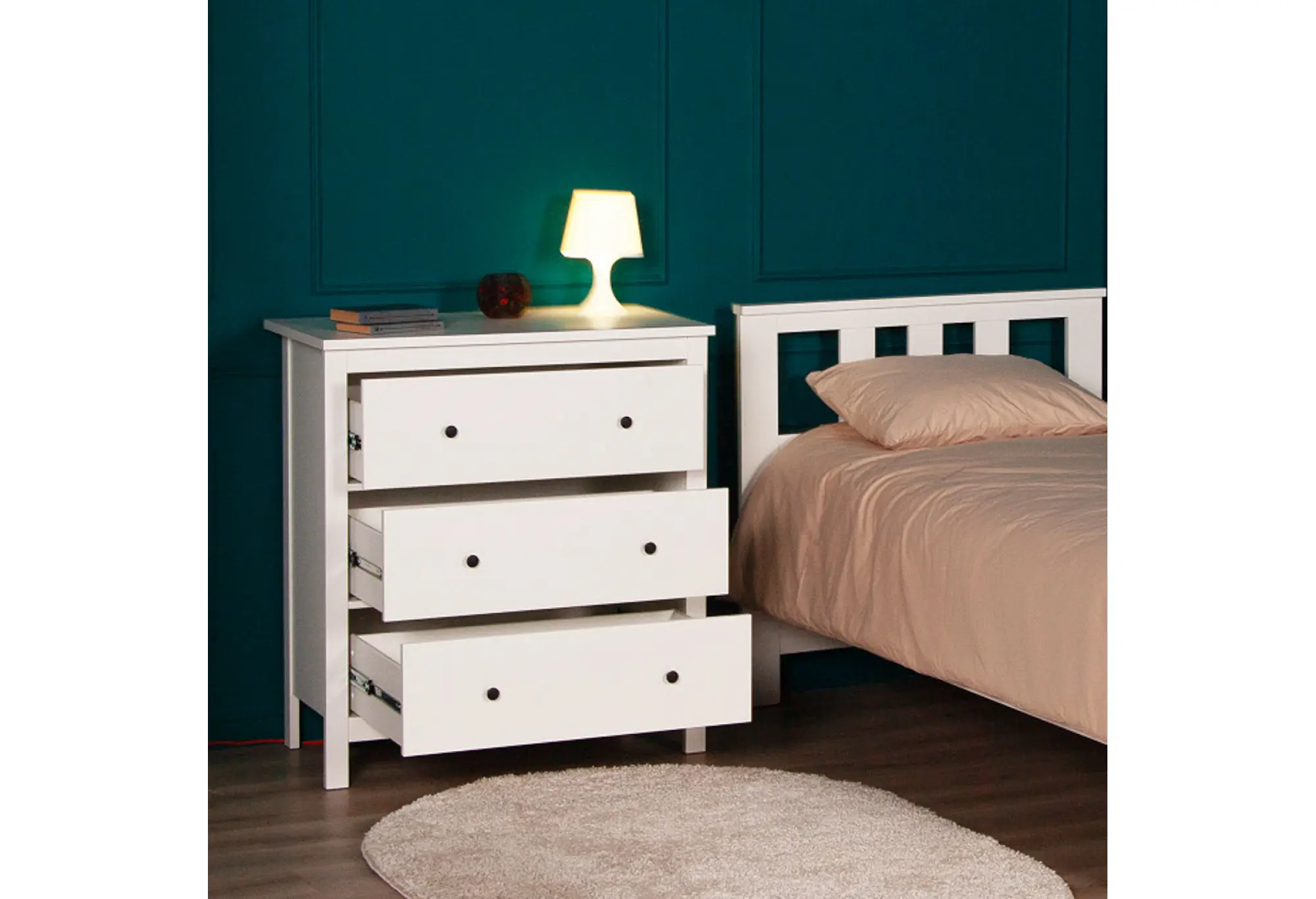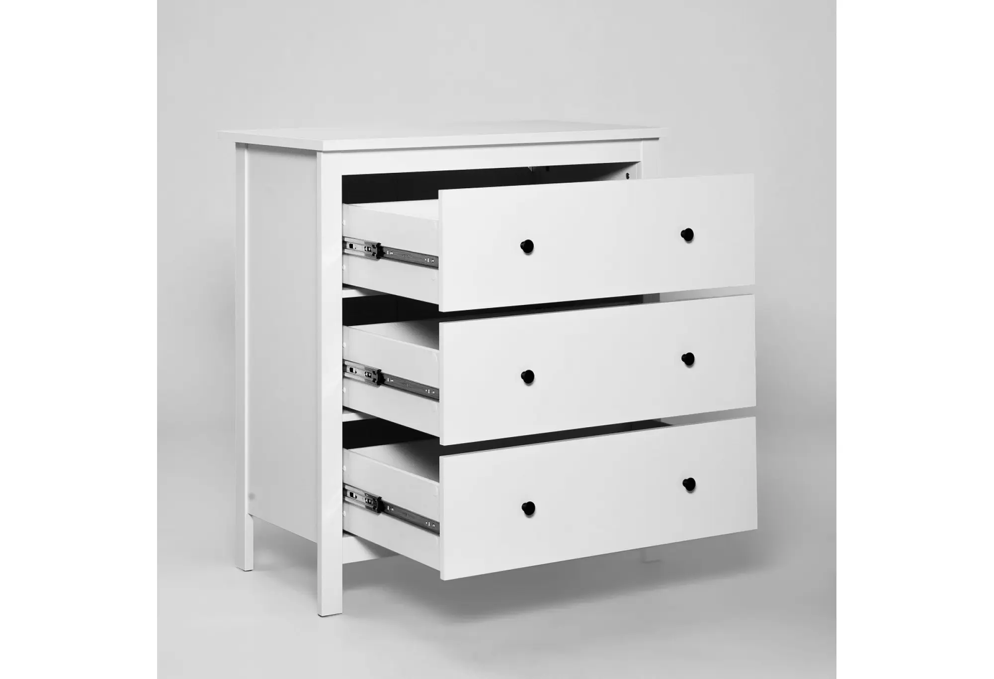 Комод с тремя вместительными ящиками в белом цвете — практичное решение для спальни, детской или прихожей. Лаконичный дизайн с прямыми линиями и гладкими фасадами легко вписывается в современные и классические интерьеры. Нейтральный белый оттенок визуально облегчает пространство и помогает создать аккуратный, упорядоченный вид комнаты.