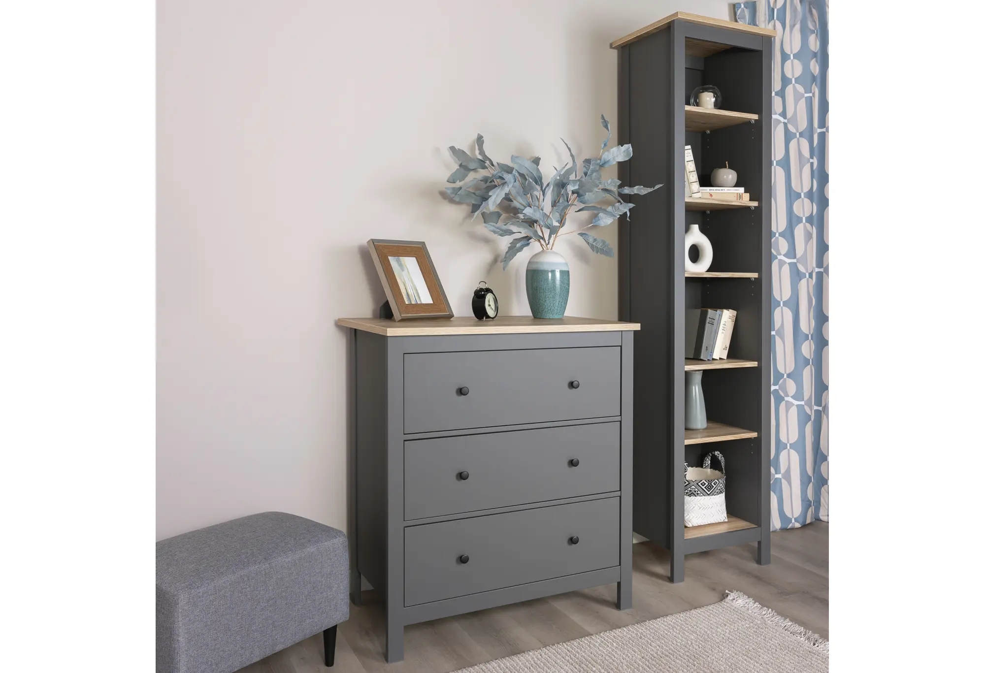 Комод с тремя ящиками из коллекции «САГА» выполнен в сочетании благородного серого цвета и оттенка ясеня. Лаконичный дизайн с ровными фасадами и аккуратными круглыми ручками легко впишется в современный интерьер спальни, гостиной или прихожей. Контрастная столешница под ясень визуально «облегчает» конструкцию и добавляет интерьеру естественных спокойных акцентов.