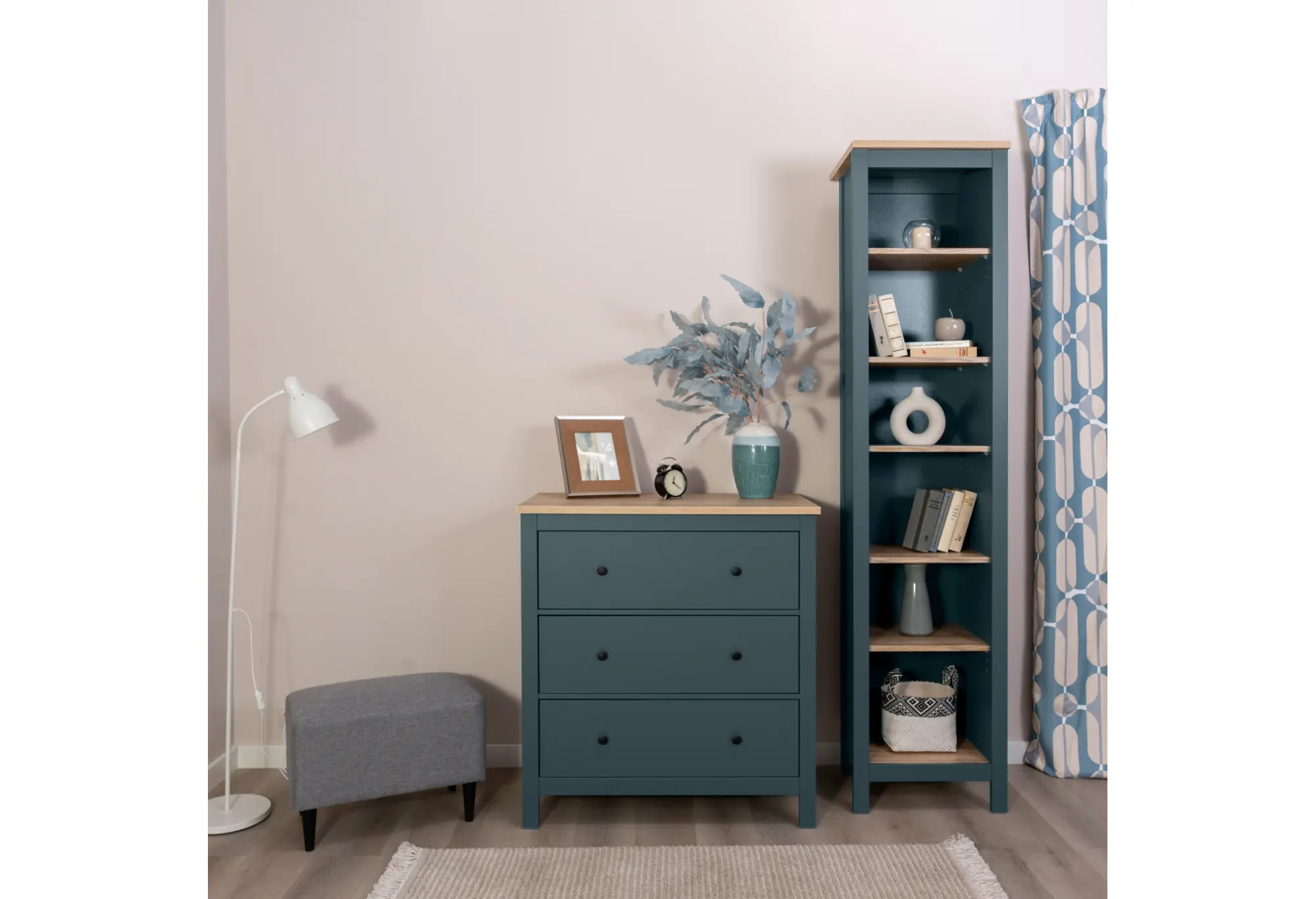 Комод из коллекции «САГА» сочетает лаконичный дизайн и практичность для повседневного использования. Корпус выполнен из ДСП и выдержан в темно-бирюзовом цвете, который визуально подчеркивает строгие прямые линии и аккуратные пропорции. Столешница под ясень создает спокойный контраст и добавляет изделию визуальную теплоту, хорошо вписываясь как в современные интерьеры, так и в более классическое оформление комнаты.