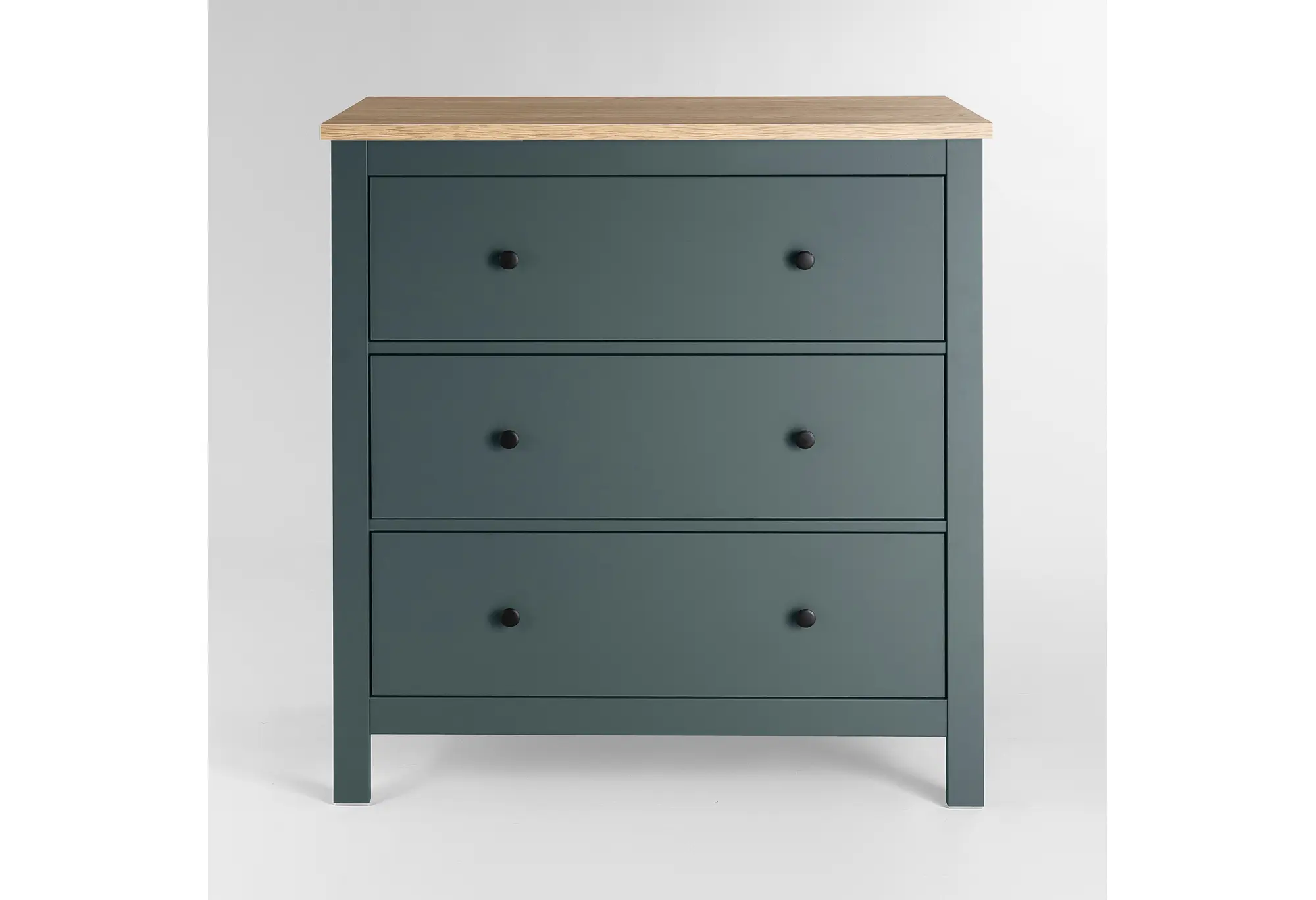 Три выдвижных ящика образуют ровный фасад с симметричным расположением небольших круглых ручек, что делает внешний вид комода опрятным и собранным. Габариты 920x510x1007 мм позволяют разместить его как в спальне, так и в гостиной или прихожей, он не занимает много места по ширине, но при этом обеспечивает полезное пространство для хранения одежды, белья или других вещей. Прямые опорные стойки по углам корпуса создают впечатление устойчивой конструкции и подчеркивают геометрию модели.