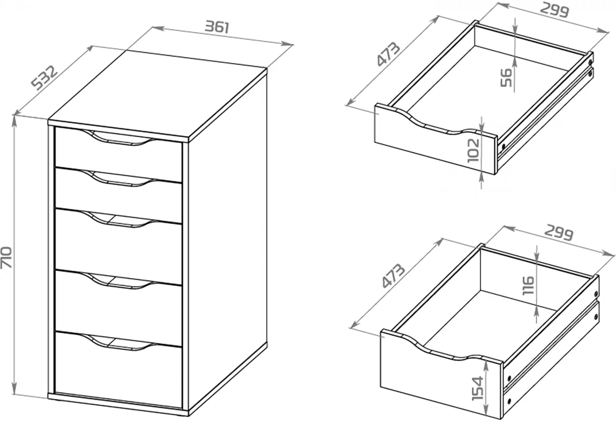 - Пять ящиков переменной высоты для разнопланового хранения
