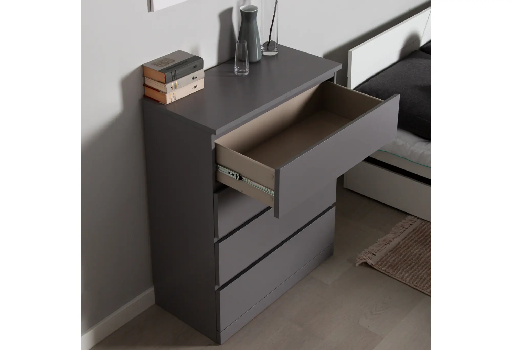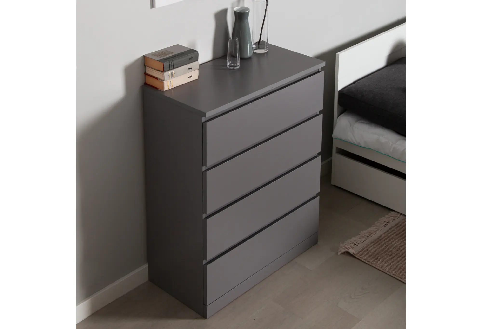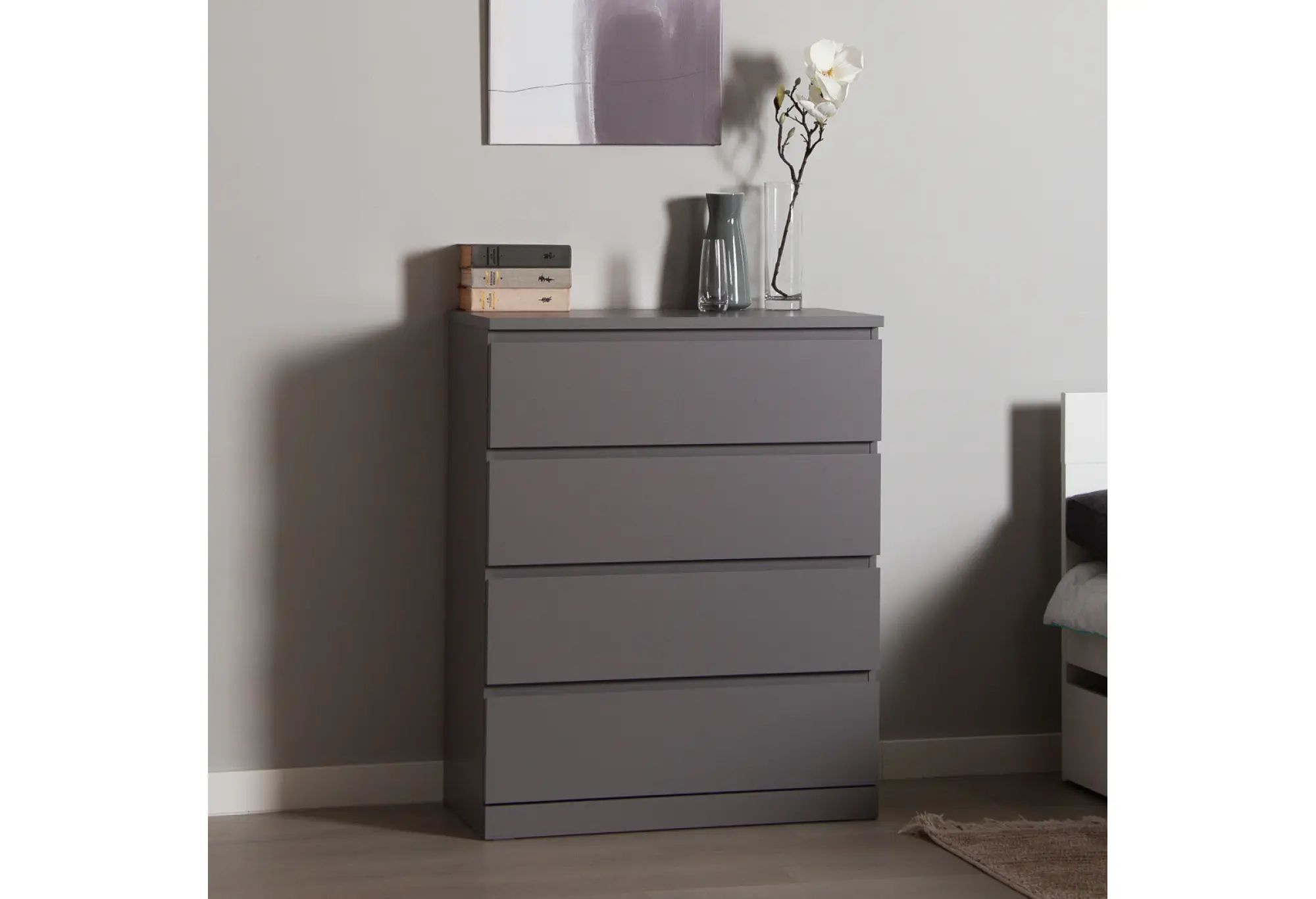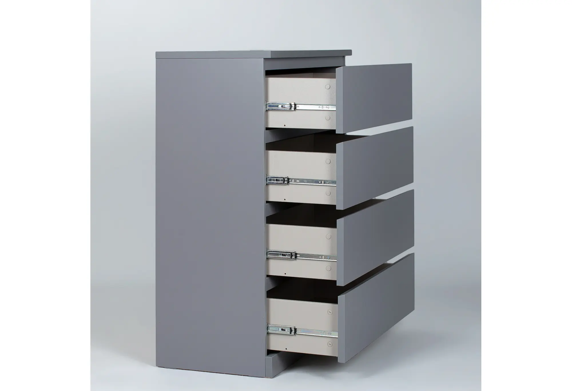 Комод Варма 4 в сером цвете — лаконичное и практичное решение для современной квартиры. Компактная глубина и удобная высота позволяют разместить его в спальне, гостиной, прихожей или рабочем кабинете, не перегружая пространство. Четыре выдвижных ящика обеспечивают удобное хранение повседневных вещей, одежды, белья или документов, помогая поддерживать порядок.