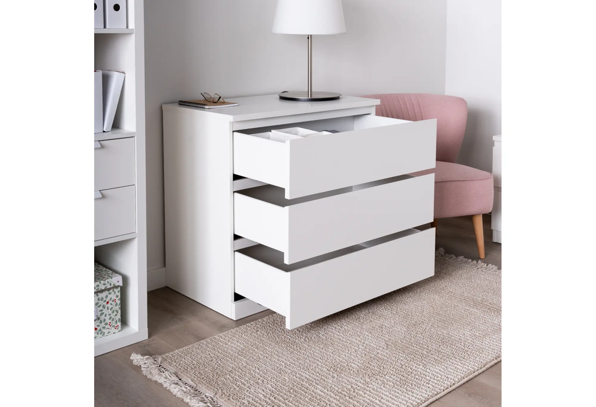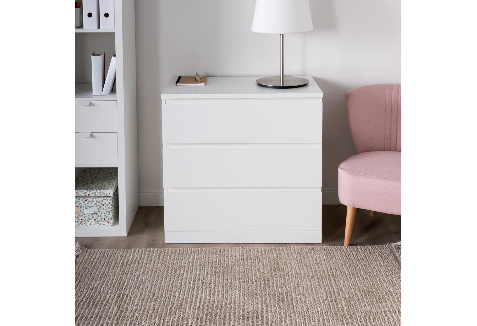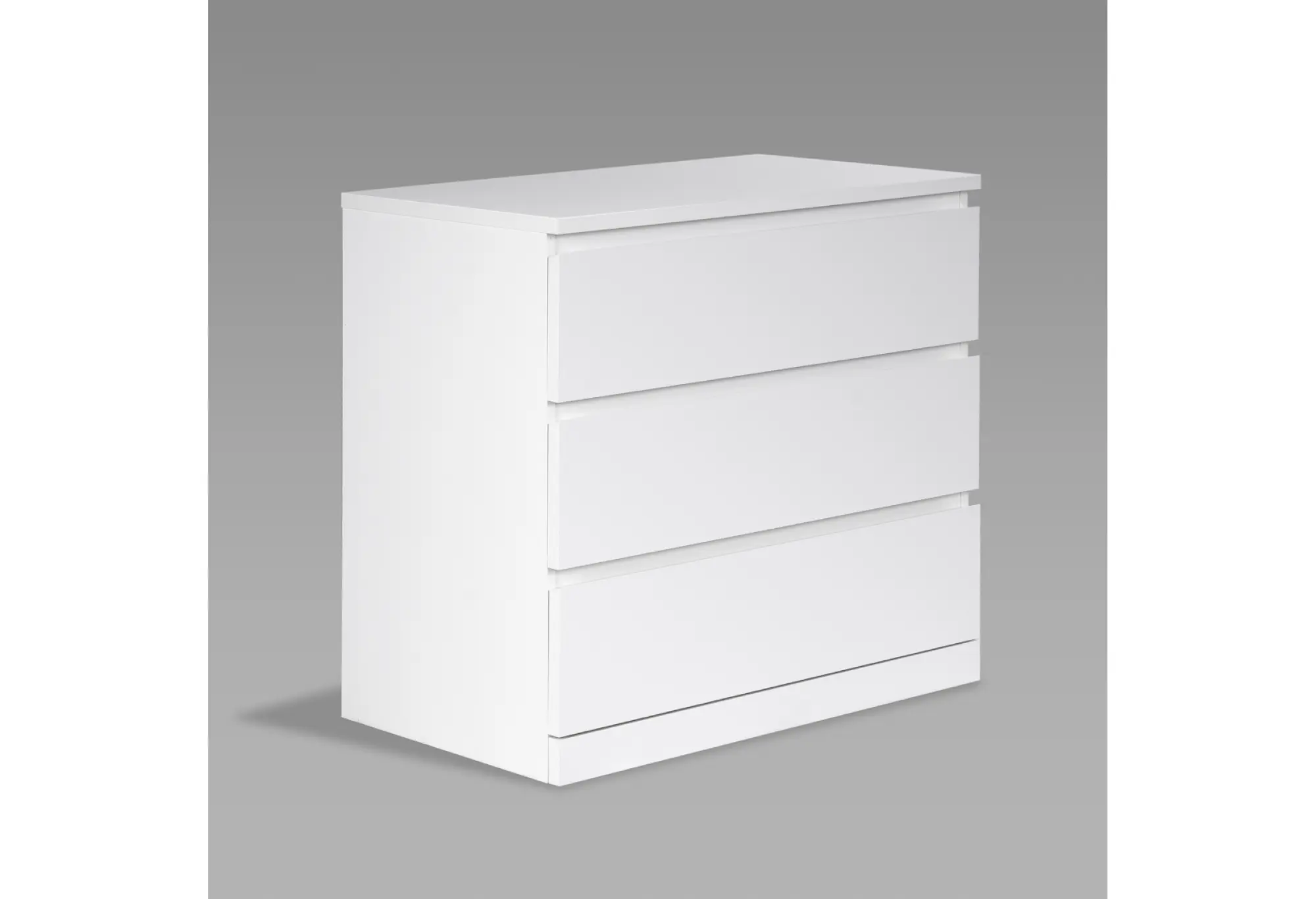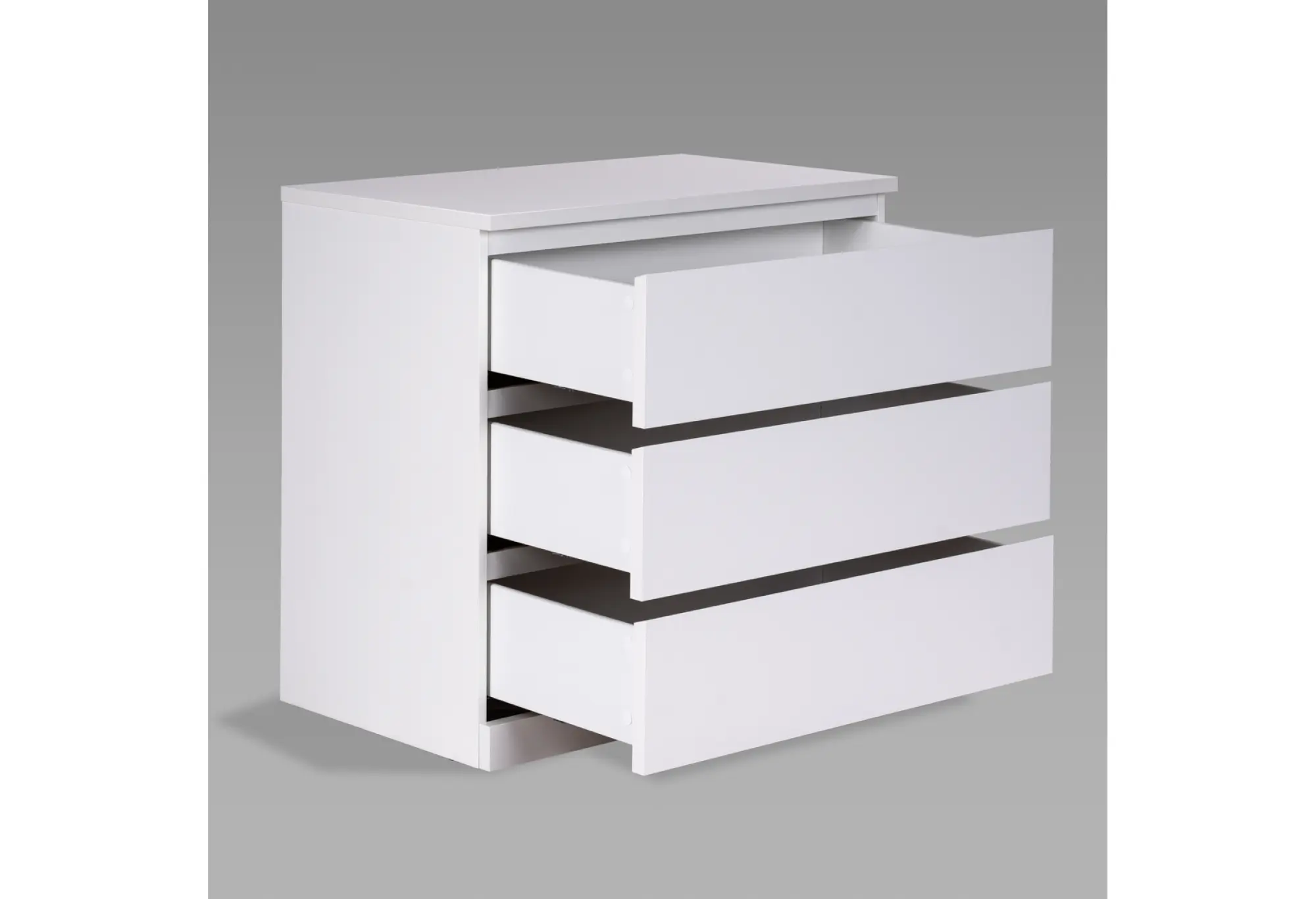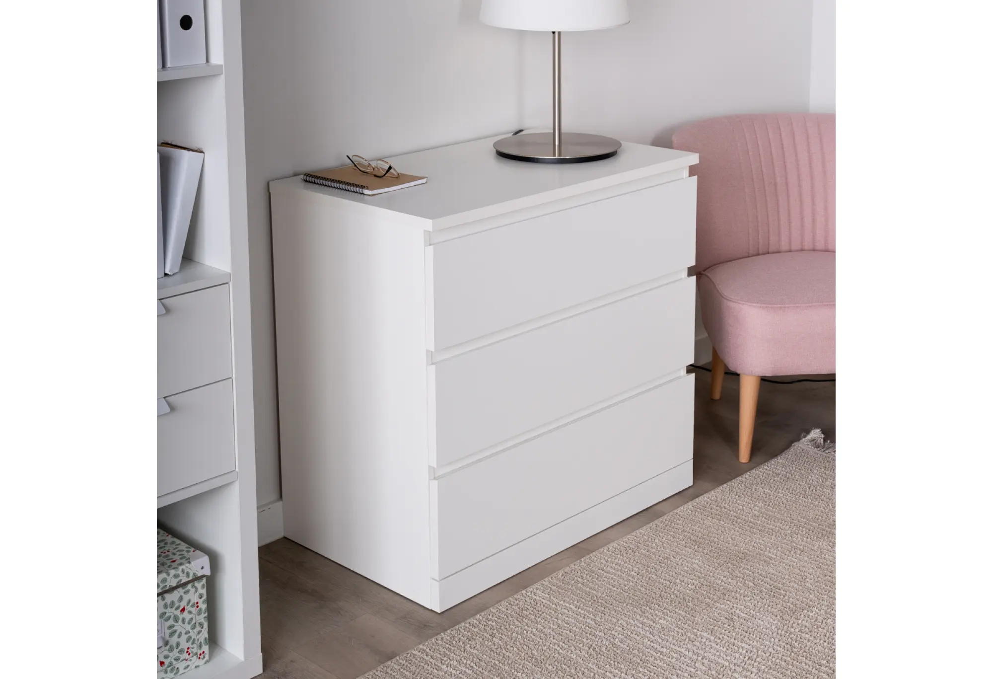 Лаконичный белый комод на три выдвижных ящика прекрасно впишется в современный интерьер спальни, гостиной или прихожей. Прямые линии, гладкие поверхности и отсутствие лишнего декора подчеркивают аккуратный, современный характер модели. Белый цвет визуально облегчает конструкцию и помогает сохранить ощущение простора даже в небольшой комнате.