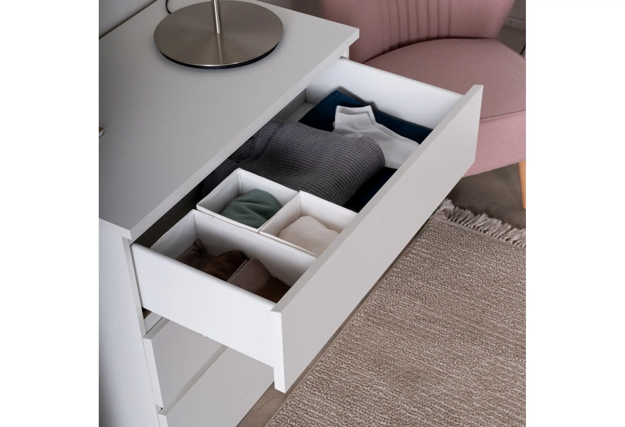 Корпус выполнен из ДСП и тамбурата, что позволяет сочетать устойчивость к повседневным нагрузкам и относительно небольшой вес. Широкая столешница комода удобна для размещения зеркала, светильника, боксов для мелочей или декоративных аксессуаров. Три вместительных выдвижных ящика обеспечивают упорядоченное хранение одежды, текстиля и других вещей, позволяя поддерживать визуальный порядок в помещении.