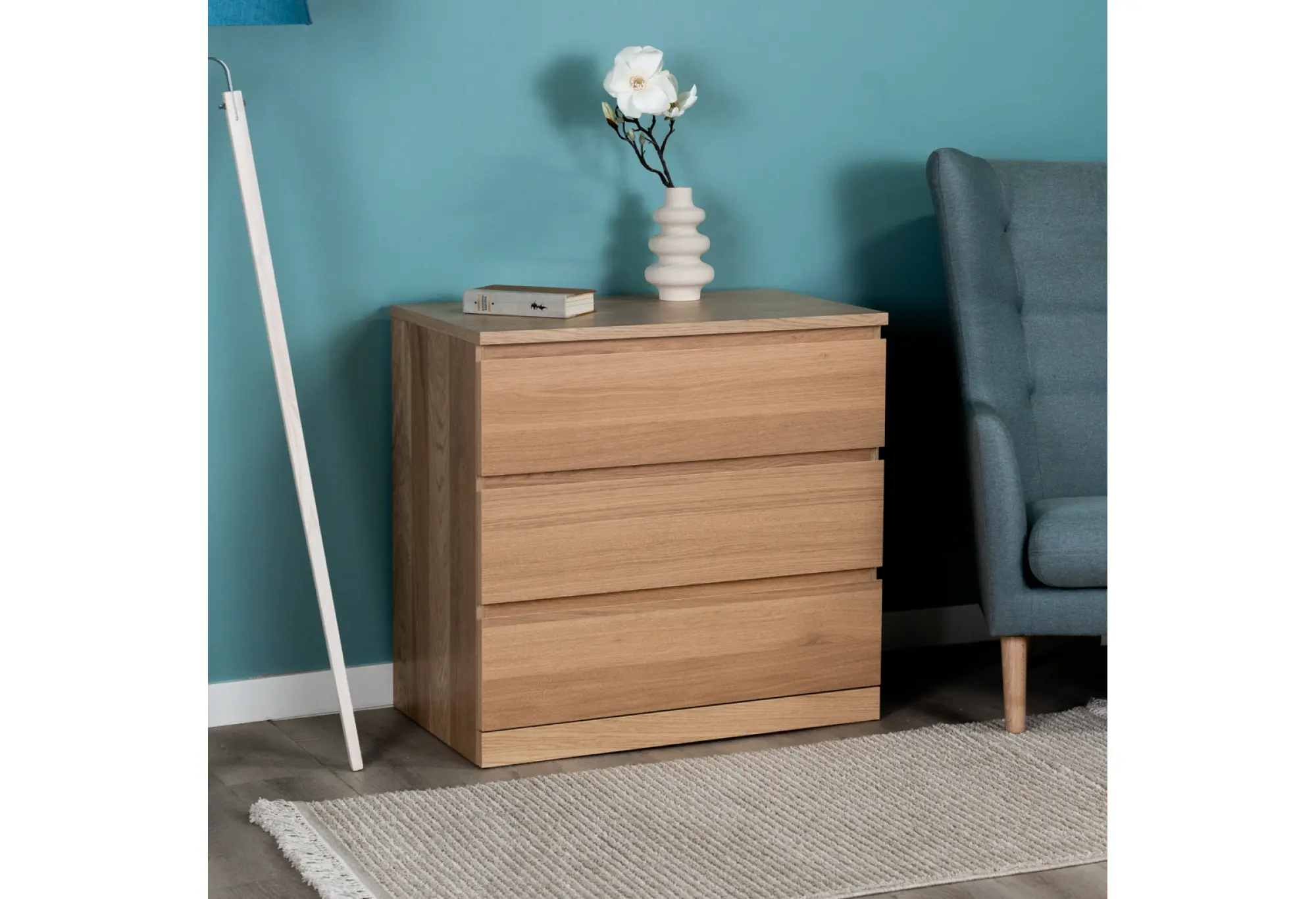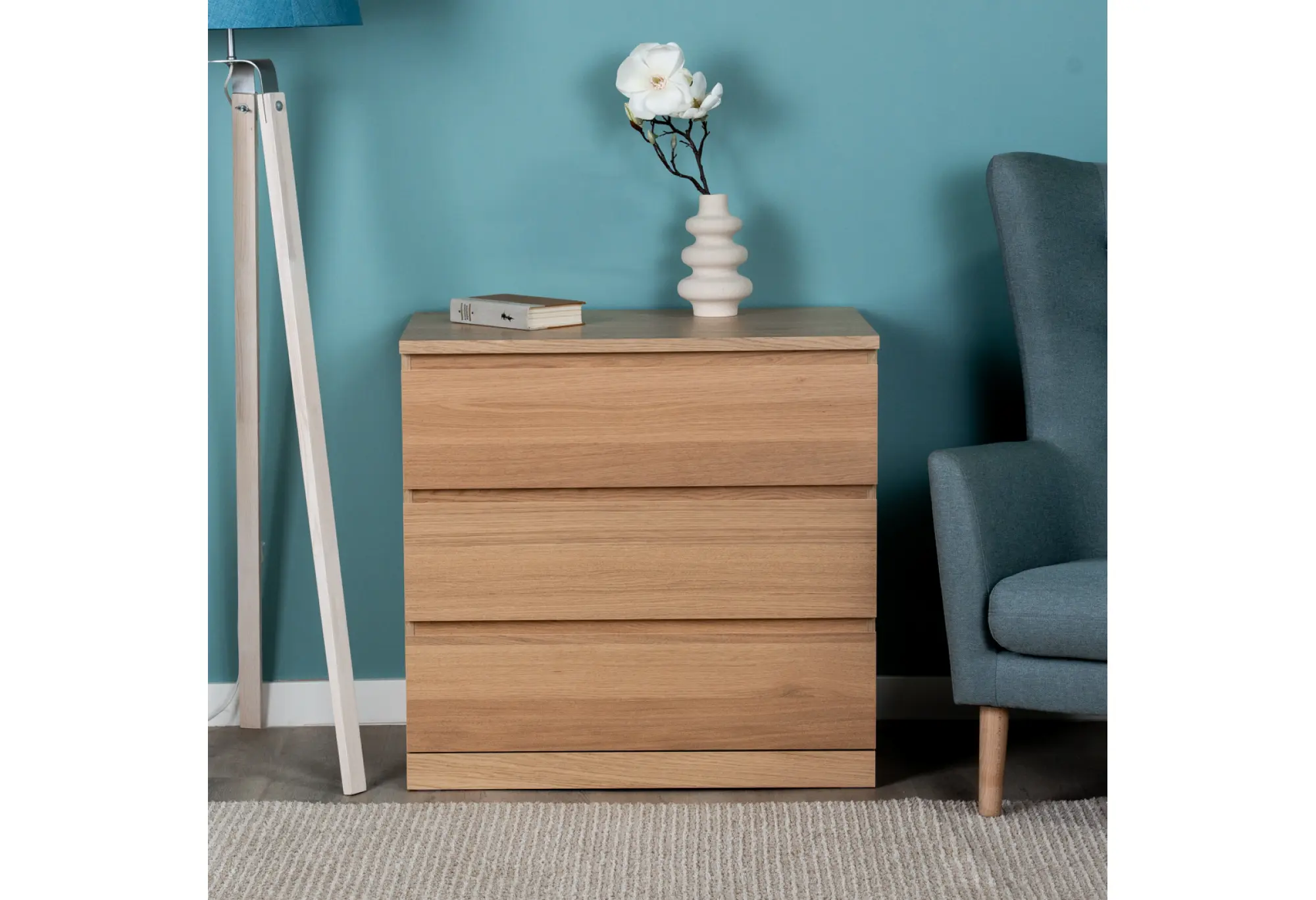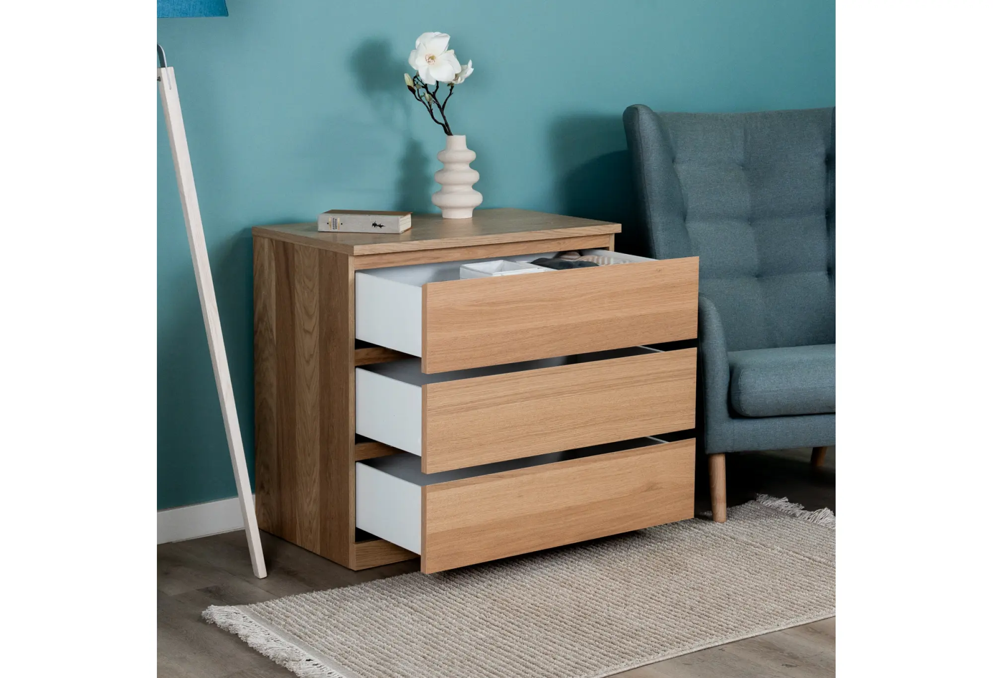 Комод с тремя выдвижными ящиками создан для тех, кому важны порядок и лаконичный дизайн. Компактные габариты позволяют разместить его в спальне, гостиной или прихожей, не перегружая пространство, а продуманная высота делает верхнюю поверхность удобной для хранения и декора.