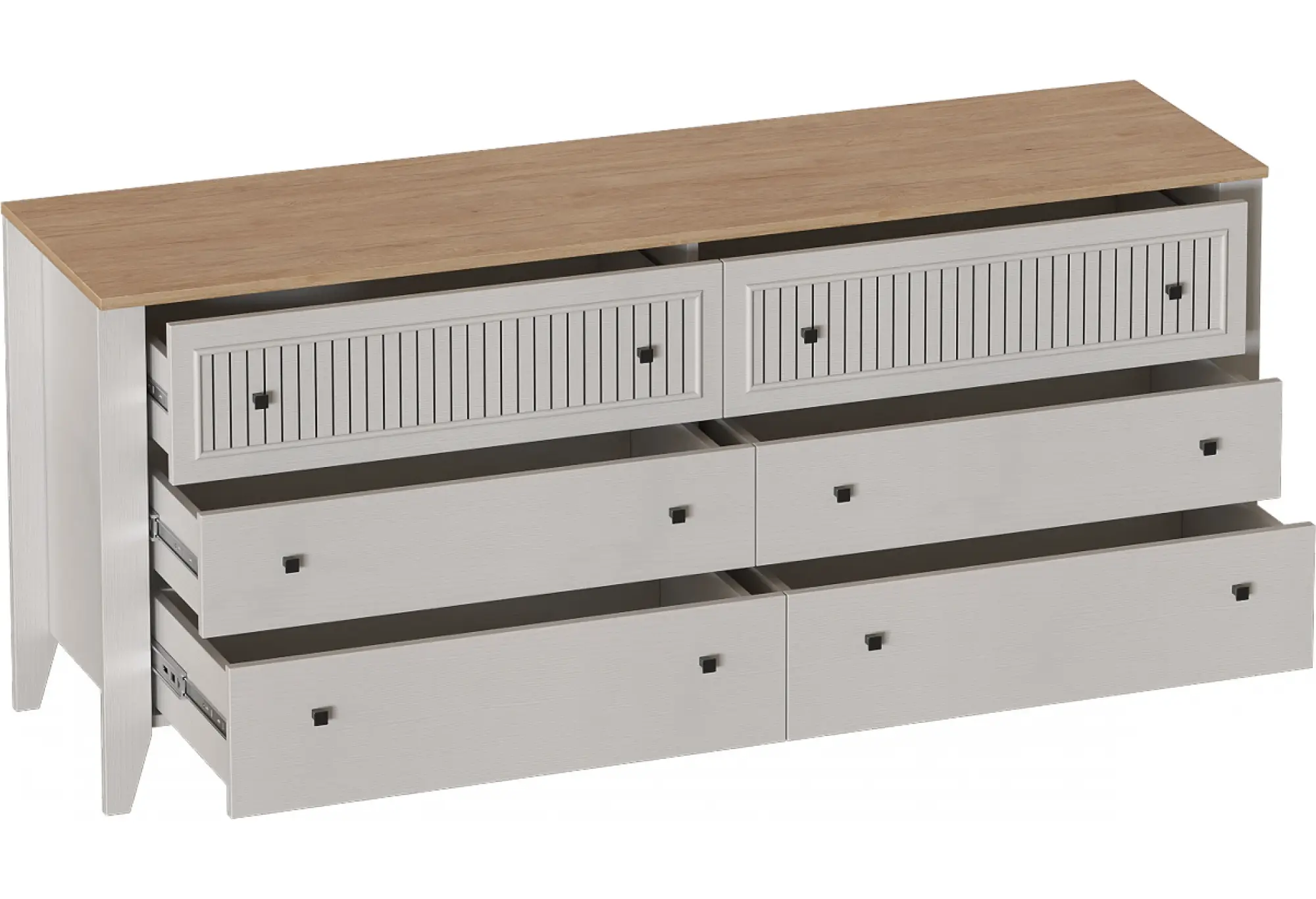 Комод "Валенсия" выполнен в комбинации Дуб натуральный светлый / Персидский жемчуг и состоит из выдвижных ящиков на шариковых направляющих (без амортизаторов), что позволяет удобно хранить вещи и поддерживать порядок в комнате. Он выполнен из безопасных, качественных материалов, что гарантирует долговечность и сохранение первоначального вида на протяжении долгого времени.