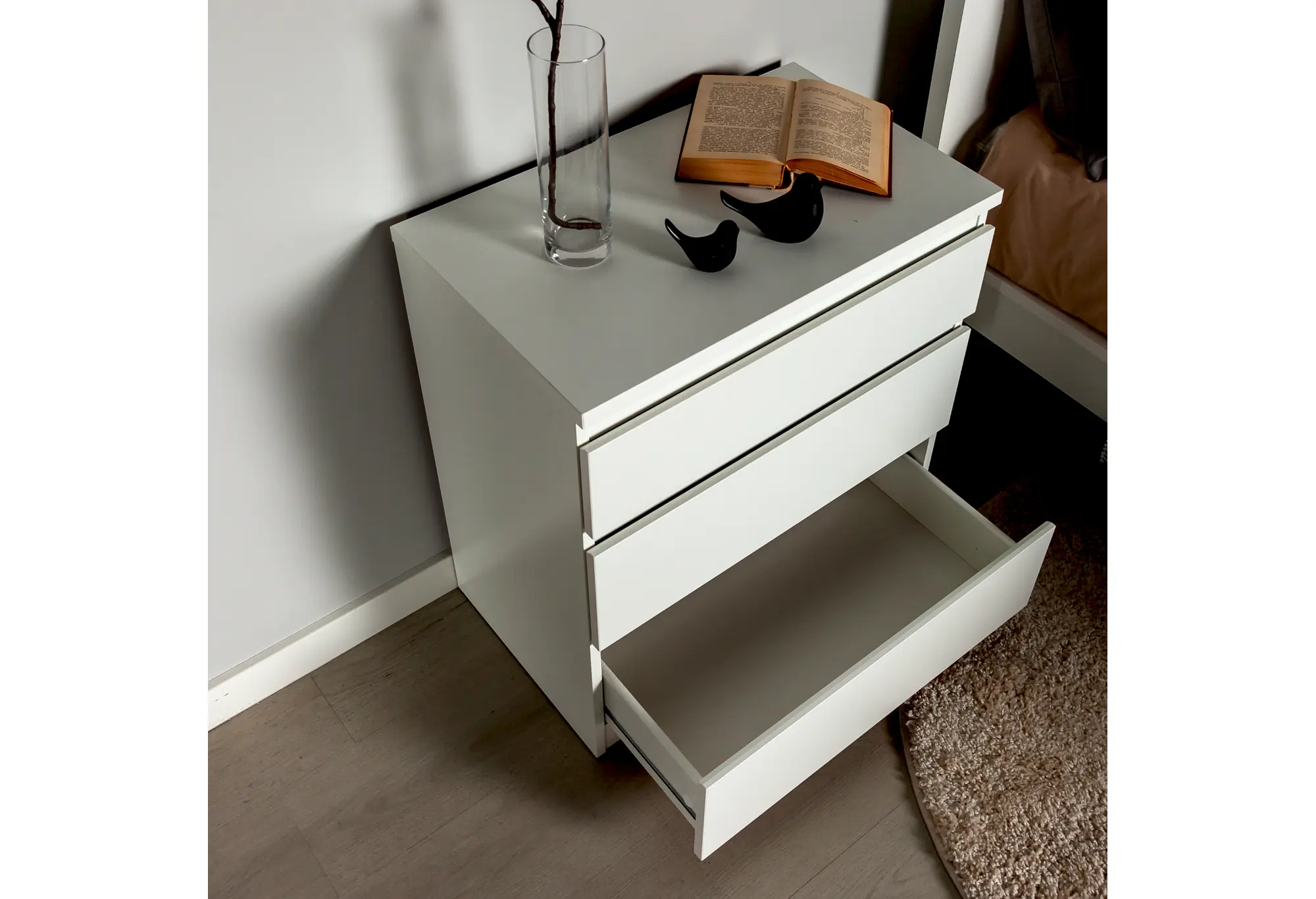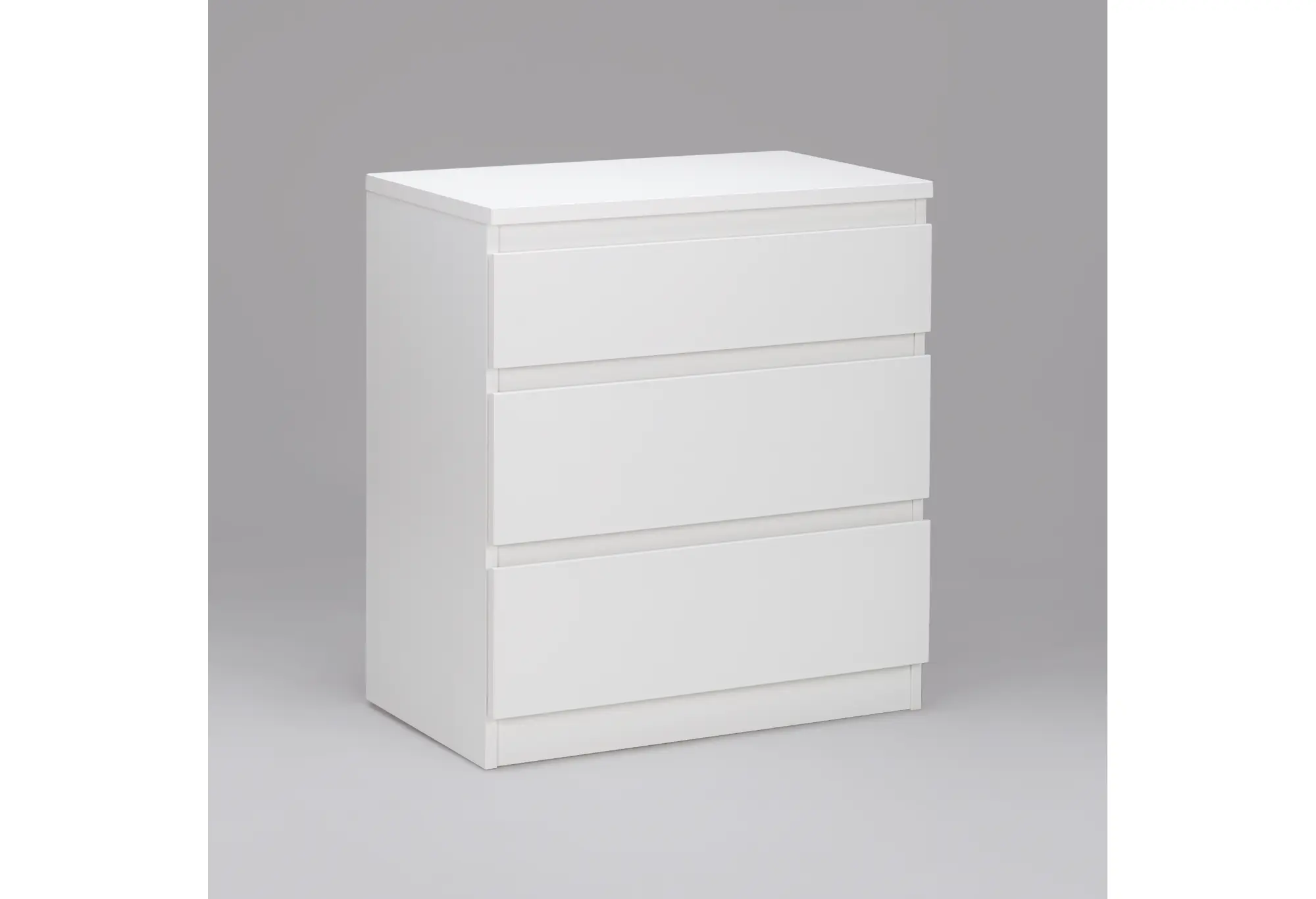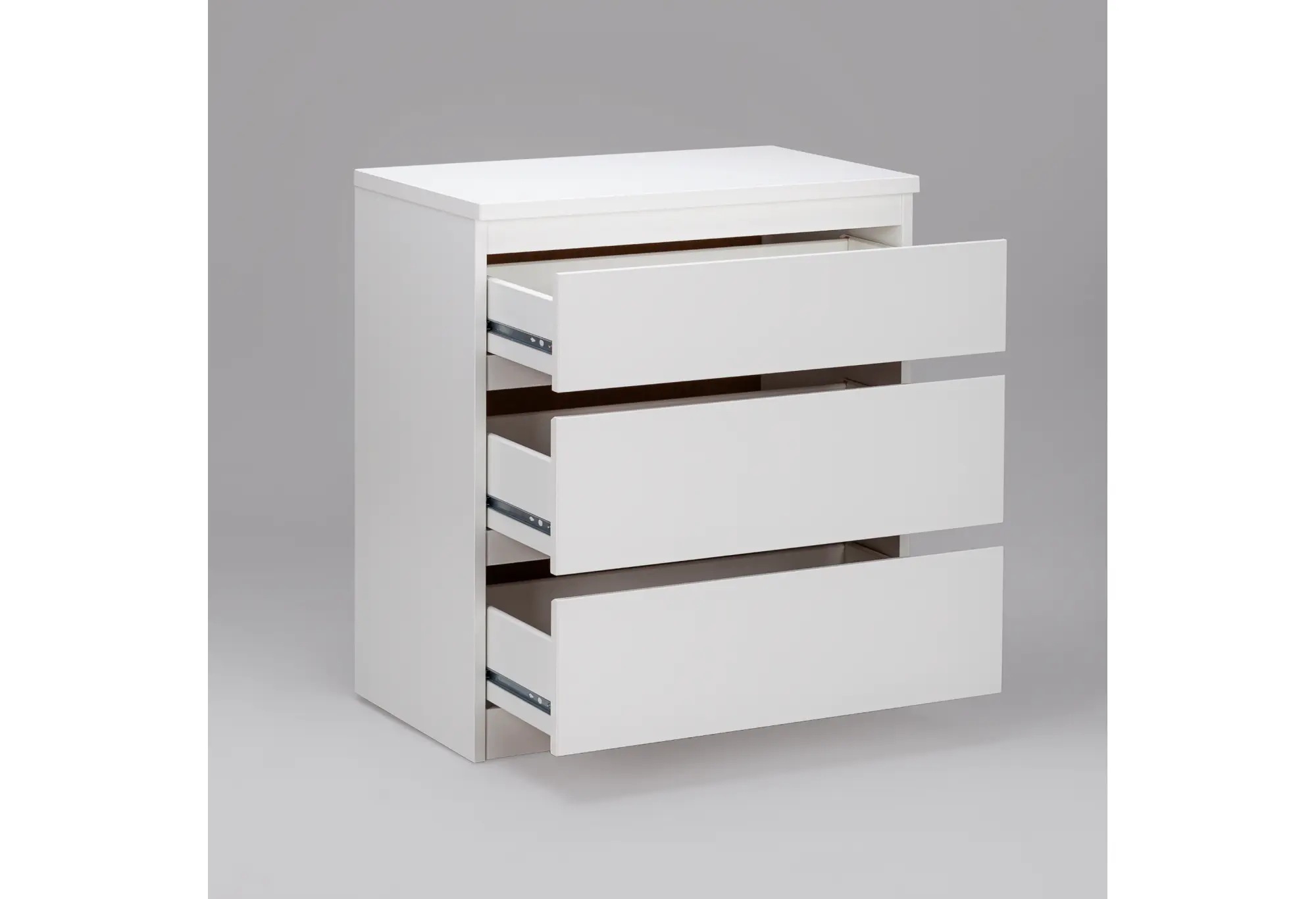 Комод оснащен тремя вместительными ящиками на шариковых направляющих, что обеспечивает плавное и бесшумное открытие. Каждый ящик выдерживает нагрузку до 8 кг, что позволяет удобно хранить повседневные вещи и аксессуары. Минималистичный дизайн без лишних деталей подчеркнет современный стиль вашего дома.