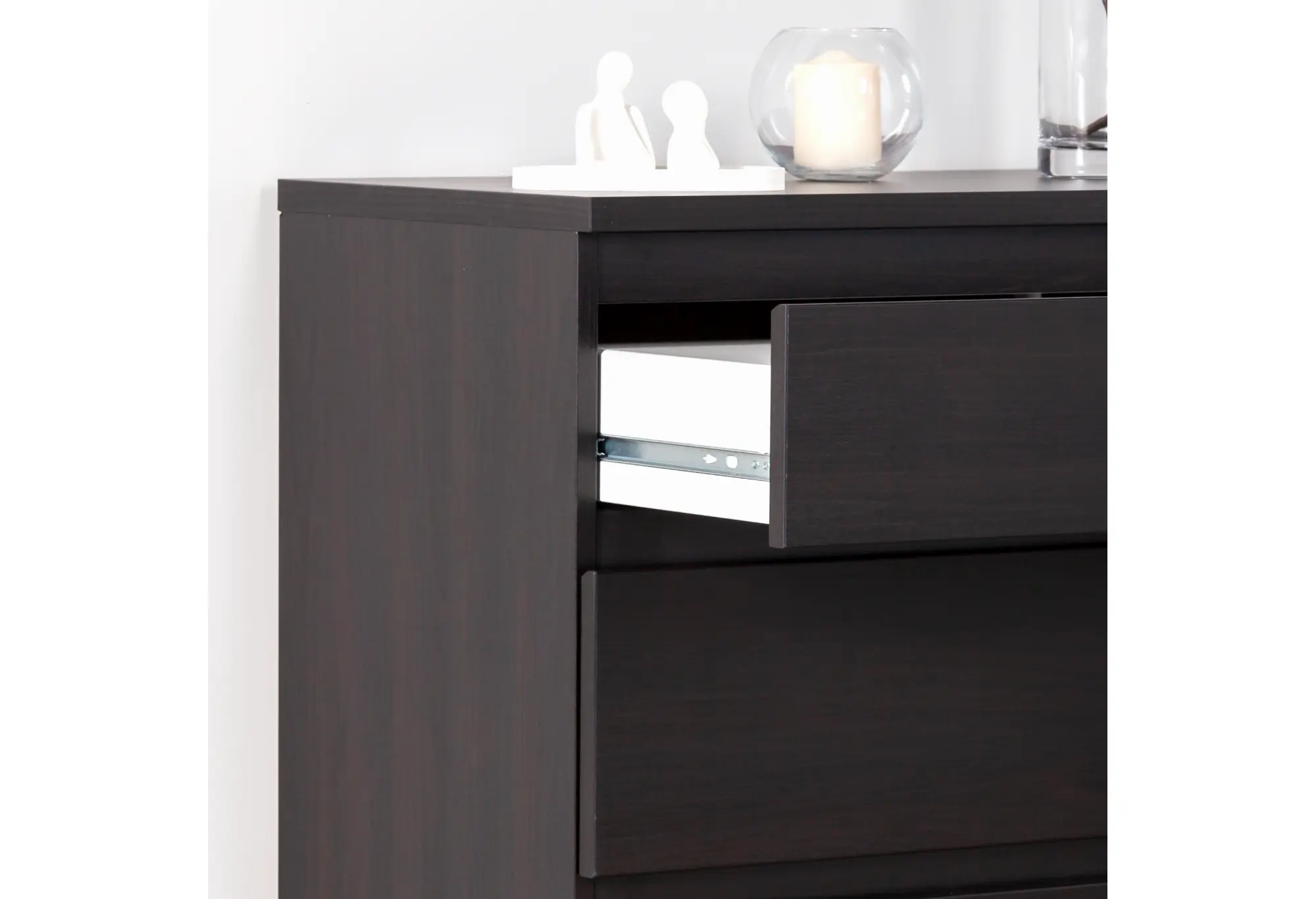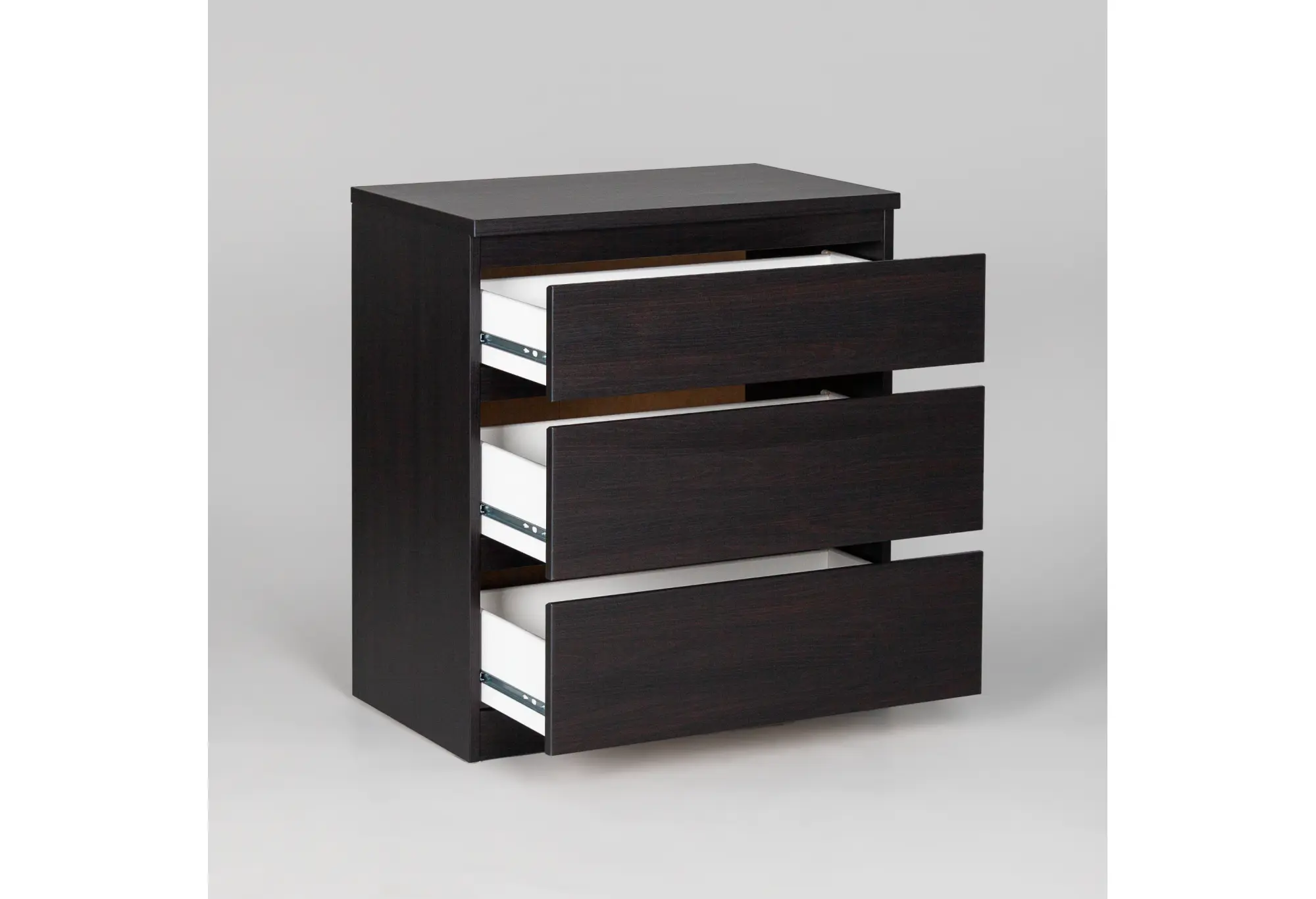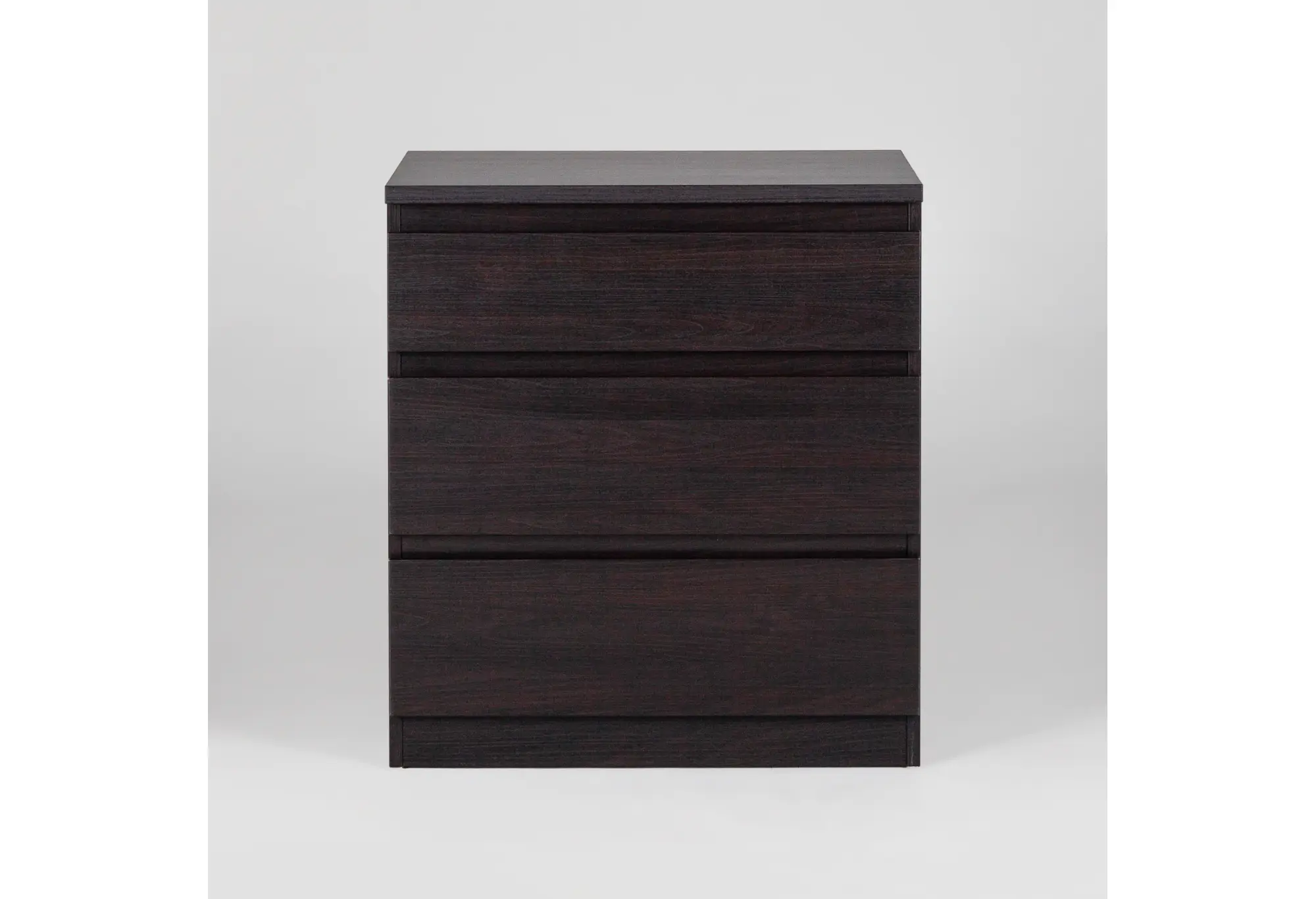 Три вместительных ящика расположены по всей ширине корпуса и образуют ровный монолитный фасад. Благодаря шариковым направляющим ящики выдвигаются плавно и устойчиво, что позволяет удобно пользоваться внутренним пространством при равномерной нагрузке до 8 кг на каждый ящик. Поверхность комода можно использовать как дополнительную зону для хранения или размещения необходимых предметов — от текстиля до аксессуаров. Компактные габариты 650x396x716 мм помогают рационально использовать пространство, сохраняя при этом достаточный объем для повседневных вещей.