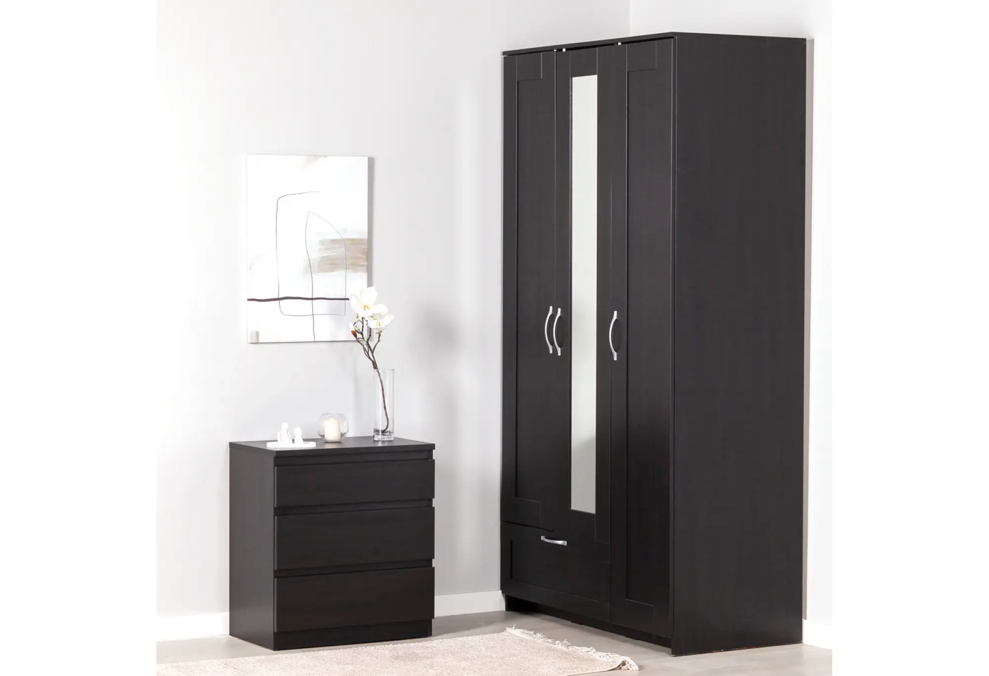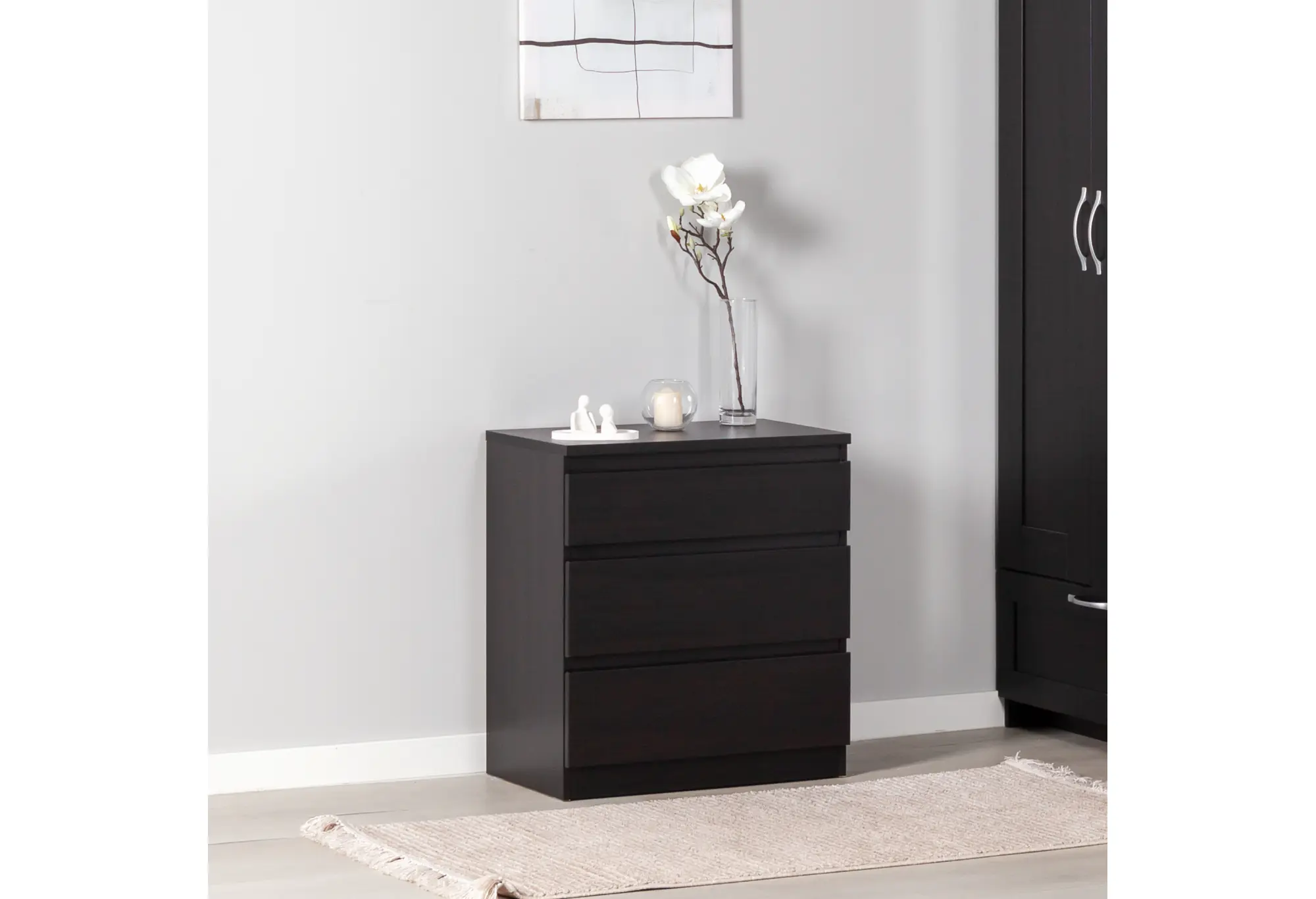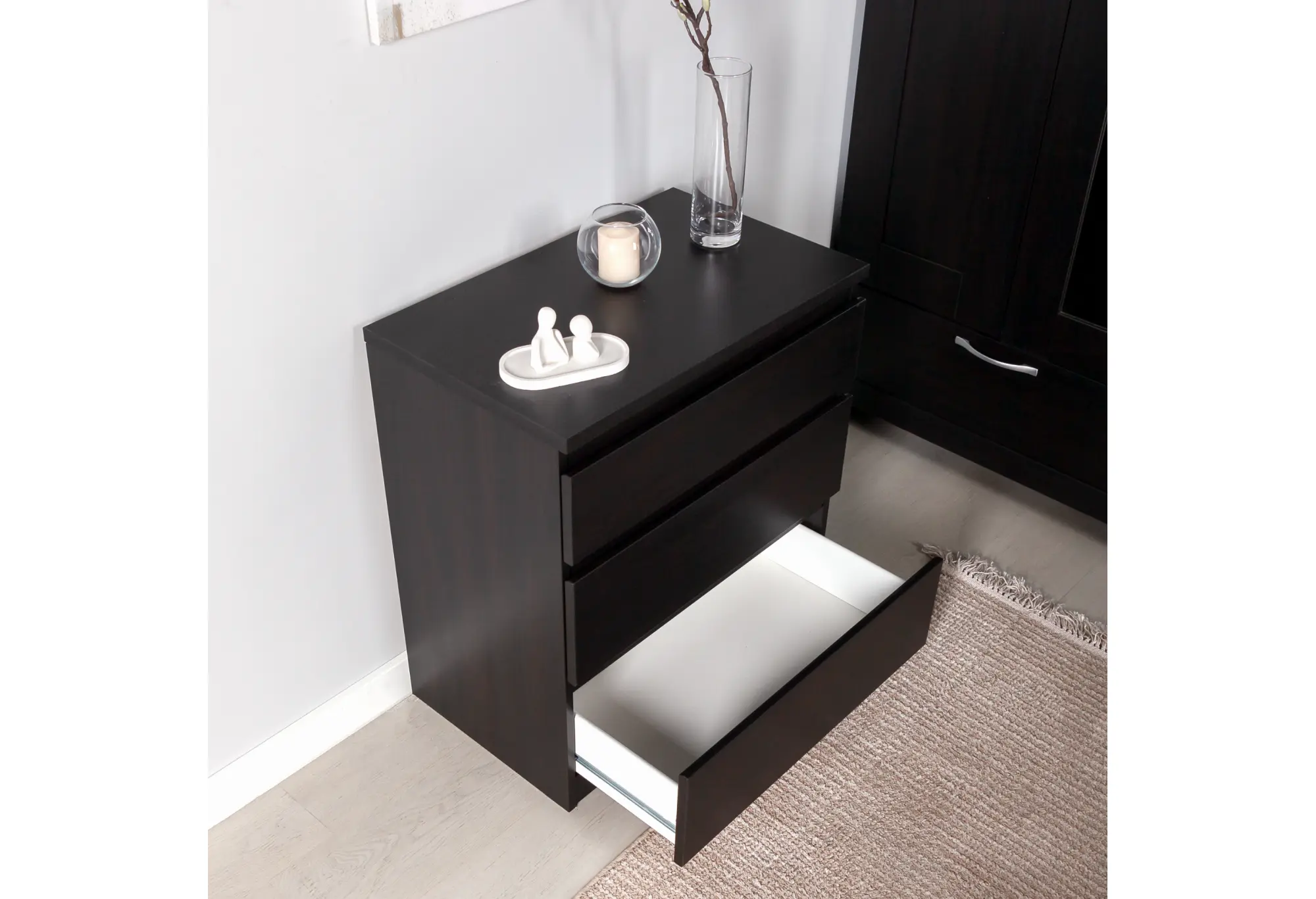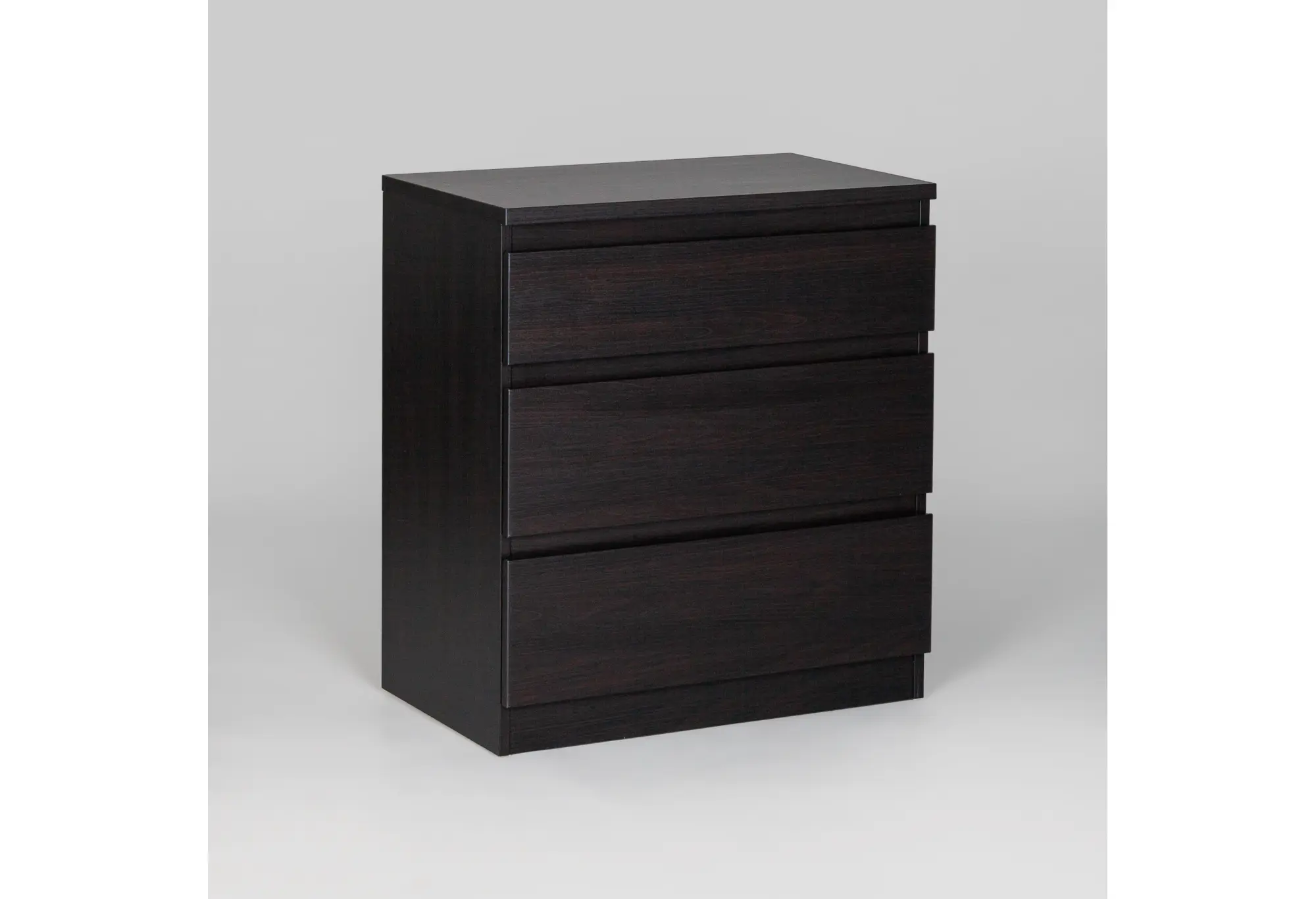 Компактный комод «Кастор» с тремя выдвижными ящиками выполнен из КДСП и окрашен в глубокий черный цвет. Лаконичный прямоугольный корпус без лишнего декора и фурнитуры визуально выглядит аккуратно и современно, легко вписывается как в небольшие комнаты, так и в функциональные зоны спальни, прихожей или кабинета.