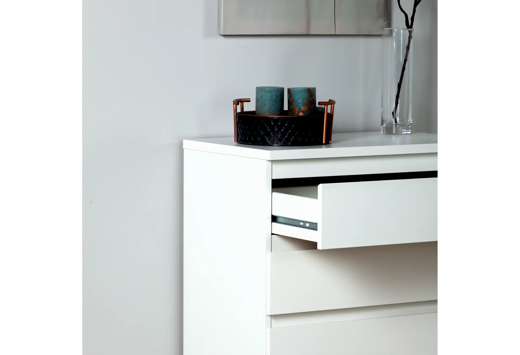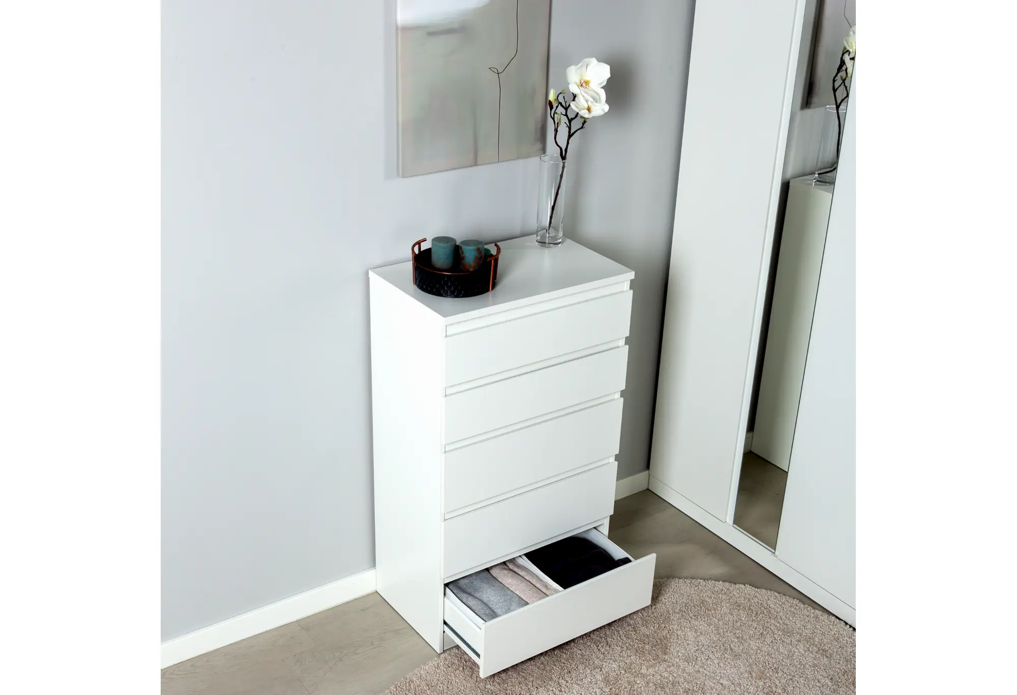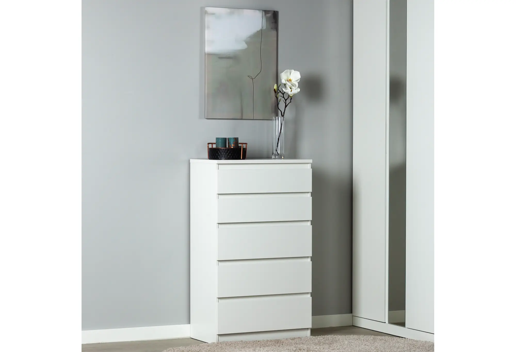 Компактный комод «Кастор» с пятью выдвижными ящиками выполнен в современном лаконичном стиле и полностью выдержан в белом цвете. Прямые линии корпуса и фасадов создают аккуратный, нейтральный внешний вид, который легко впишется в интерьер спальни, прихожей или детской. Поверхность комода образует ровную горизонтальную площадку, которую можно использовать для размещения необходимых предметов или декора.