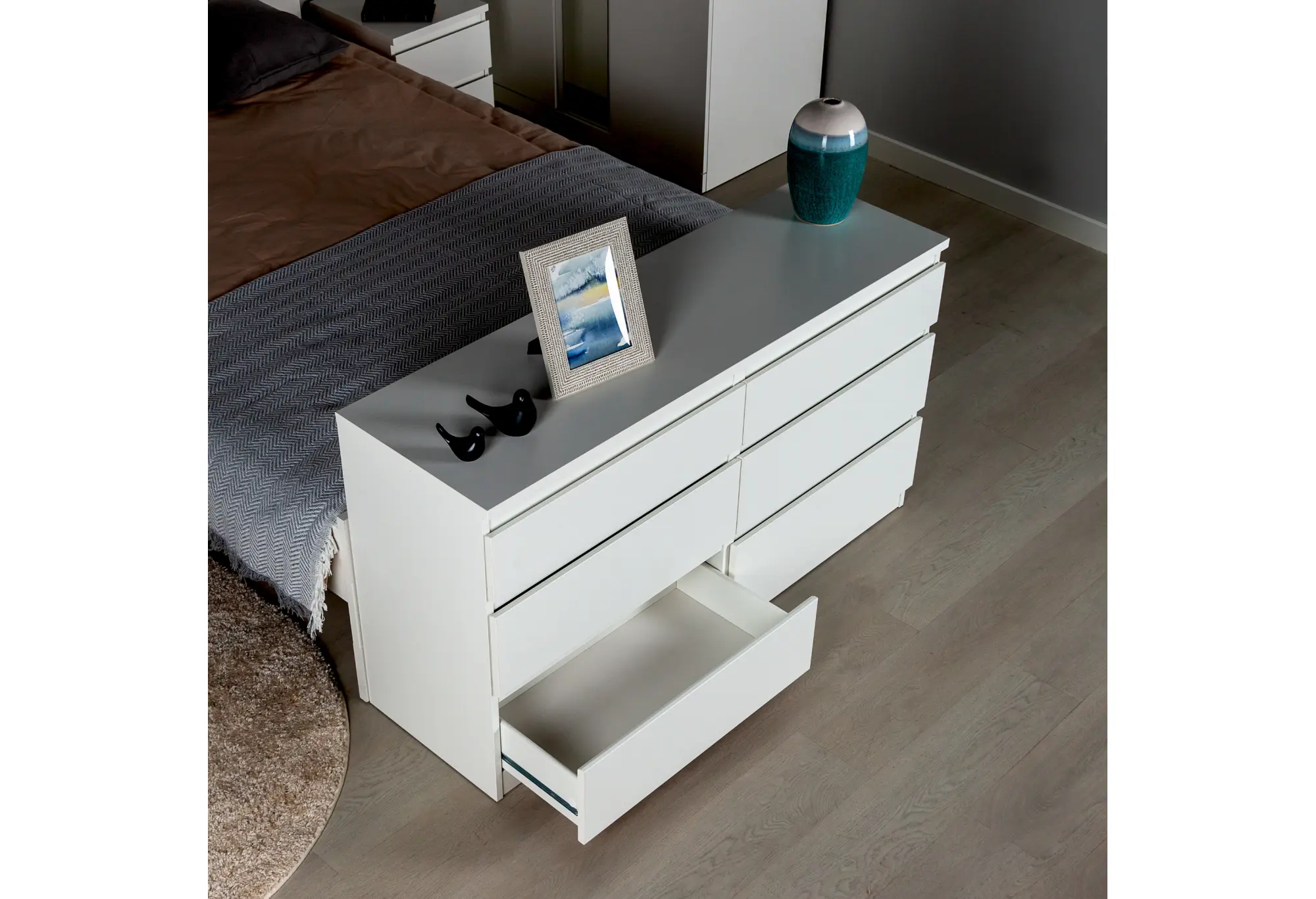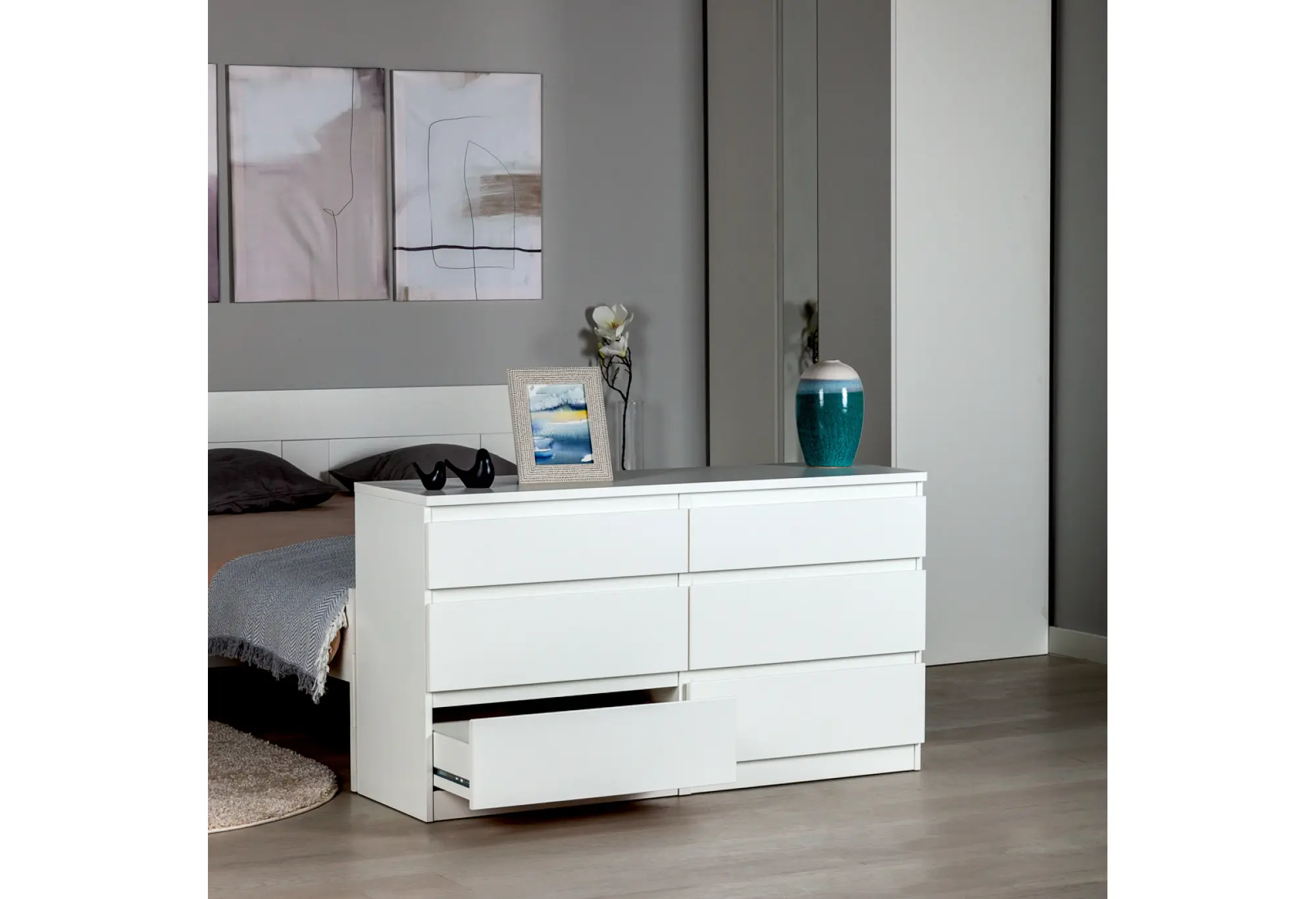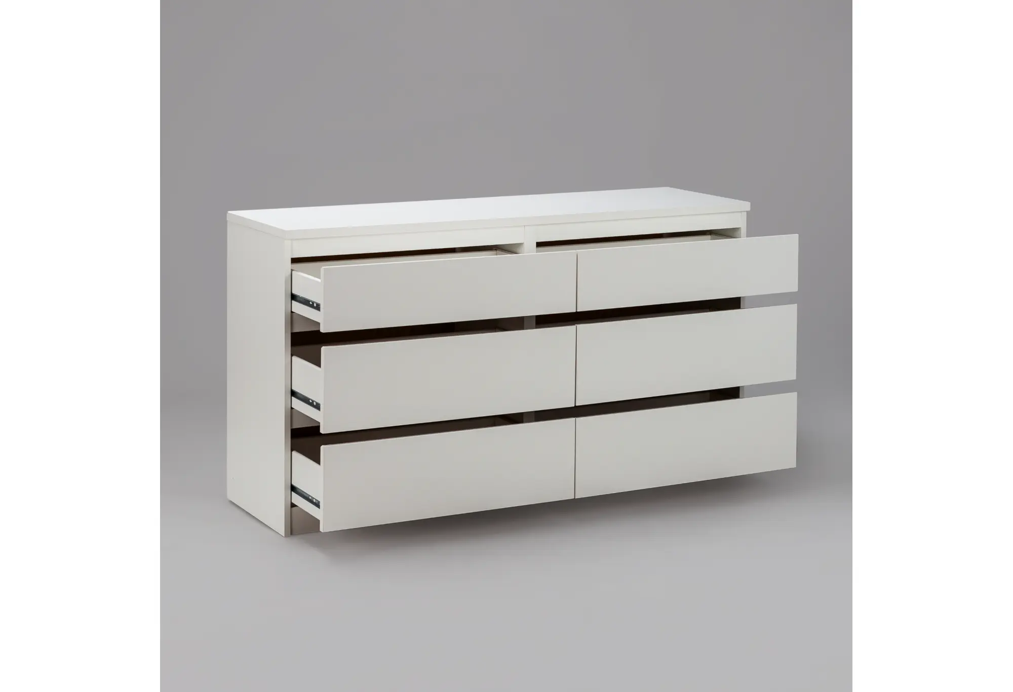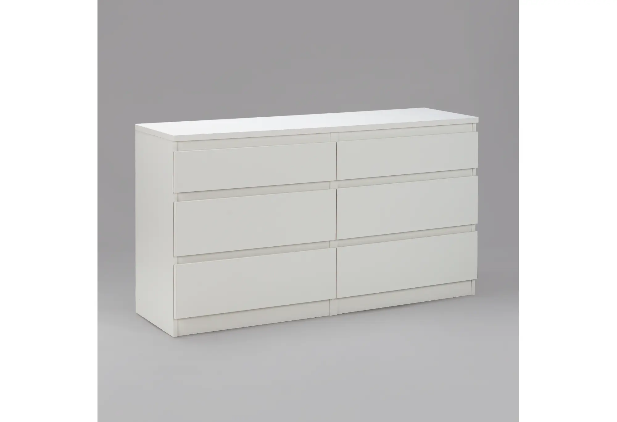 Комод на шесть выдвижных ящиков в белом цвете выполнен из КДСП и рассчитан на ежедневное использование в спальне, гостиной или прихожей. Лаконичный прямоугольный корпус с ровными фасадами без лишнего декора визуально смотрится аккуратно и легко вписывается в современный интерьер. Нейтральный белый цвет делает комод уместным как в светлых, так и в контрастных помещениях, не перегружая пространство.