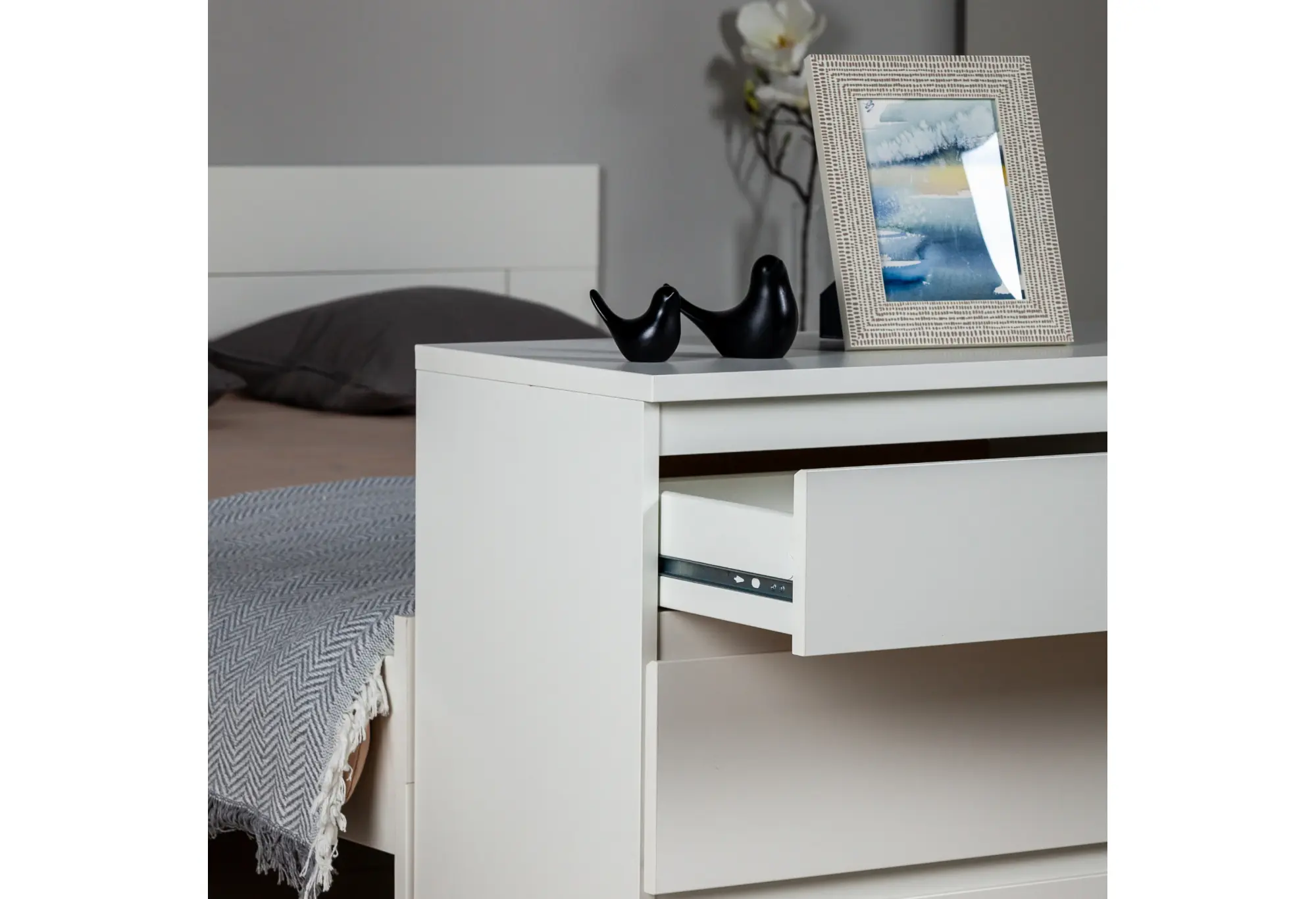 Шариковые направляющие обеспечивают плавное выдвижение ящиков по всей длине, облегчая доступ к содержимому. Плотный корпус из КДСП создает устойчивую конструкцию, а верхняя поверхность может использоваться как дополнительная плоскость для размещения декоративных предметов, органайзеров или техники.