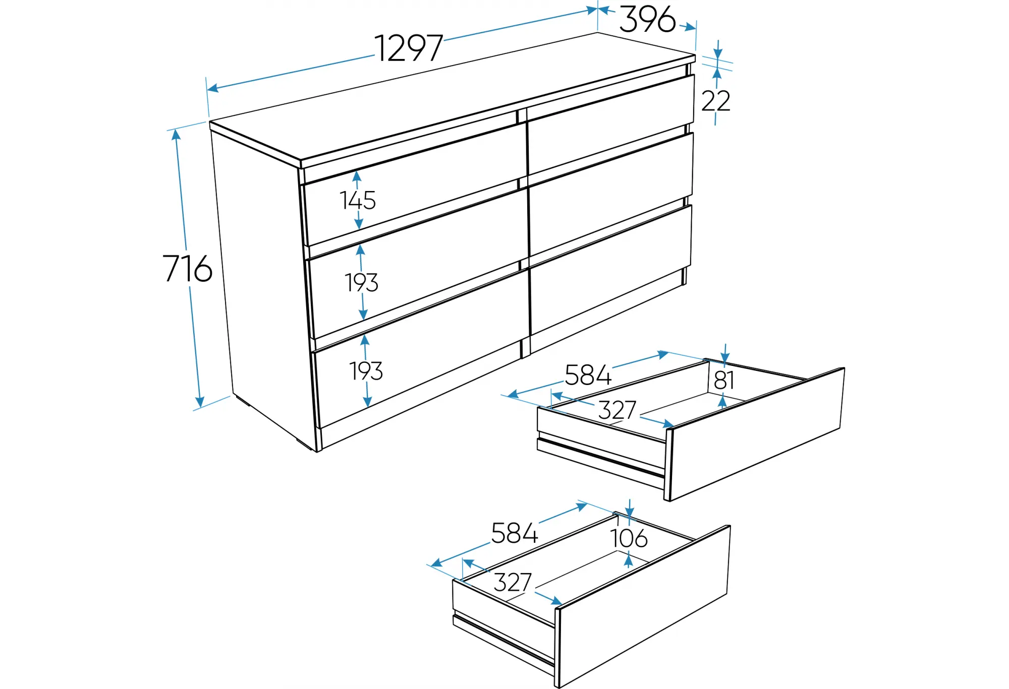 Ширина 1297 мм и высота 714 мм позволяют разместить комод вдоль стены, под ТВ или под оконным проемом, а глубина 396 мм удобна в помещениях, где важно сохранить свободный проход. Шесть ящиков расположены в два ряда по три, что помогает разложить вещи по категориям и поддерживать порядок. Каждый ящик рассчитан на нагрузку до 8 кг, что подходит для хранения одежды, текстиля и других повседневных мелочей.