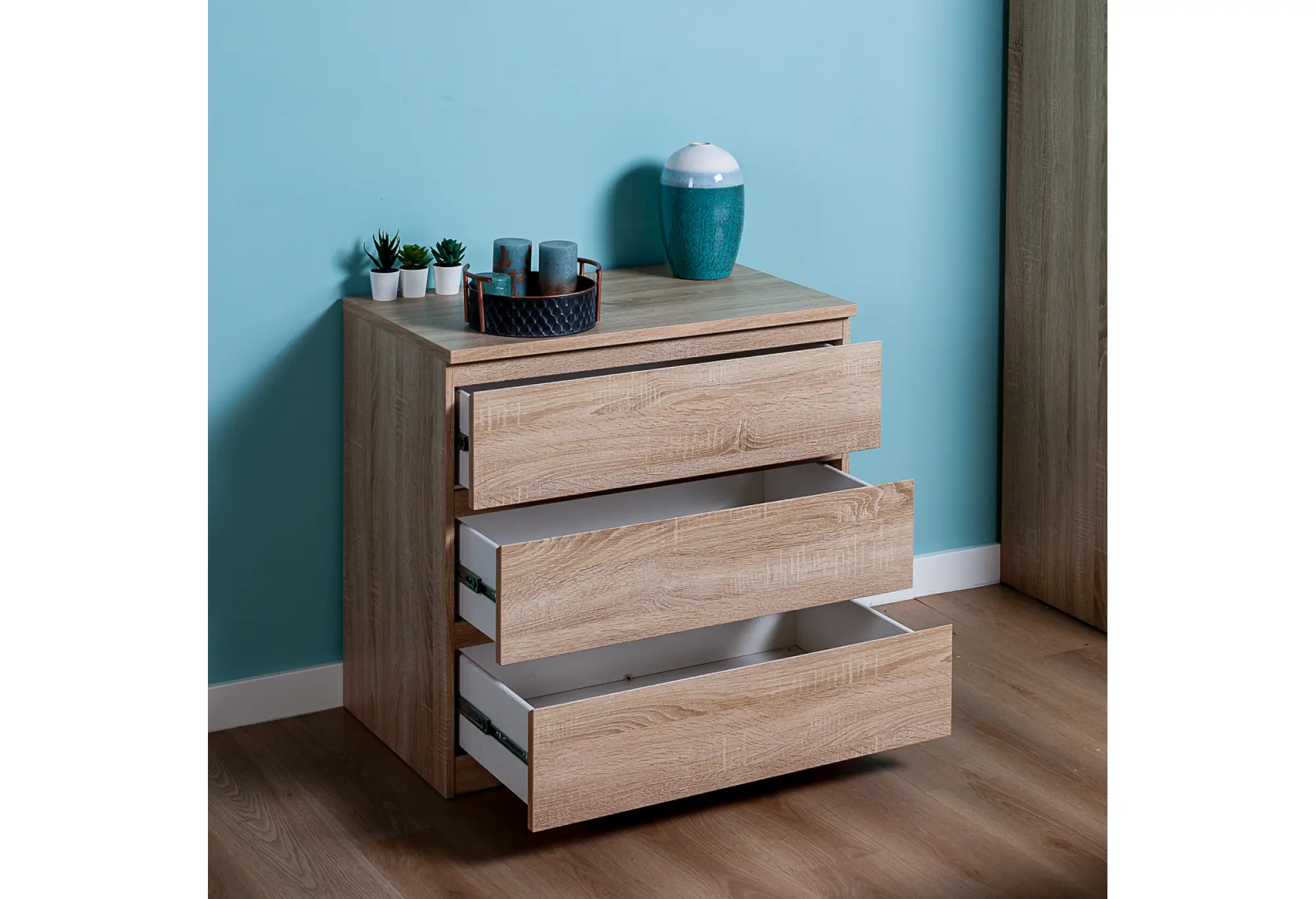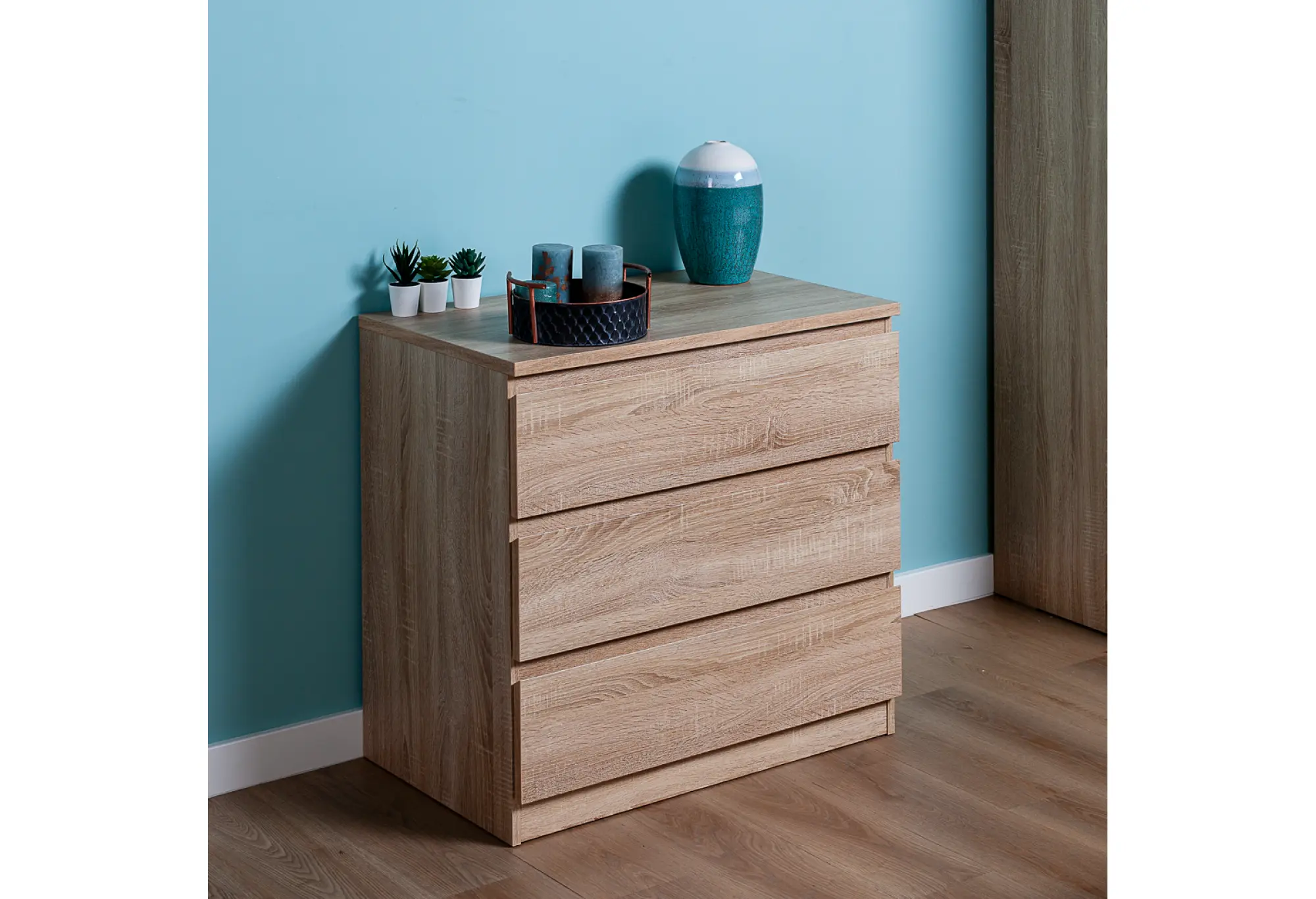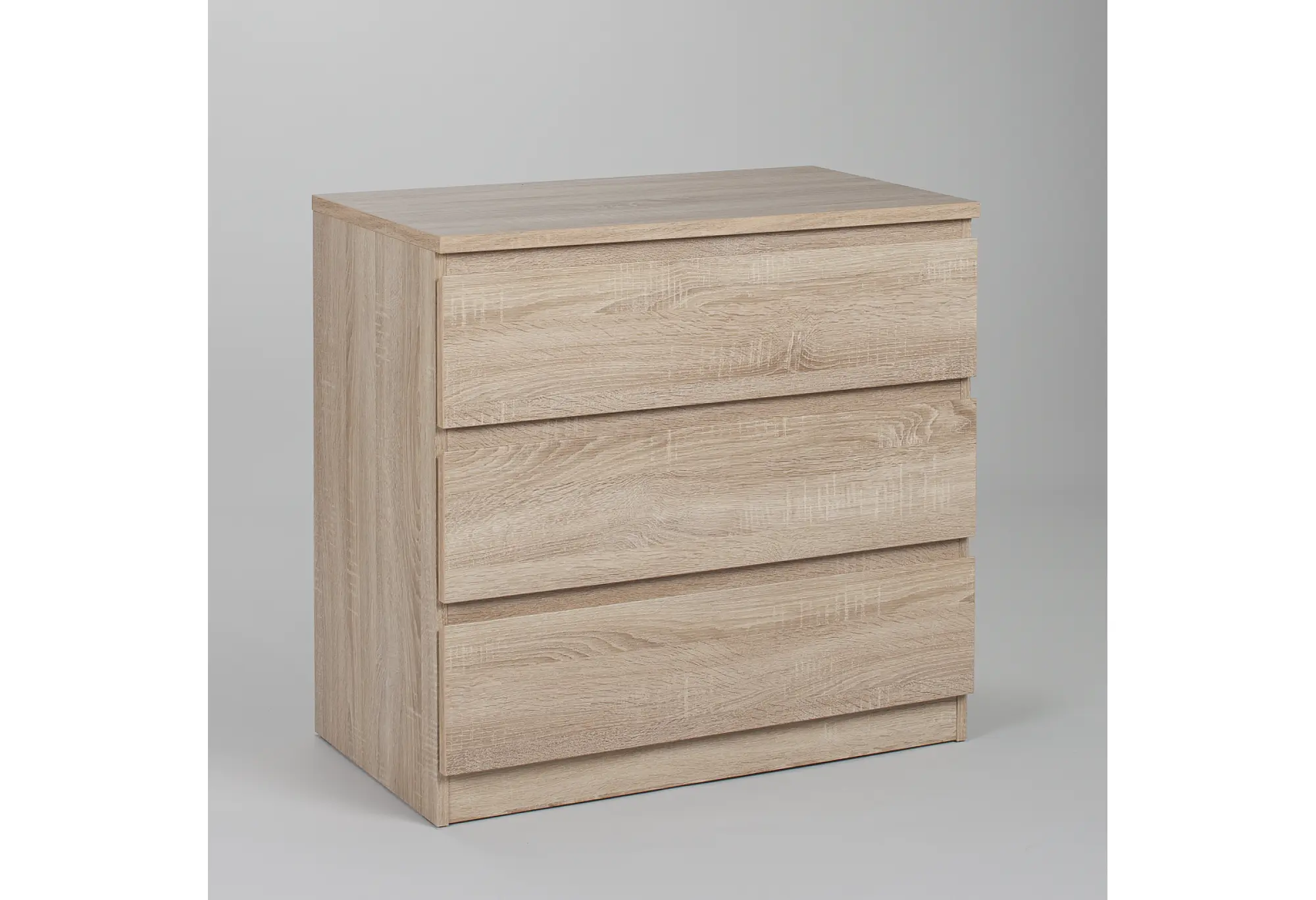 Комод МАЛЬТА в цвете Дуб Сонома – это компактное и функциональное решение для хранения вещей в доме. Корпус выполнен из ДСП с текстурой древесины, за счёт чего мебель выглядит сдержанно и аккуратно, легко вписывается как в современный интерьер, так и в более классическую обстановку. При ширине 803 мм и глубине 480 мм комод не занимает много места, оставаясь при этом достаточно вместительным благодаря трём выдвижным ящикам по всей ширине.