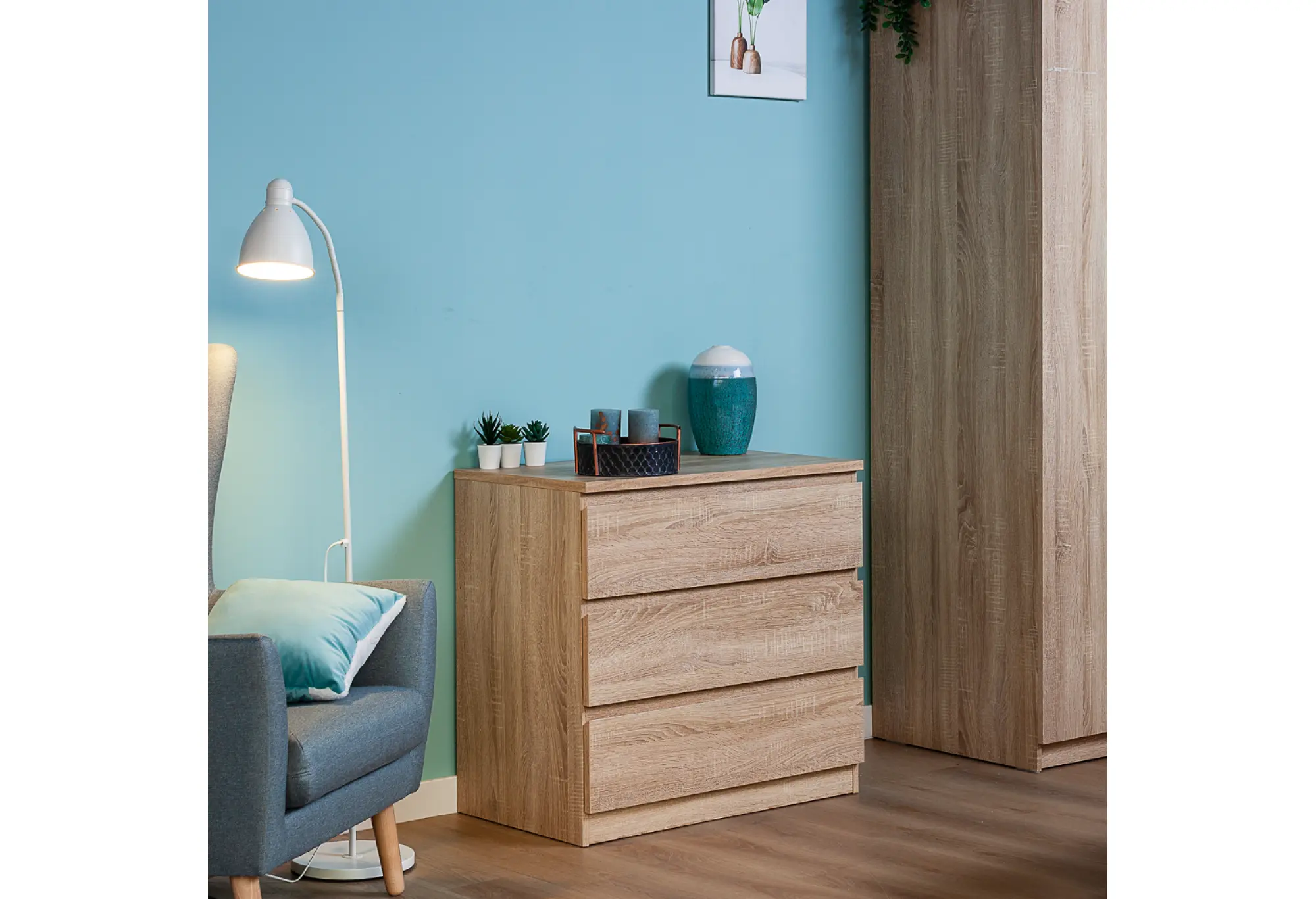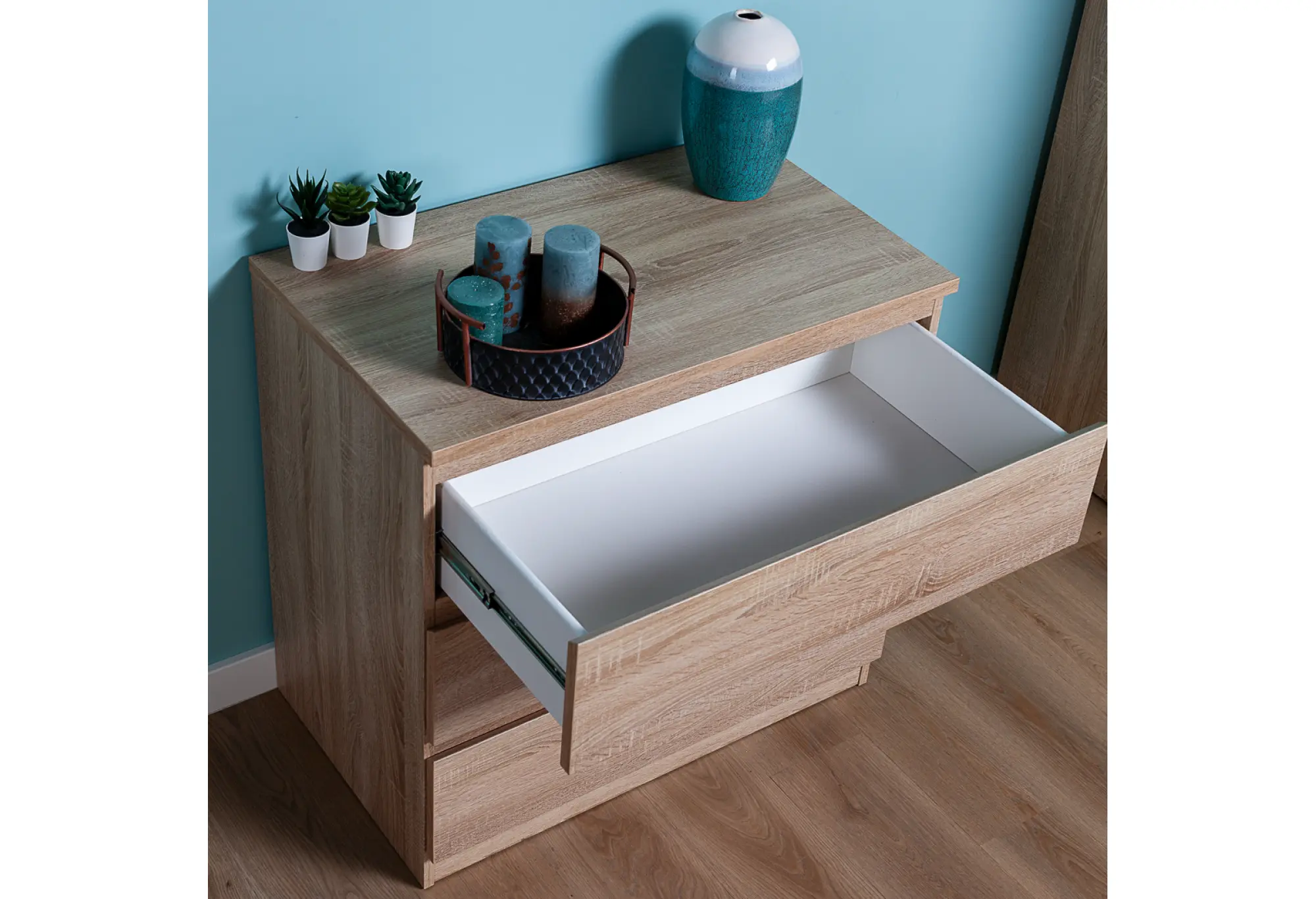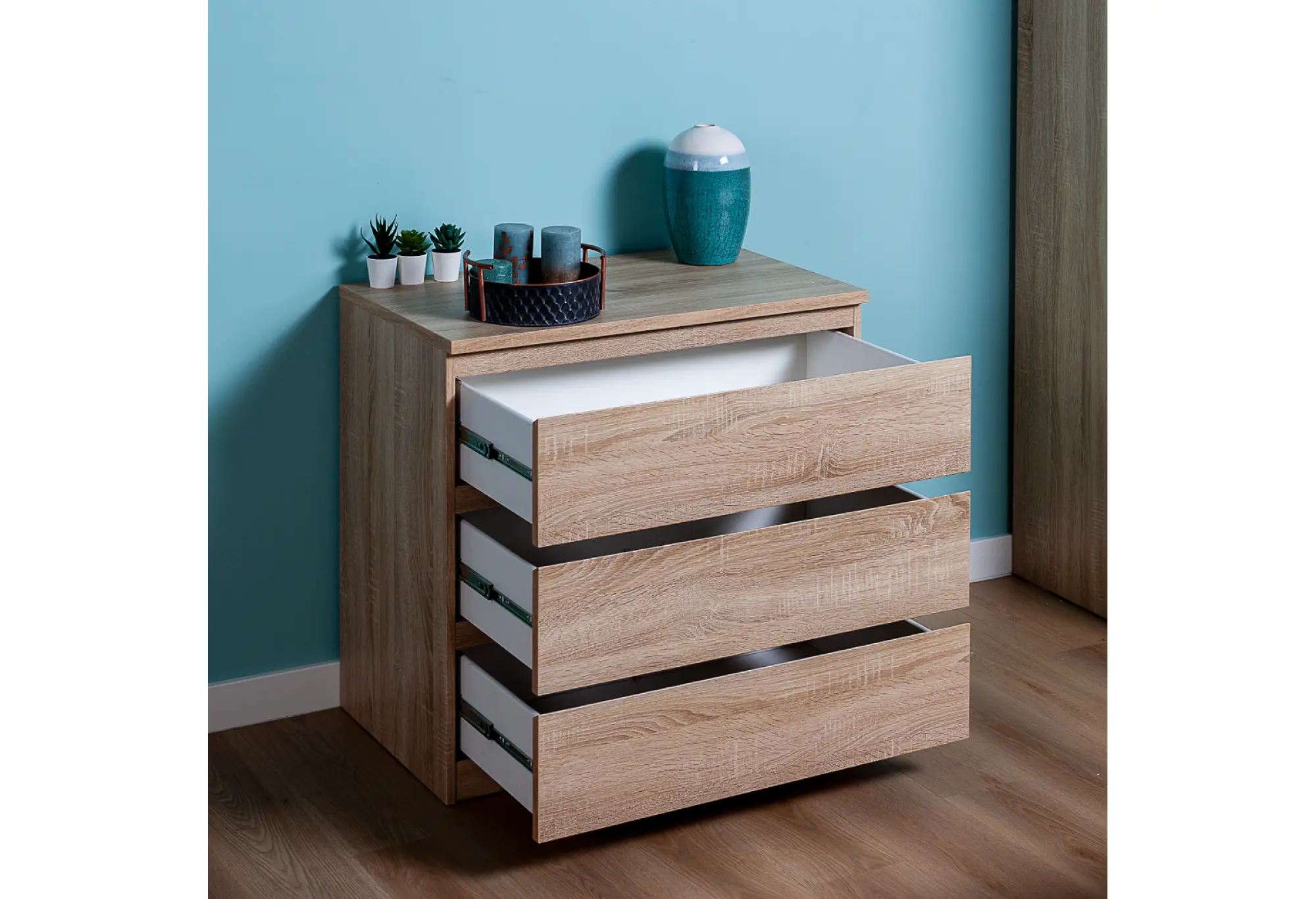 Комод МАЛЬТА в цвете Дуб Сонома – это компактное и функциональное решение для хранения вещей в доме. Корпус выполнен из ДСП с текстурой древесины, за счёт чего мебель выглядит сдержанно и аккуратно, легко вписывается как в современный интерьер, так и в более классическую обстановку. При ширине 803 мм и глубине 480 мм комод не занимает много места, оставаясь при этом достаточно вместительным благодаря трём выдвижным ящикам по всей ширине.