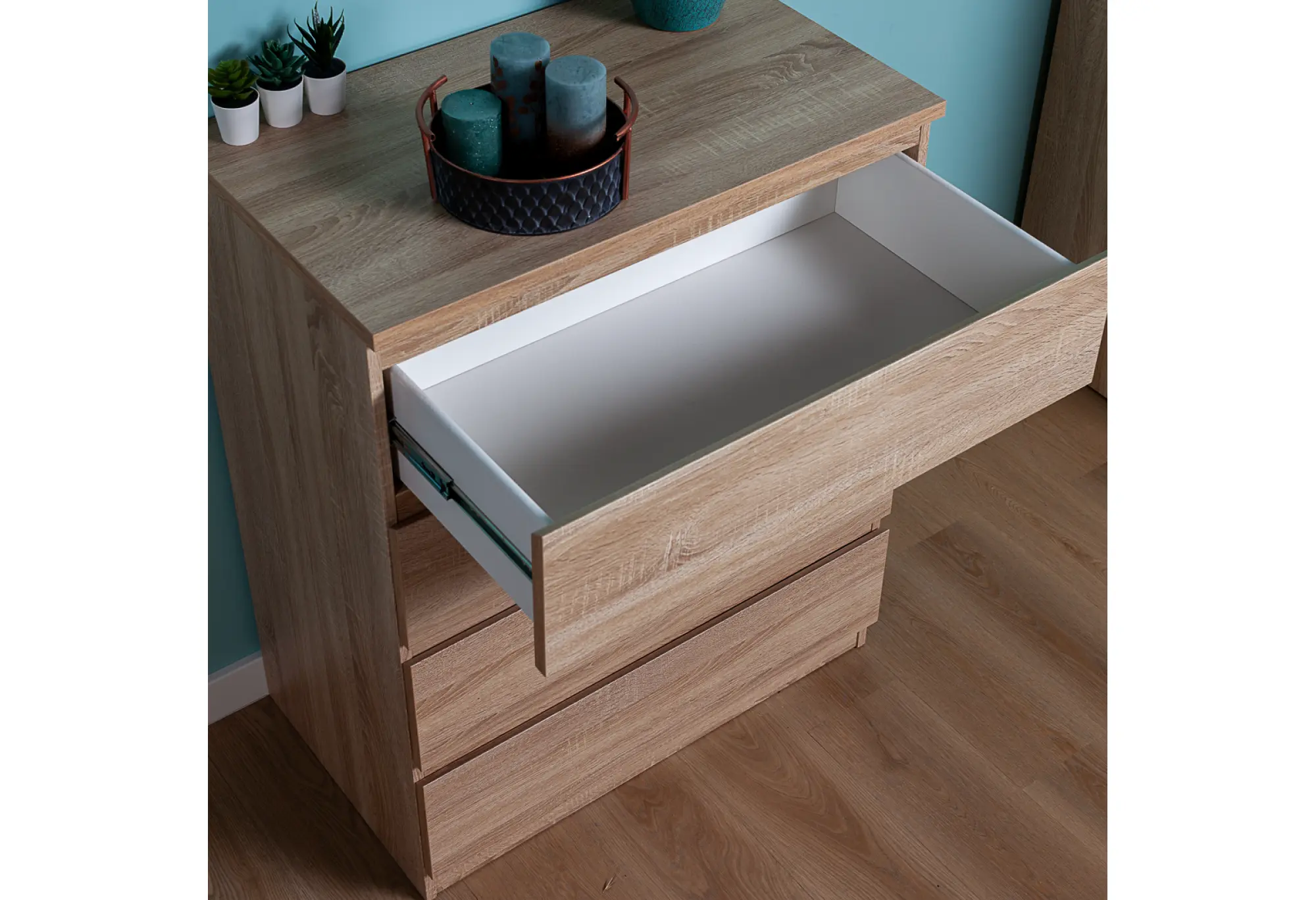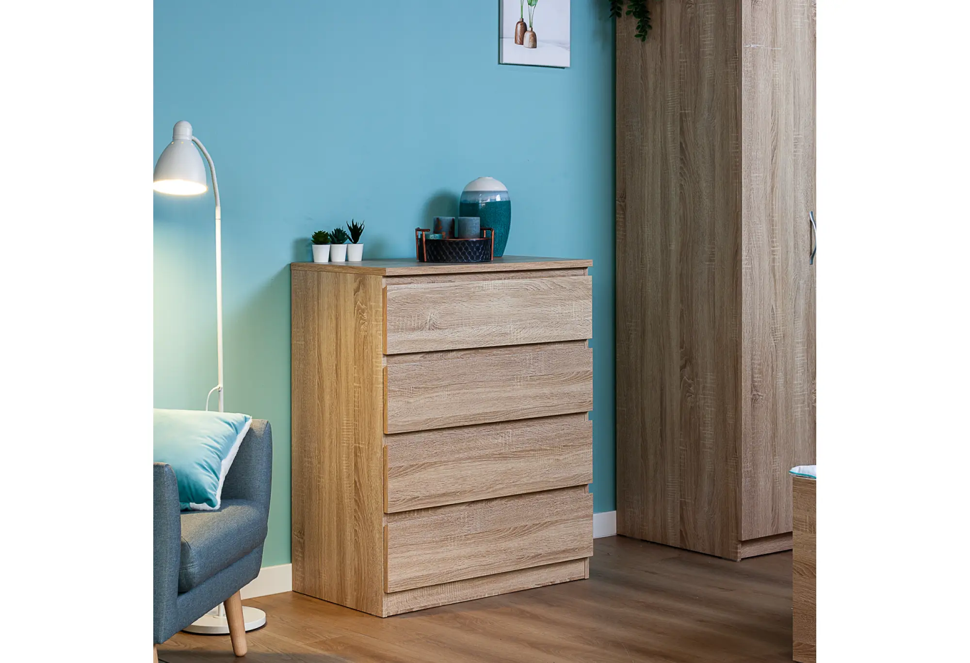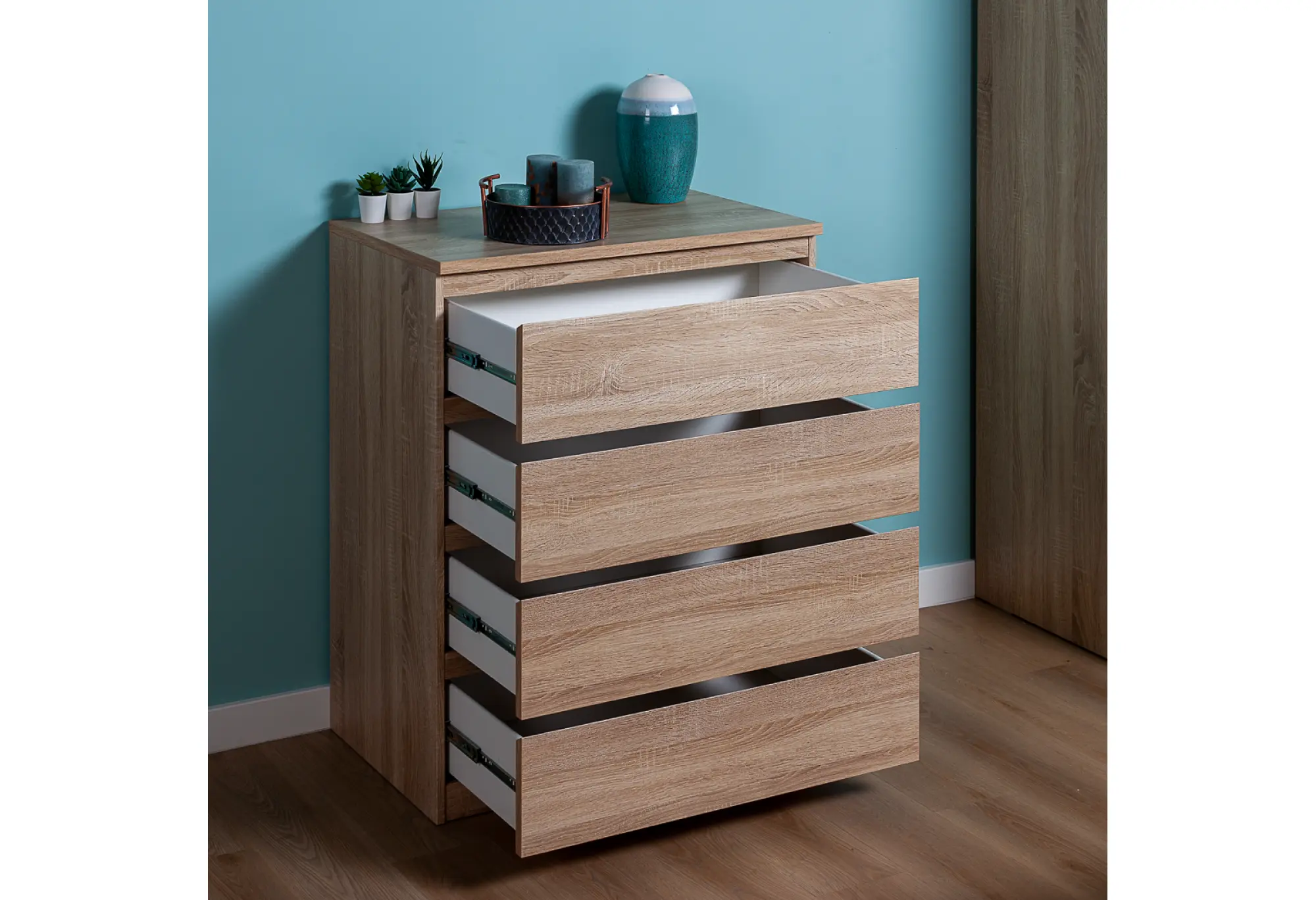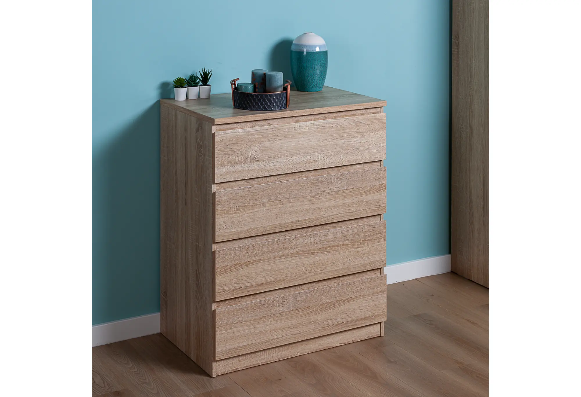 - Комод МАЛЬТА высокий с четырьмя выдвижными ящиками, цвет Дуб Сонома