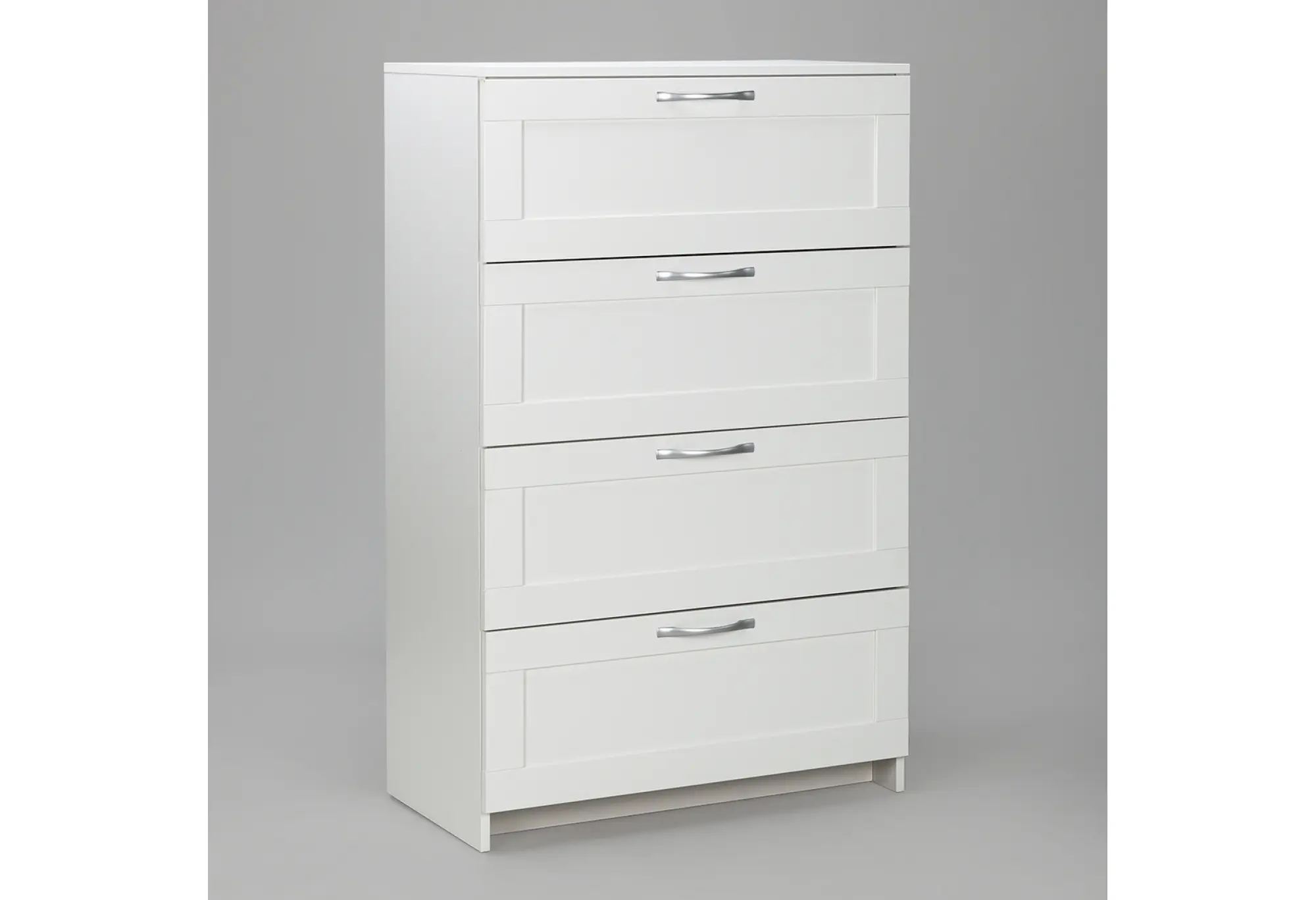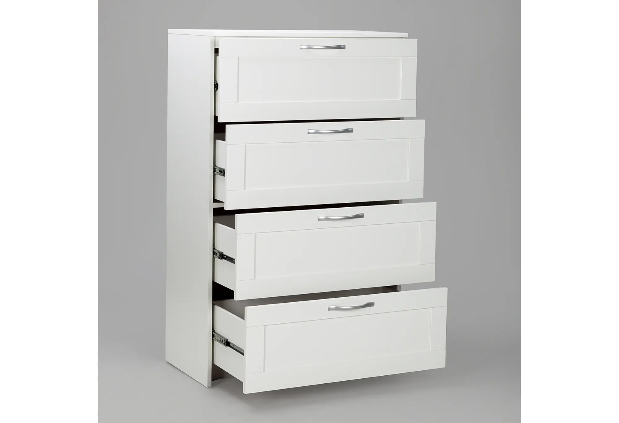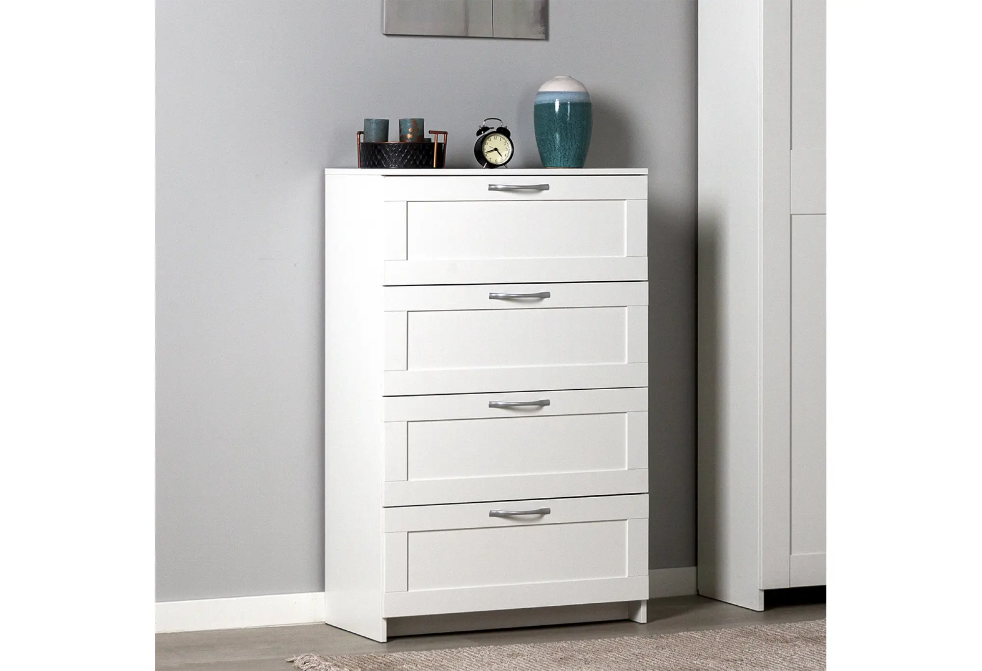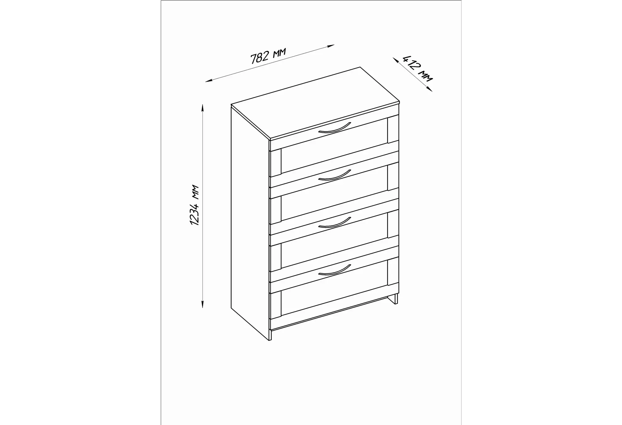 Четыре вместительных ящика расположены по всей высоте комода и оснащены шариковыми направляющими, благодаря которым выдвижение происходит плавно и с хорошим доступом к содержимому. Конструкция рассчитана на нагрузку до 8 кг на каждый ящик, что подходит для хранения одежды, текстиля и других бытовых вещей. Верхняя крышка выдерживает до 15 кг и может использоваться для размещения не слишком тяжёлой техники, аксессуаров или декоративных предметов. Прямые линии фасадов и небольшие ручки подчёркивают строгий и аккуратный внешний вид, который легко сочетать с другой светлой мебелью.