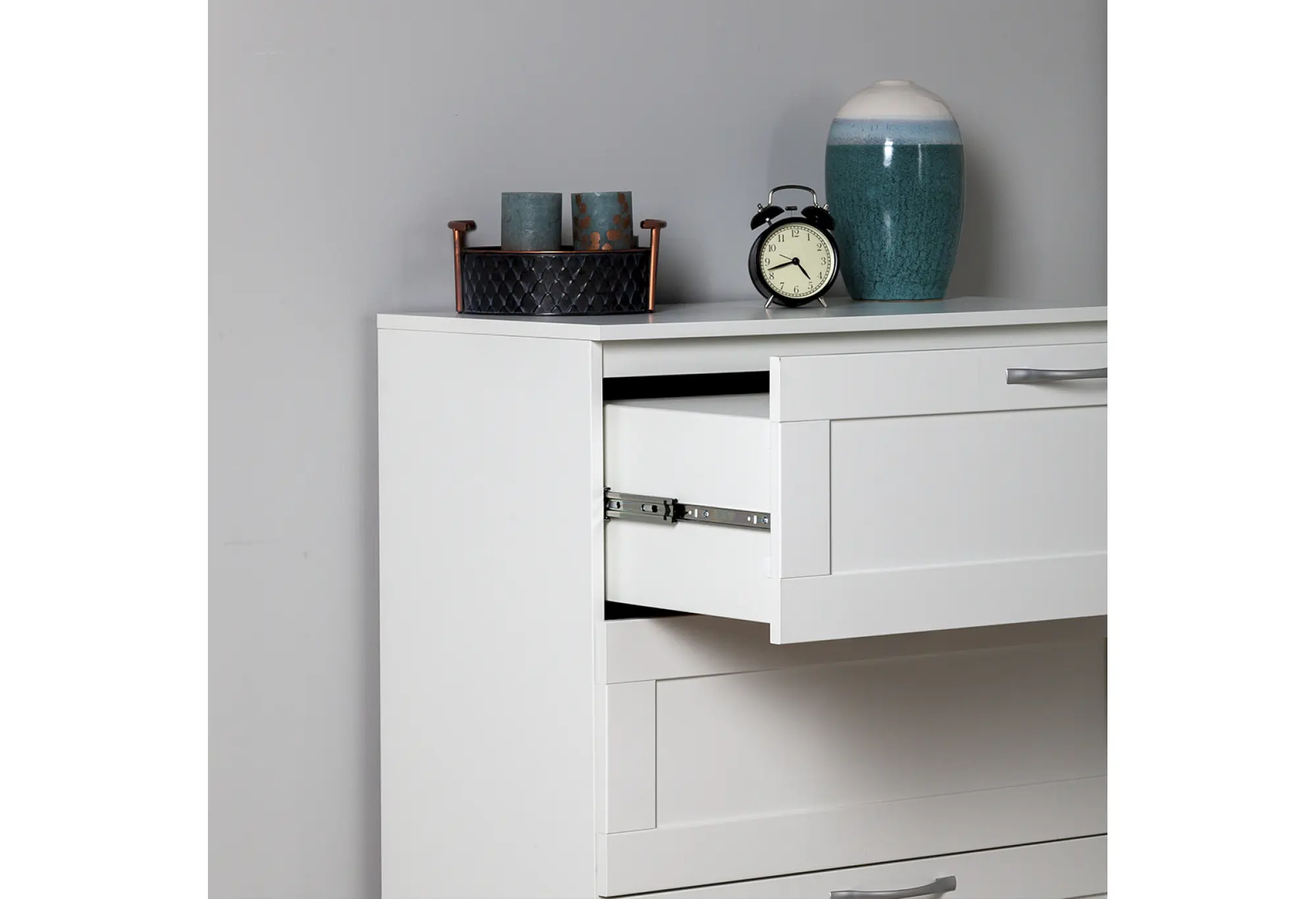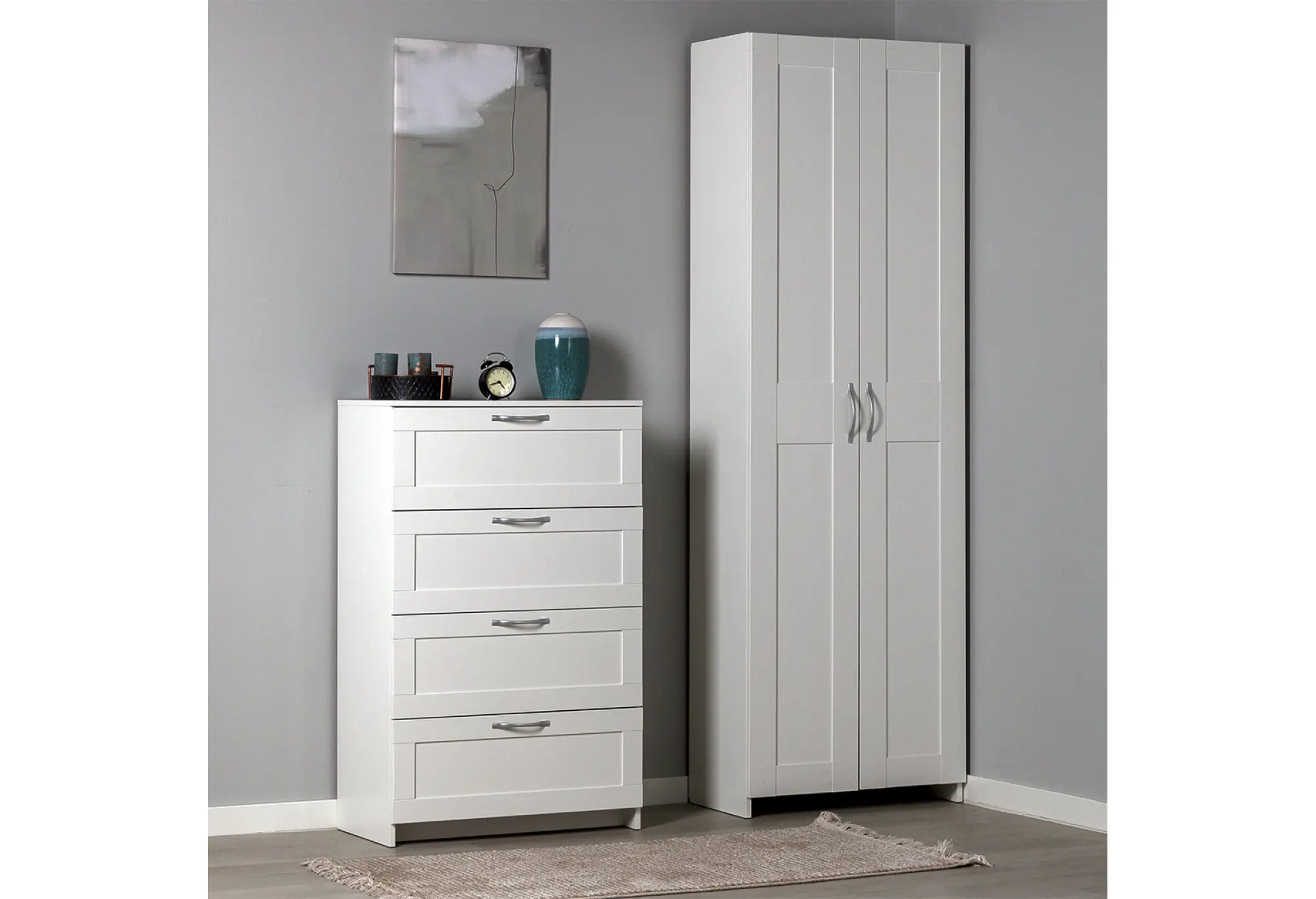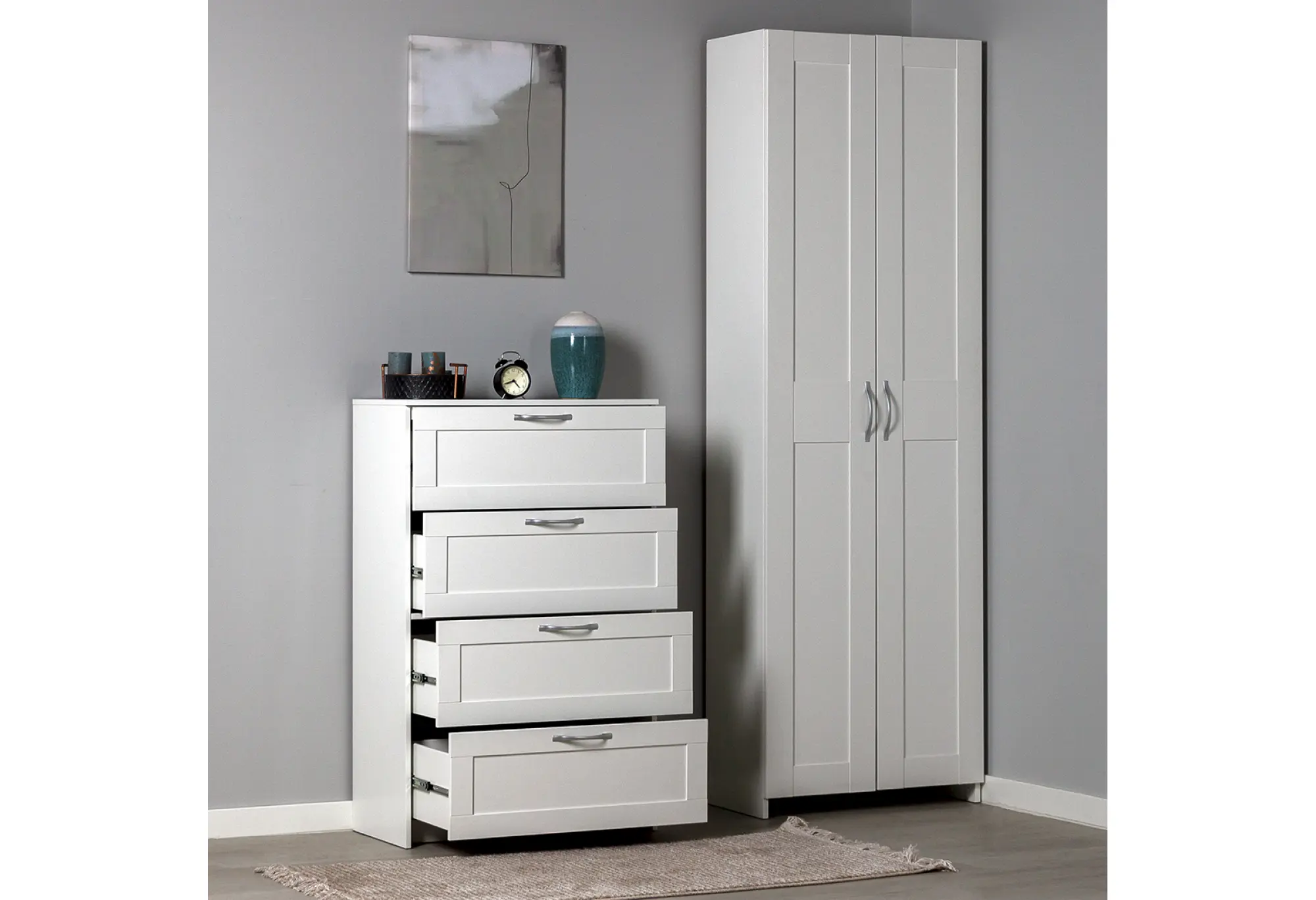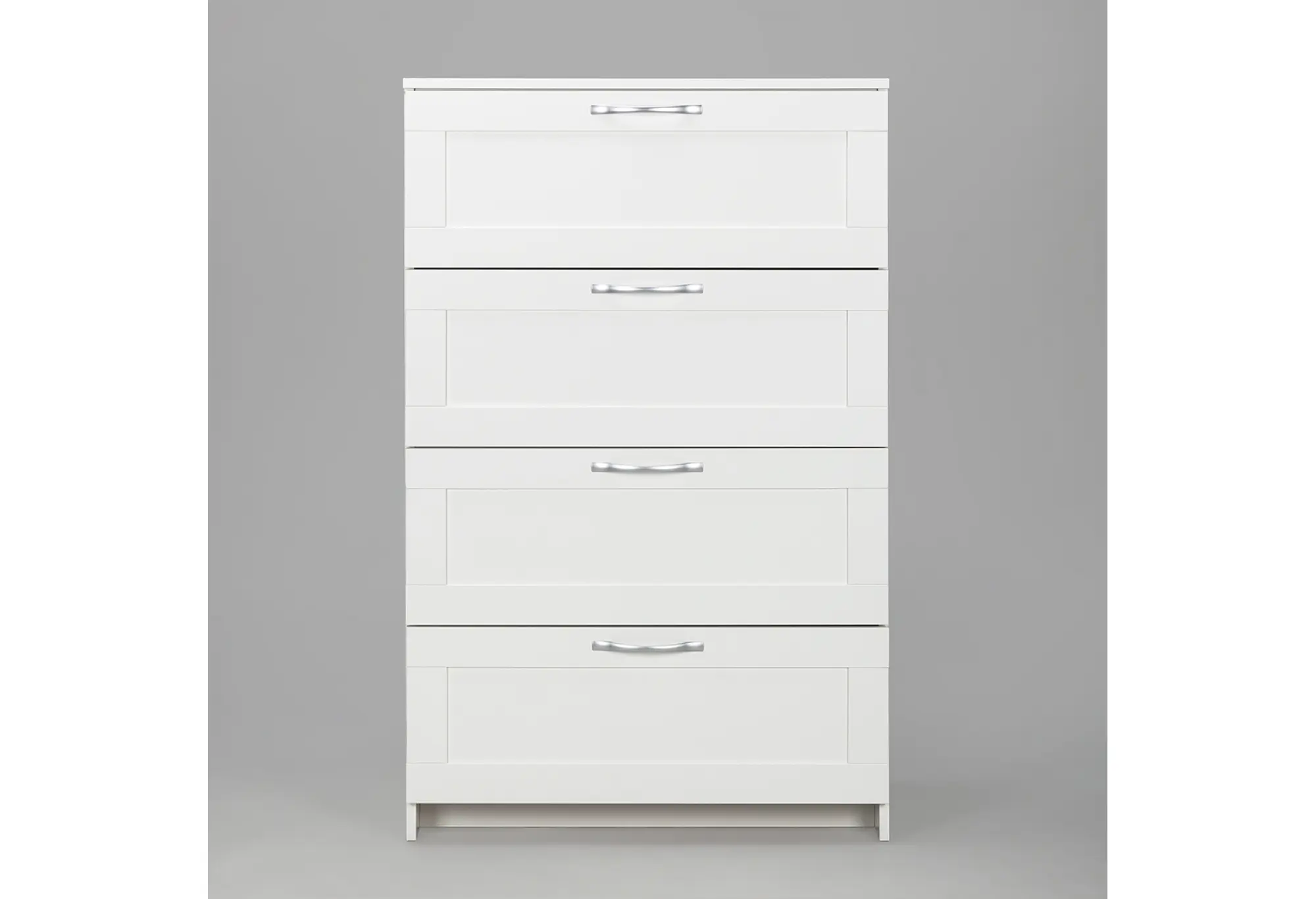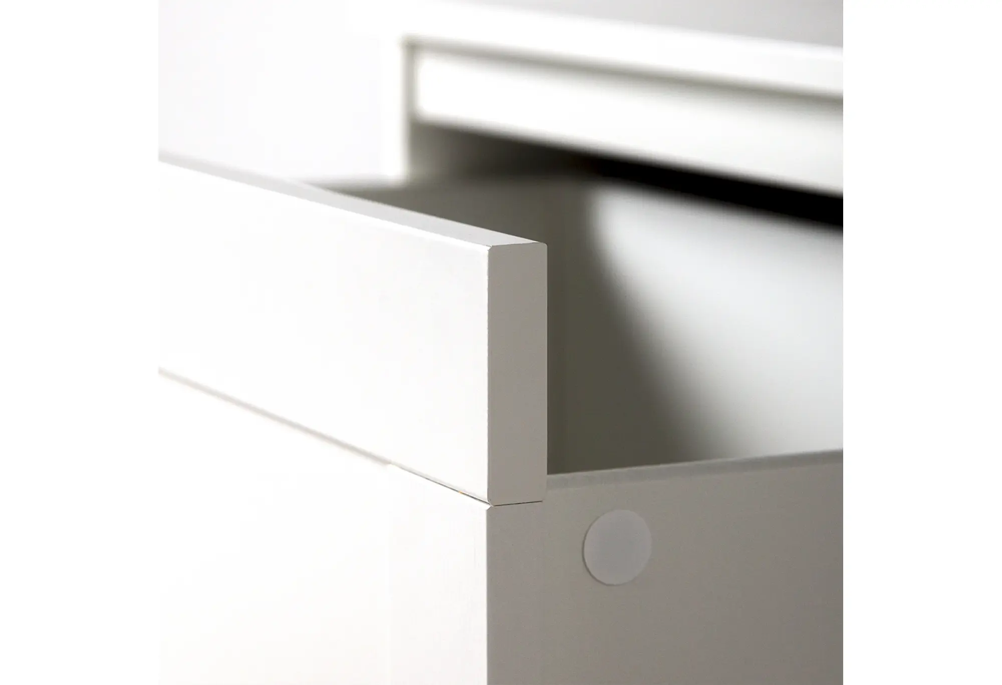 Четыре вместительных ящика расположены по всей высоте комода и оснащены шариковыми направляющими, благодаря которым выдвижение происходит плавно и с хорошим доступом к содержимому. Конструкция рассчитана на нагрузку до 8 кг на каждый ящик, что подходит для хранения одежды, текстиля и других бытовых вещей. Верхняя крышка выдерживает до 15 кг и может использоваться для размещения не слишком тяжёлой техники, аксессуаров или декоративных предметов. Прямые линии фасадов и небольшие ручки подчёркивают строгий и аккуратный внешний вид, который легко сочетать с другой светлой мебелью.