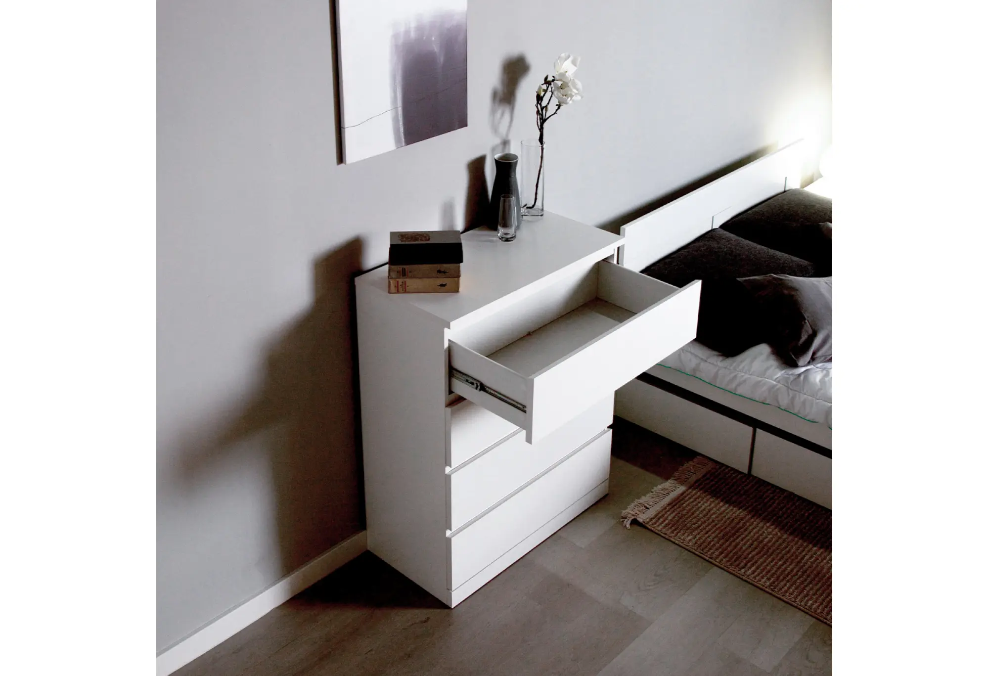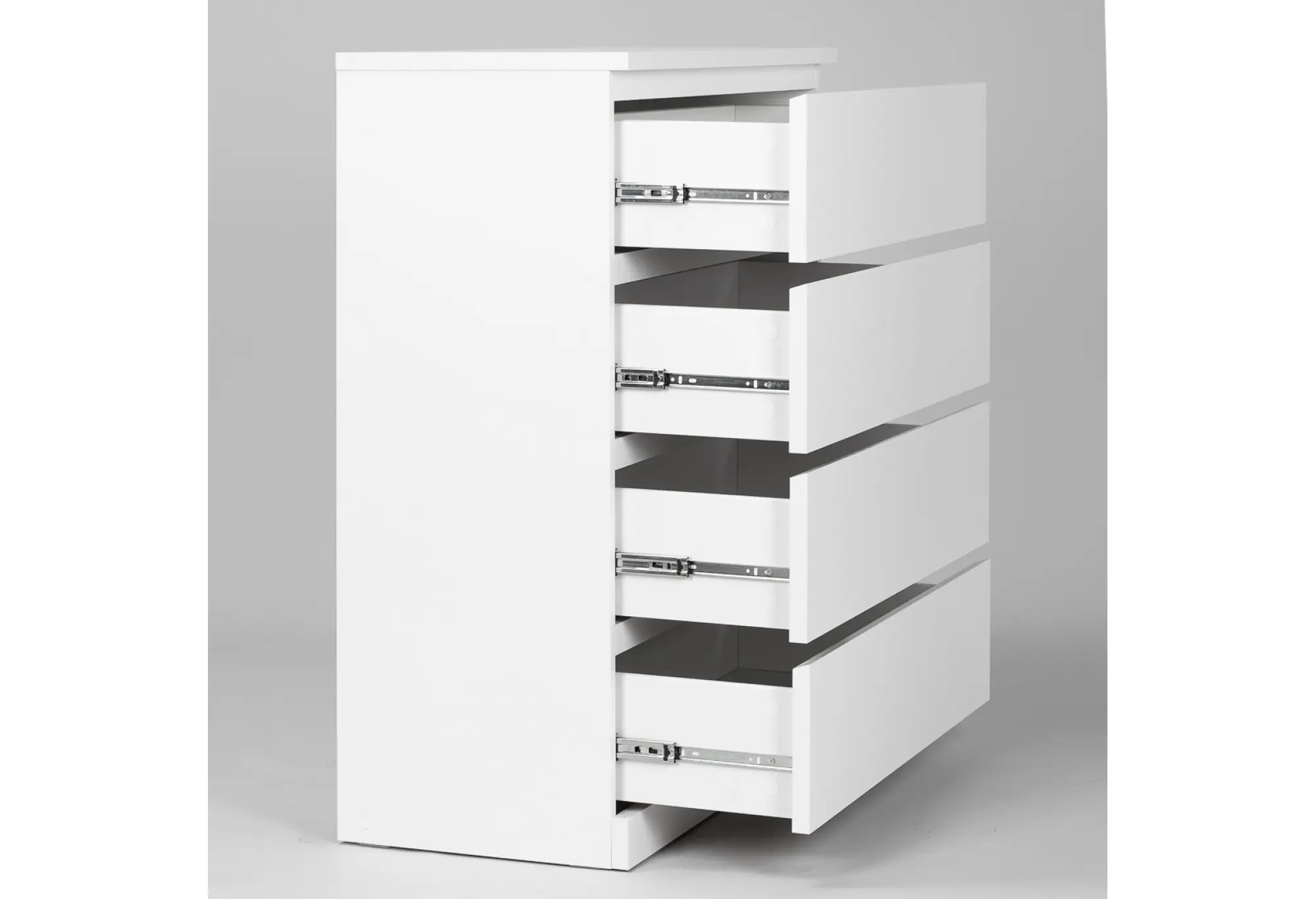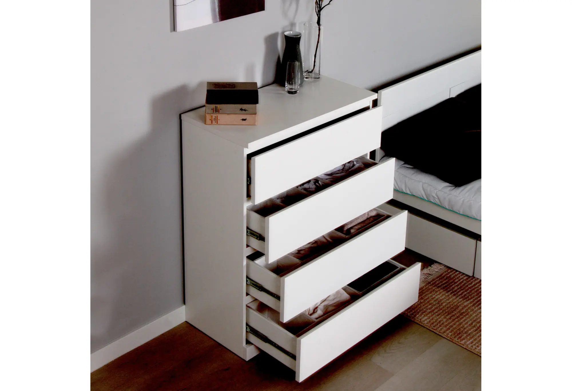 Четыре выдвижных ящика располагаются по всей ширине комода и образуют удобное вертикальное хранение. Благодаря качественным телескопическим направляющим ящики выдвигаются плавно, обеспечивая доступ к содержимому по всей глубине. Жесткая столешница сверху может использоваться как дополнительная поверхность для аксессуаров, текстиля или техники подходящих размеров.