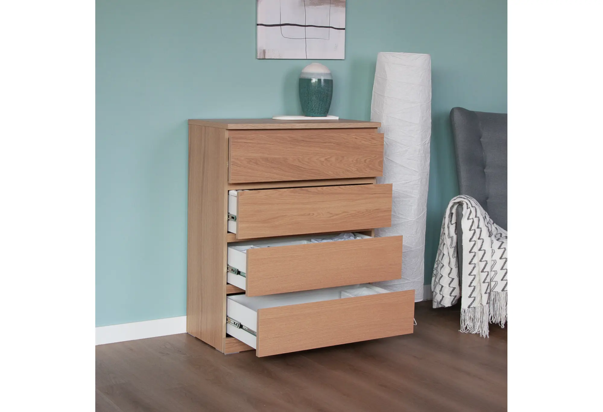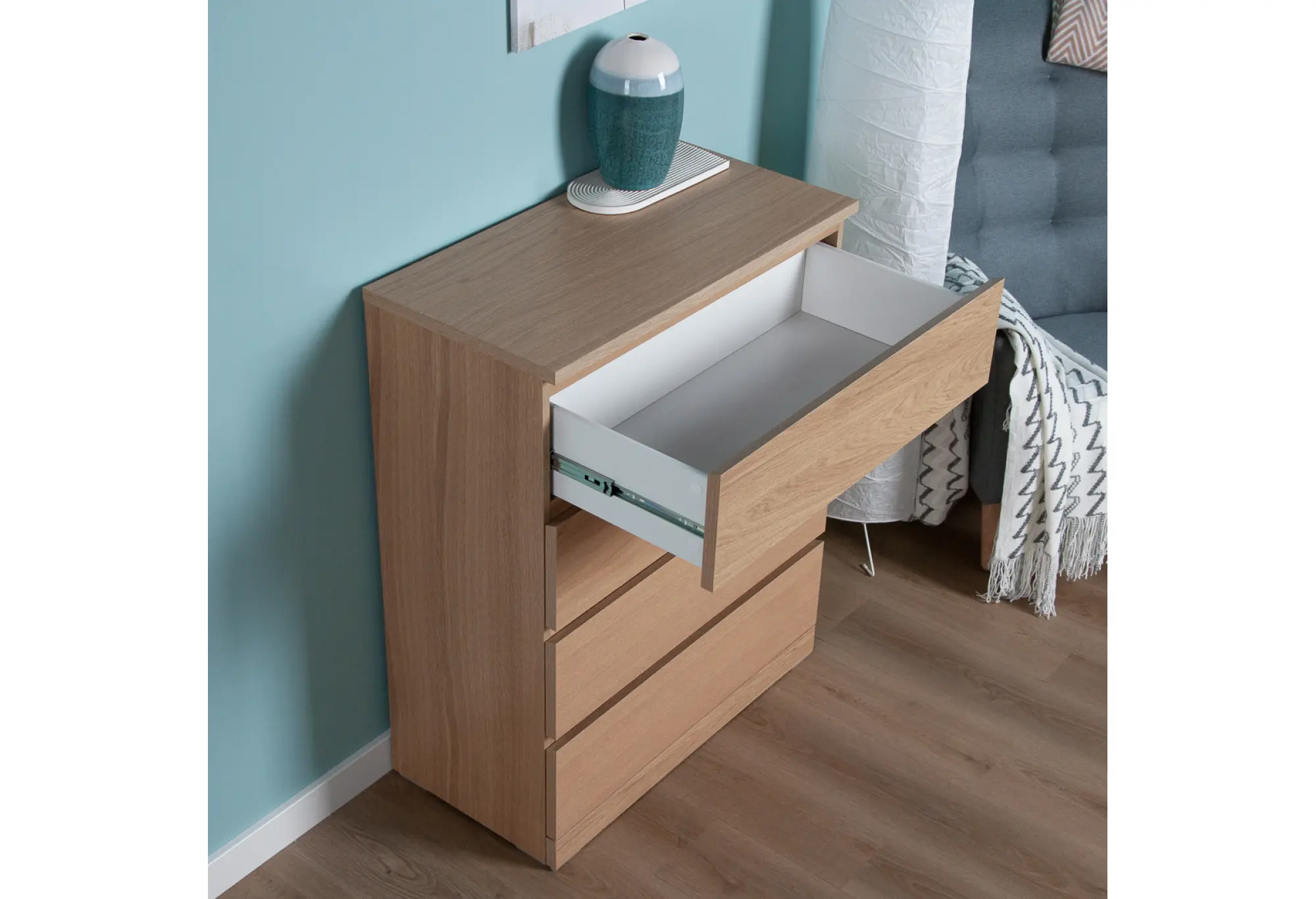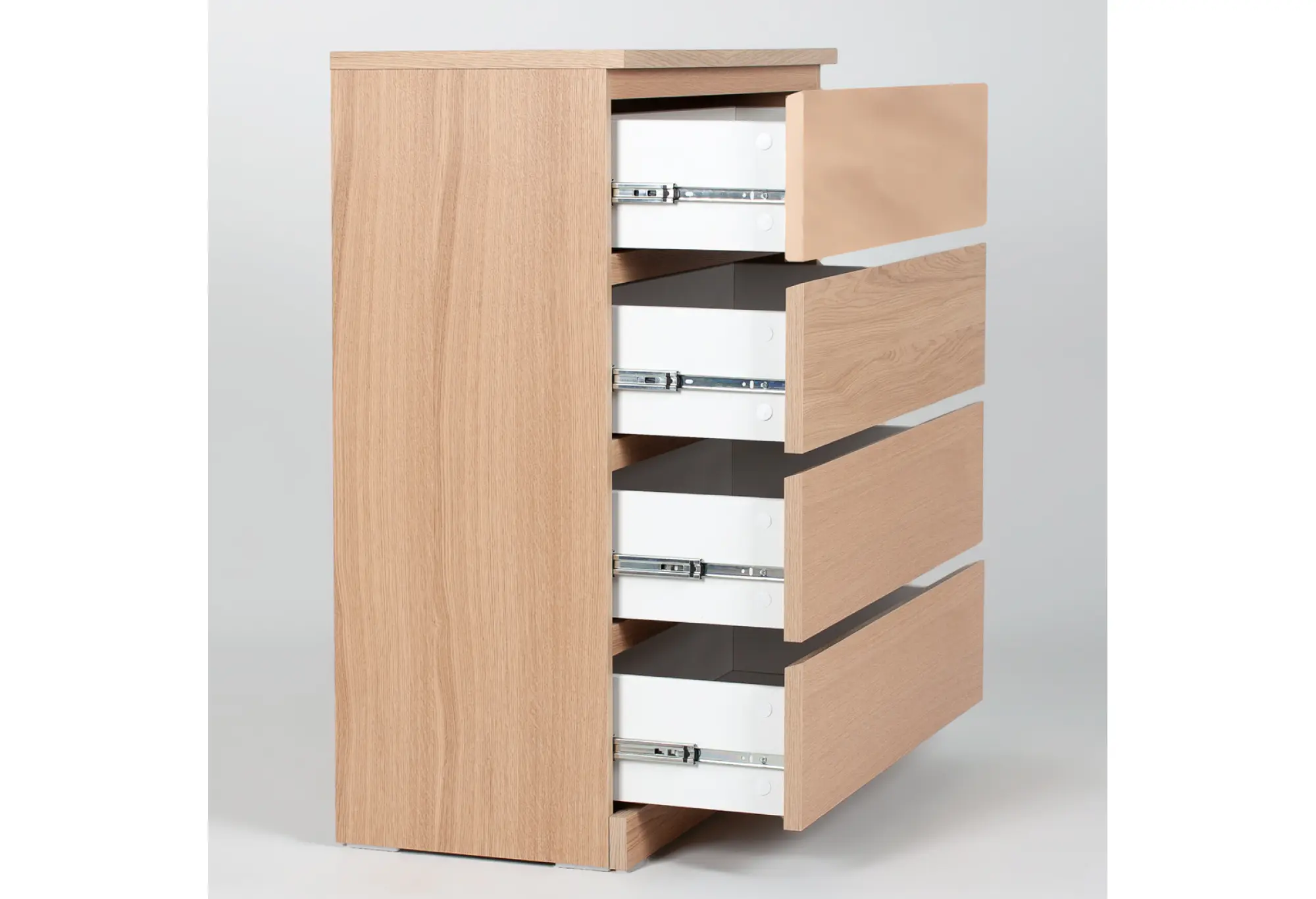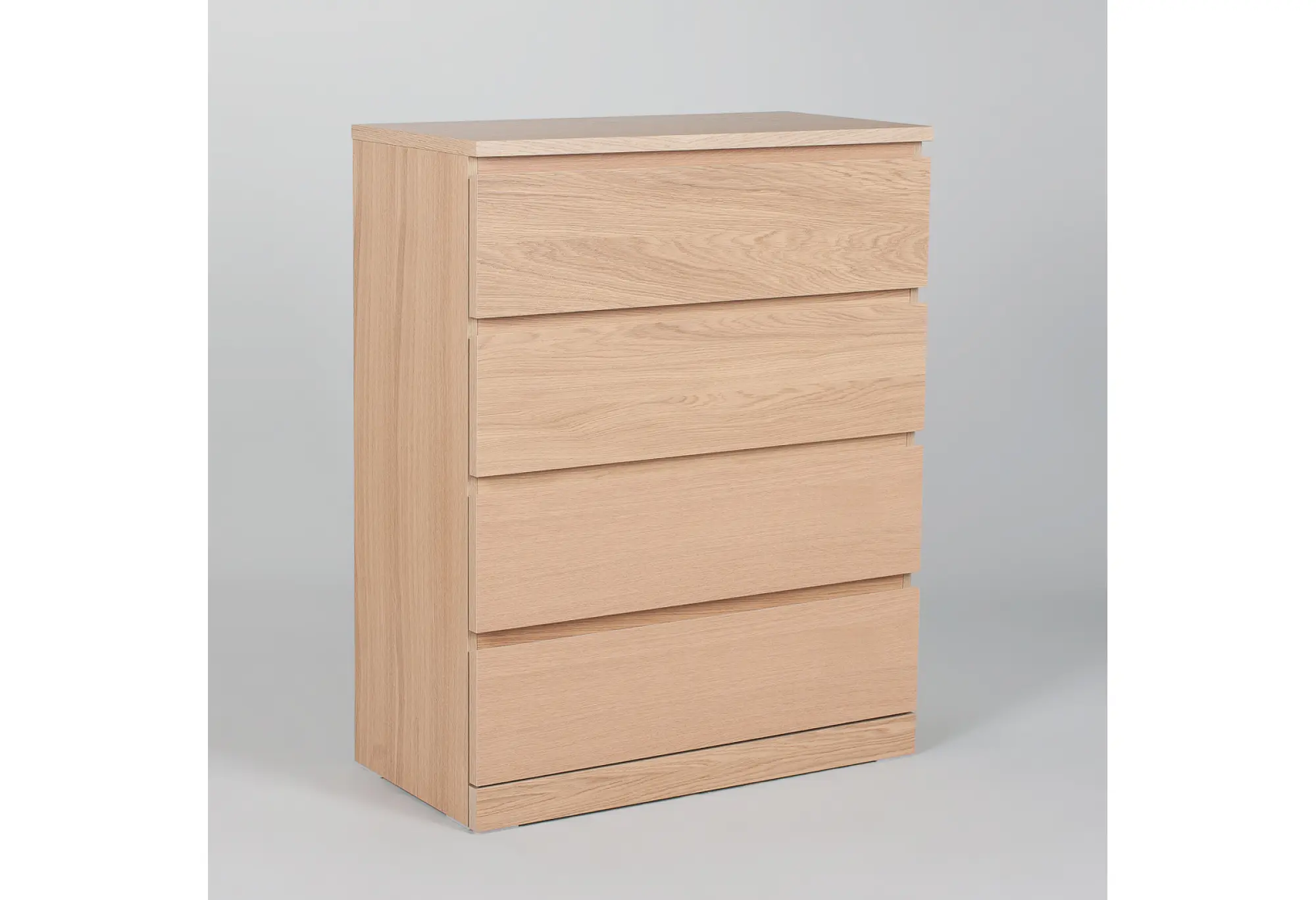 Четыре выдвижных ящика обеспечивают удобную организацию вещей - от белья и одежды до документов и аксессуаров. Ящики оснащены качественными телескопическими направляющими, благодаря которым они выдвигаются плавно и полностью, открывая доступ к содержимому по всей глубине. Оптимальные габариты позволяют разместить комод даже в небольших комнатах, сохранив при этом достаточную вместительность.